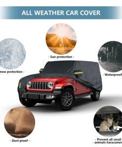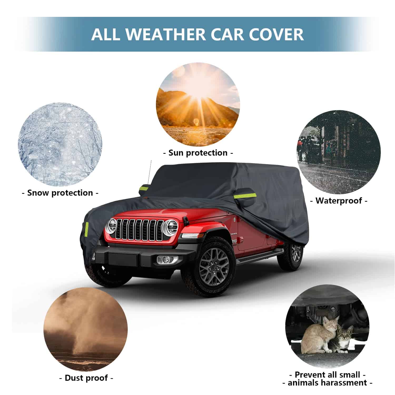 Además de su resistencia al agua, la cubierta también está diseñada para resistir el viento, con una cuerda ajustable que evita que sea arrastrada por fuertes vientos. Las 6 tiras reflectantes mejoran la visibilidad en condiciones de poca luz y actúan como una advertencia para los peatones. Las cremalleras estratégicamente ubicadas en el lado del conductor permiten un fácil acceso al vehículo sin tener que quitar toda la cubierta.