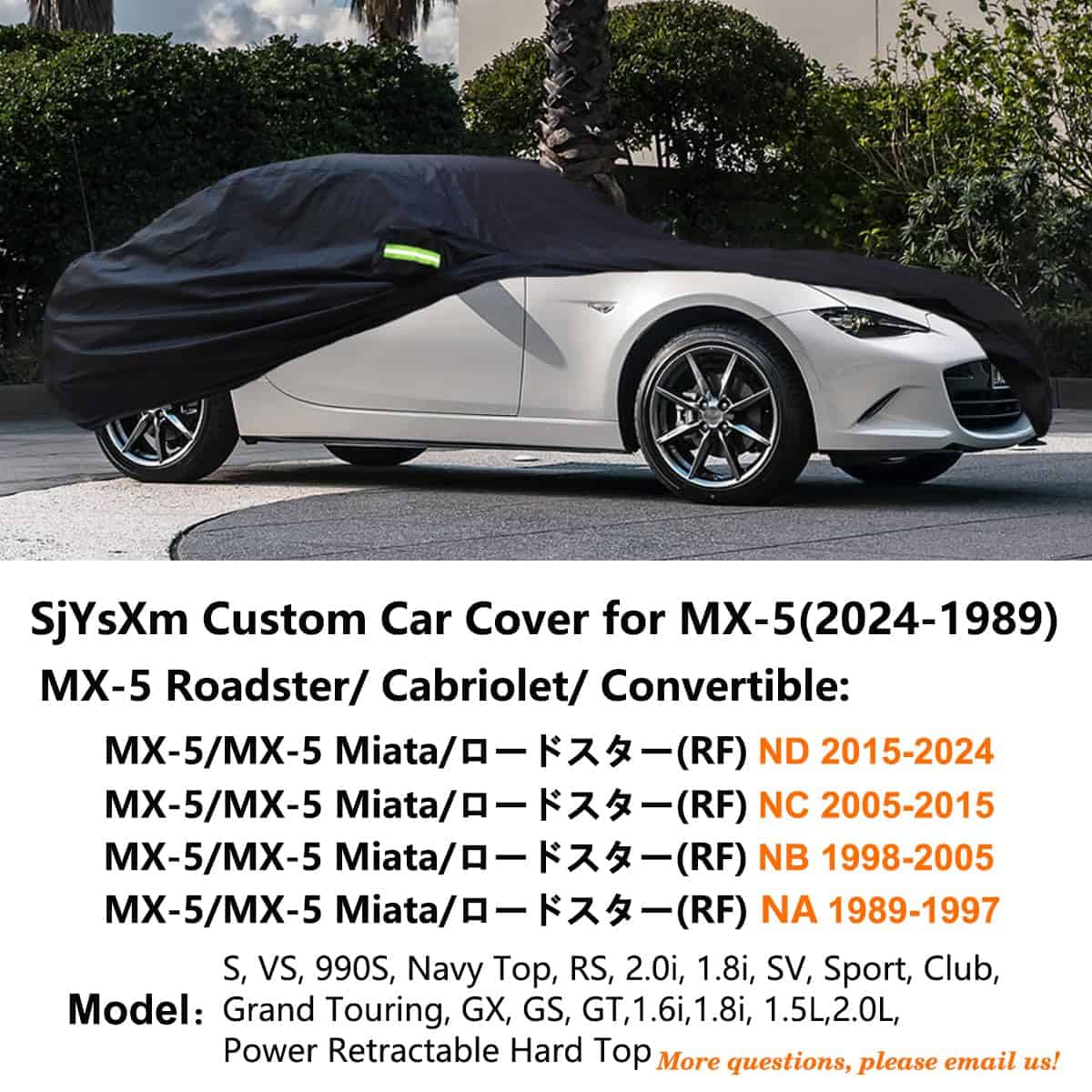 Cubierta de coche a medida SjYsXm compatible con Mazda MX-5 Miata ND NC NB NA 2025-1998. Fabricada con tela impermeable transpirable en el exterior y revestimiento plateado en el interior, esta cubierta puede utilizarse en ambos lados y proporciona protección durante todo el año. Cuenta con bandas elásticas cosidas (en la parte delantera y trasera de la cubierta) para un ajuste ceñido y para mantener la cubierta en su lugar; bolsa incluida para almacenamiento ordenado y compacto. Dispone de bolsillos para los espejos para una cobertura óptima; ideal para uso en interiores y exteriores. Cuenta con 6 tiras reflectantes para una visibilidad y notoriedad claras, lo que mejora enormemente la seguridad al estacionar en la calle por la noche; 4 correas de sujeción con proceso de enrutamiento encriptado aseguran una colocación extra segura, incluso en días ventosos; el alambre reforzado ubicado en el centro de la parte inferior del coche protege la resistencia al viento de la cubierta; el dobladillo elástico alrededor de la parte delantera y trasera para un ajuste ceñido; fácil de poner y quitar. Las cubiertas de coche SjYsXm ofrecen protección todo tiempo en interiores y exteriores. Ya sea en invierno o verano, o soleado o lluvioso, las cubiertas SjYsXm para todas las estaciones se esforzarán al máximo para enfrentar el desafío. Son excelentes para proteger sus automóviles del polvo, la nieve, los excrementos de pájaros, las hojas, etc. ¡Realmente es una buena elección, como un garaje cuidadoso, una sombrilla de coche y unos guantes de coche! La lona para coche exterior completa de SjYsXm no defraudará su sincera confianza y elección. SjYsXm espera sinceramente que a través de nuestros esfuerzos incansables, podamos proteger las cosas de automóviles que le importan. Por favor, revise el modelo de coche antes de elegir las lonas para coche. ¡Nada a medias, le ayudaremos a resolver el problema, incluso antes de realizar el pedido! Y respaldamos nuestros productos y servicios e intentamos siempre brindarle la satisfacción cómoda. Las Cubiertas Exteriores Completas de SjYsXm siempre estarán a su alrededor. ¡Gracias!