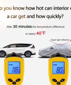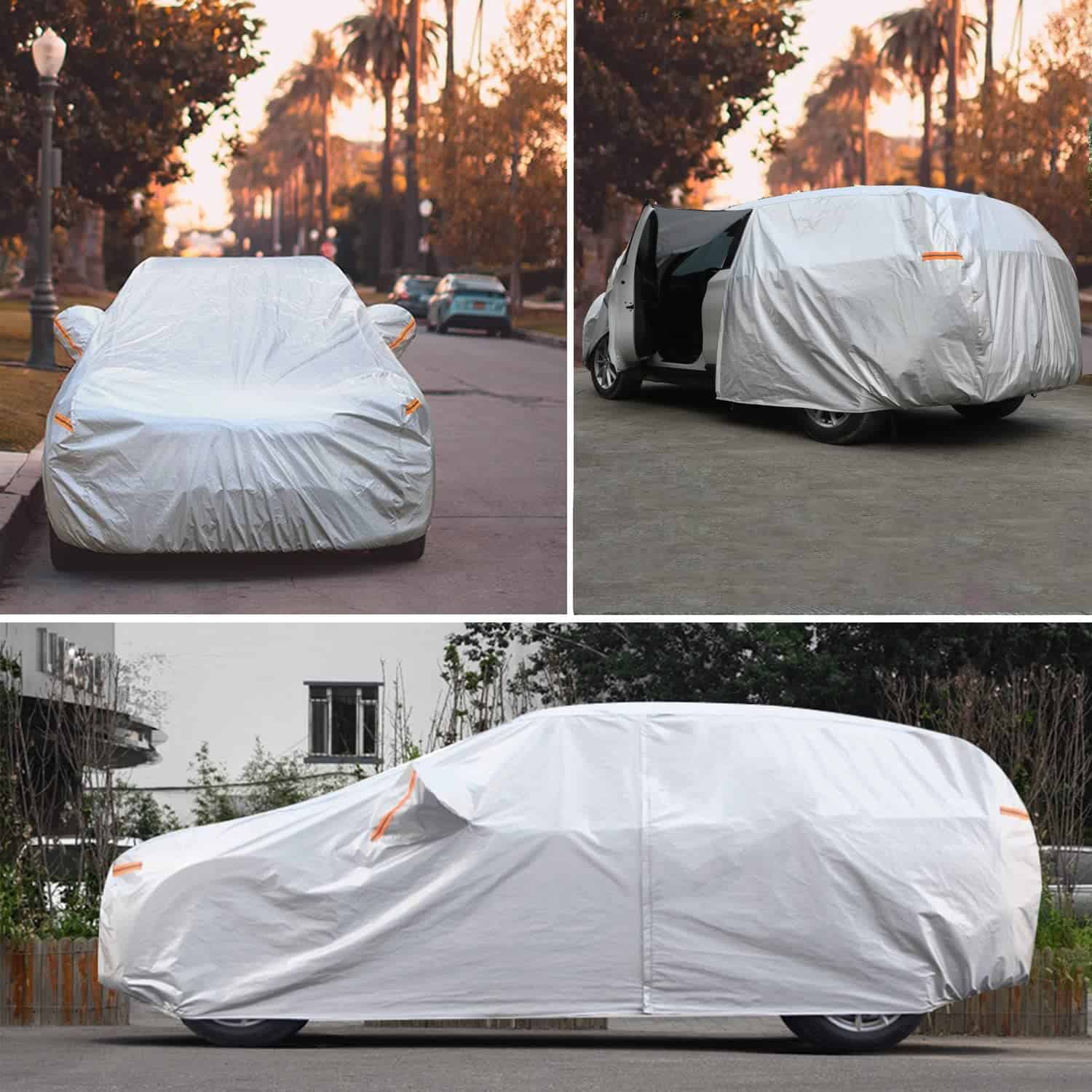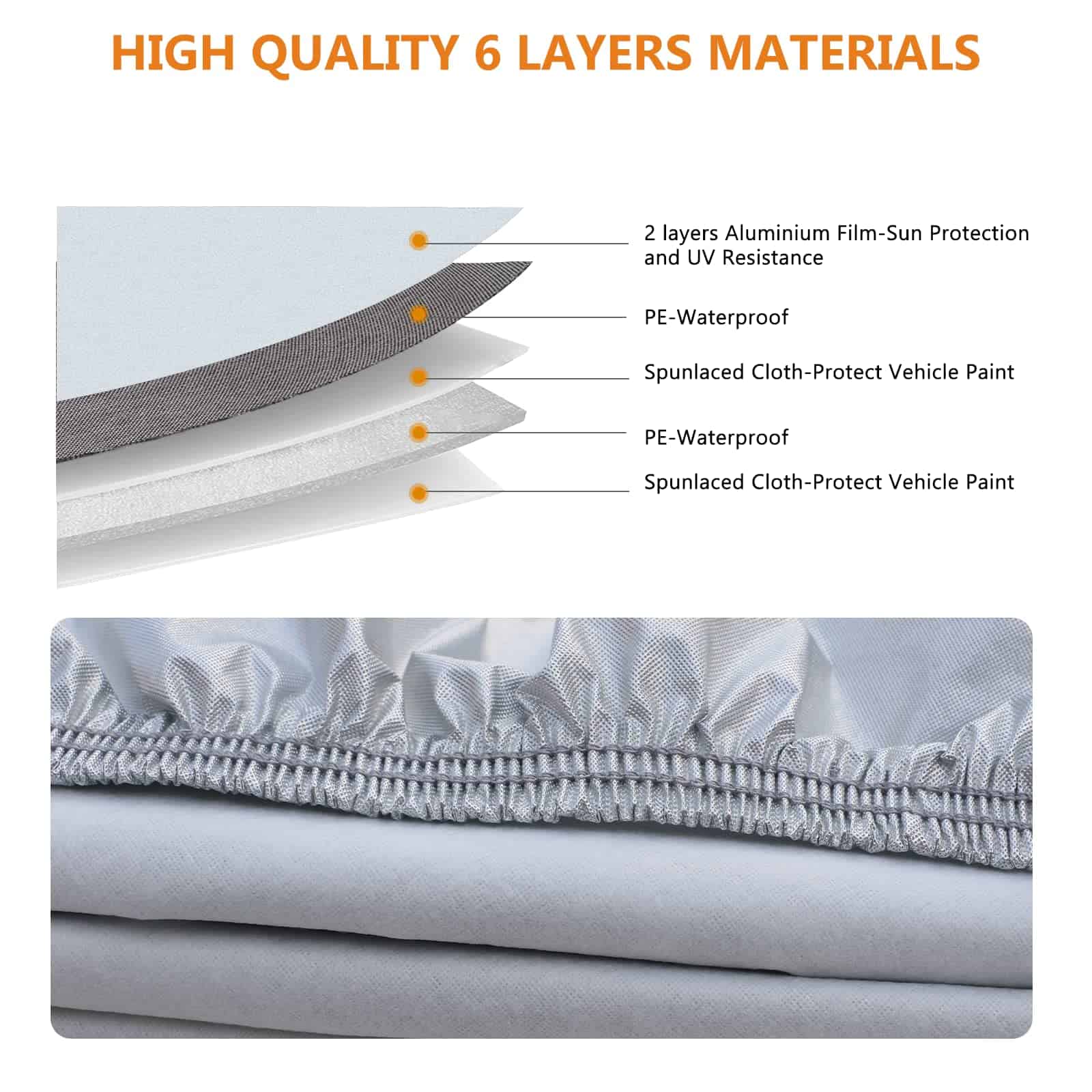 2. Material Duradero de 6 Capas SEAZEN cubierta exterior completa hecha de 6 capas de tela: 2 capas de aluminio y 2 capas de PE y 2 capas de tela no tejida. El aluminio altamente reflectante es bueno para proteger contra el sol y los rayos UV, la reflectividad puede superar el 90%, la diferencia de temperatura entre el interior y el exterior del coche puede llegar hasta 40 , mantiene el coche fresco en el verano; el PE es 100% Impermeable, es excelente para proteger contra la lluvia y la nieve; la tela no tejida es más gruesa y suave, puede proteger mejor la pintura de su vehículo.