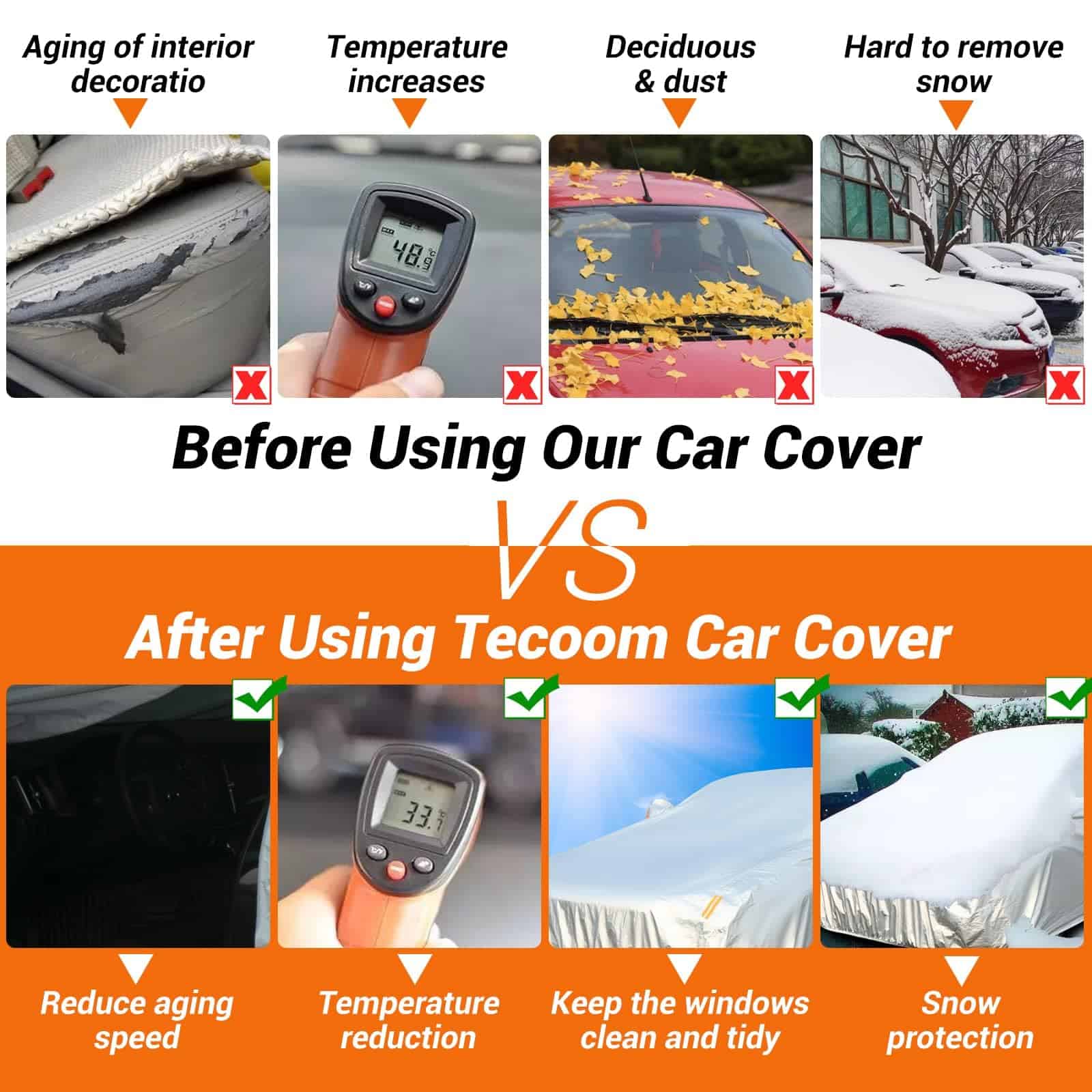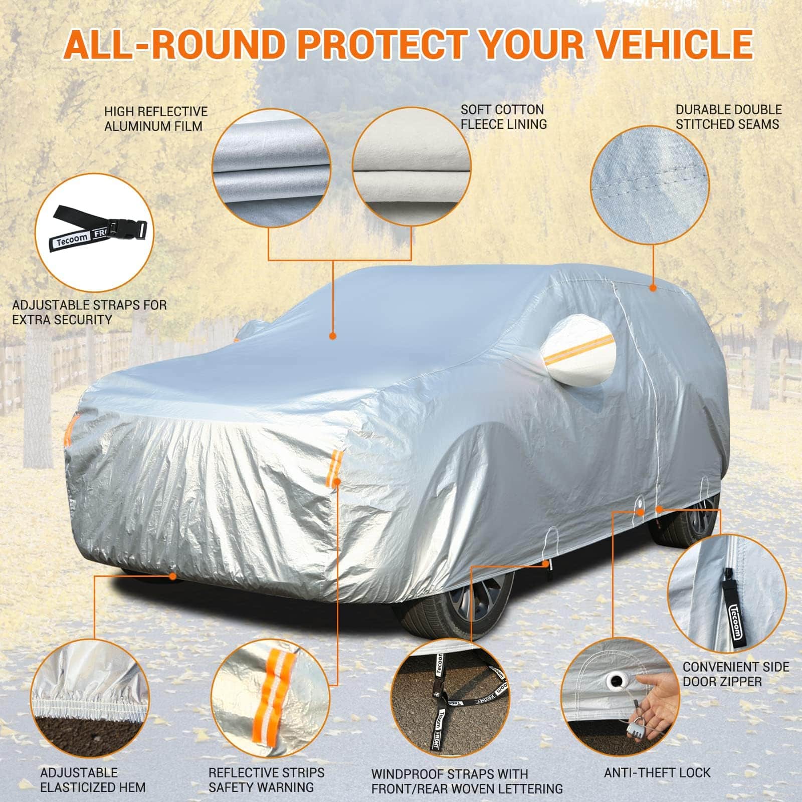 1. Tamaño de la Cubierta: YXXLP universal se ajusta para autos con una longitud de 216″-230″. Por favor, verifique los detalles del vehículo antes de ordenar – SUV o Sedán Hatchback o Camioneta Pickup Regular/Extendida/Doble Cabina, Fecha de Fabricación, Longitud del Vehículo. Encuentre su vehículo en la tabla de tallas (ver imagen 6 tabla de tallas). 2. Diseño Único: CIERRE DE PUERTA DE CONDUCTOR PARA FÁCIL ACCESO. Las correas y hebillas ajustables delanteras/posteriores protegen su cubierta de coche para exteriores de ser arrastrada en días ventosos. Candado antirrobo gratuito para seguridad, el dobladillo elástico mantiene la cubierta de SUV en su lugar, 6 líneas reflectantes de advertencia para garantizar un estacionamiento seguro por la noche, 2 bolsillos para espejos. 3. Material Mejorado de 3 Capas: La cubierta de coche universal Tecoom está hecha de tela tafetán de poliéster de alta densidad 190T con costuras dobles precisas para mayor durabilidad. El espeso forro de lana de algodón suave protege la pintura del vehículo. El aluminio reflectante de alta protege que su coche se mantenga fresco y resistente a la decoloración, buena protección solar y resistencia a los rayos UV. PE&PEVA 100% impermeable, protege el coche en días lluviosos y nevados. 4. Cubierta de Coche para Todas las Estaciones: La cubierta exterior completa para todo clima le brinda protección en todas las estaciones, como un garaje móvil. Use la cubierta de SUV para proteger su vehículo del sol, la lluvia, la arena, el polvo, los arañazos, las hojas, la nieve, la escarcha y los pájaros. El accesorio perfecto tanto para exteriores como para interiores. 5. Garantía de Calidad: 1. Equipado con una bolsa de almacenamiento, la cubierta se puede doblar y transportar fácilmente en el maletero. 2. Por favor, limpie la superficie del coche antes de usar. 3. Tecoom ofrece garantía de 12 meses. Si el producto que recibió está dañado o sucio u otros problemas, contáctenos a tiempo, responderemos con sinceridad