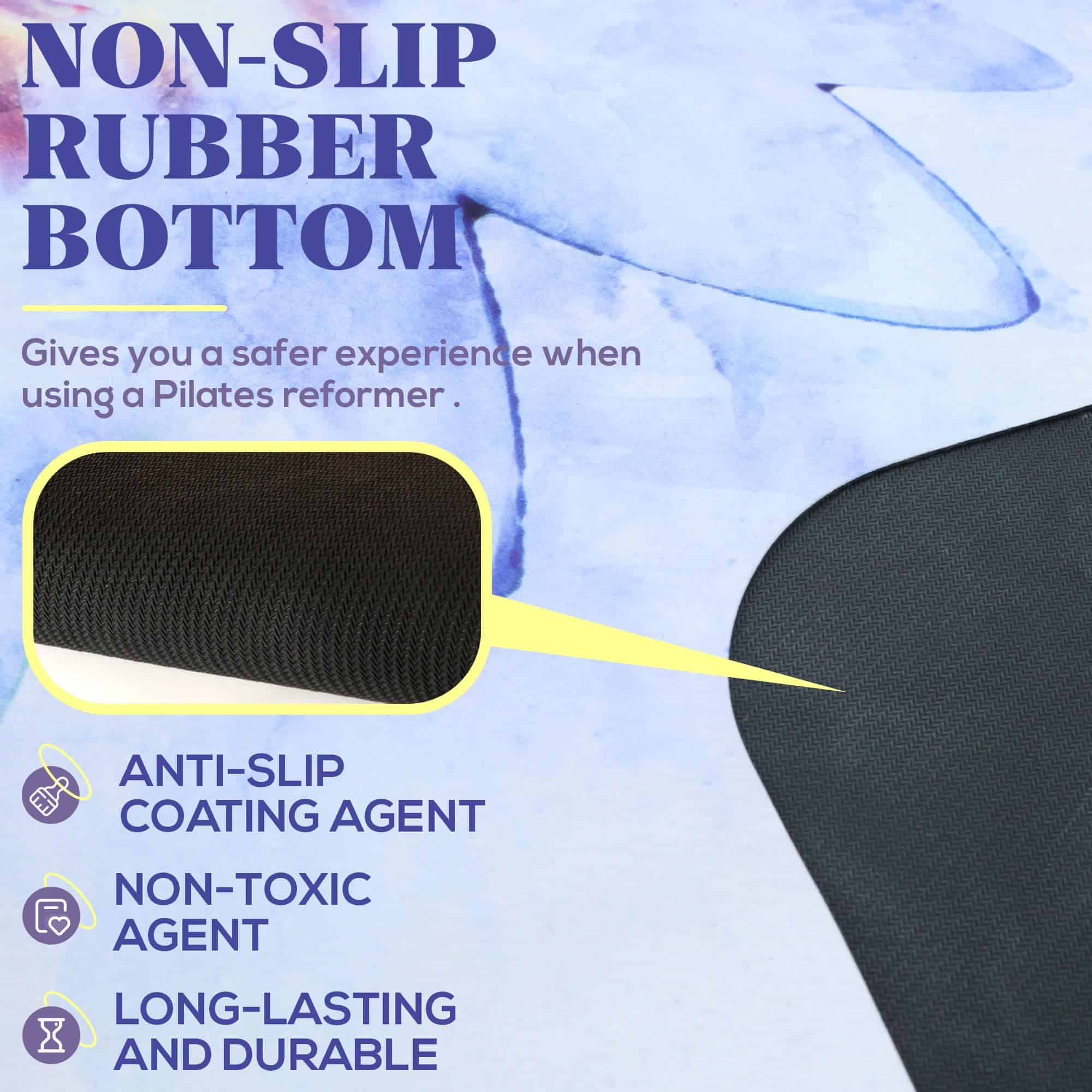 3. FONDO DE GOMA ANTIDESLIZANTE: El fondo de nuestra colchoneta de Pilates para reformer está cubierto por una capa de recubrimiento antideslizante, la cual es duradera, no tóxica e invisible. El agente de recubrimiento antideslizante aumenta el agarre entre la colchoneta de Pilates reformer y la superficie, brindándote una experiencia más segura al usar un Pilates reformer en casa o en el gimnasio.