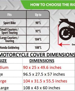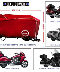 1. TAMAÑO; XXL – (GOLDWING) Se adapta hasta 108 pulgadas de longitud y 60 pulgadas de alto – Se ajusta a Honda GL 1800 Goldwing, Victory Vision Tour, Victory Cross Country Tour.