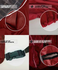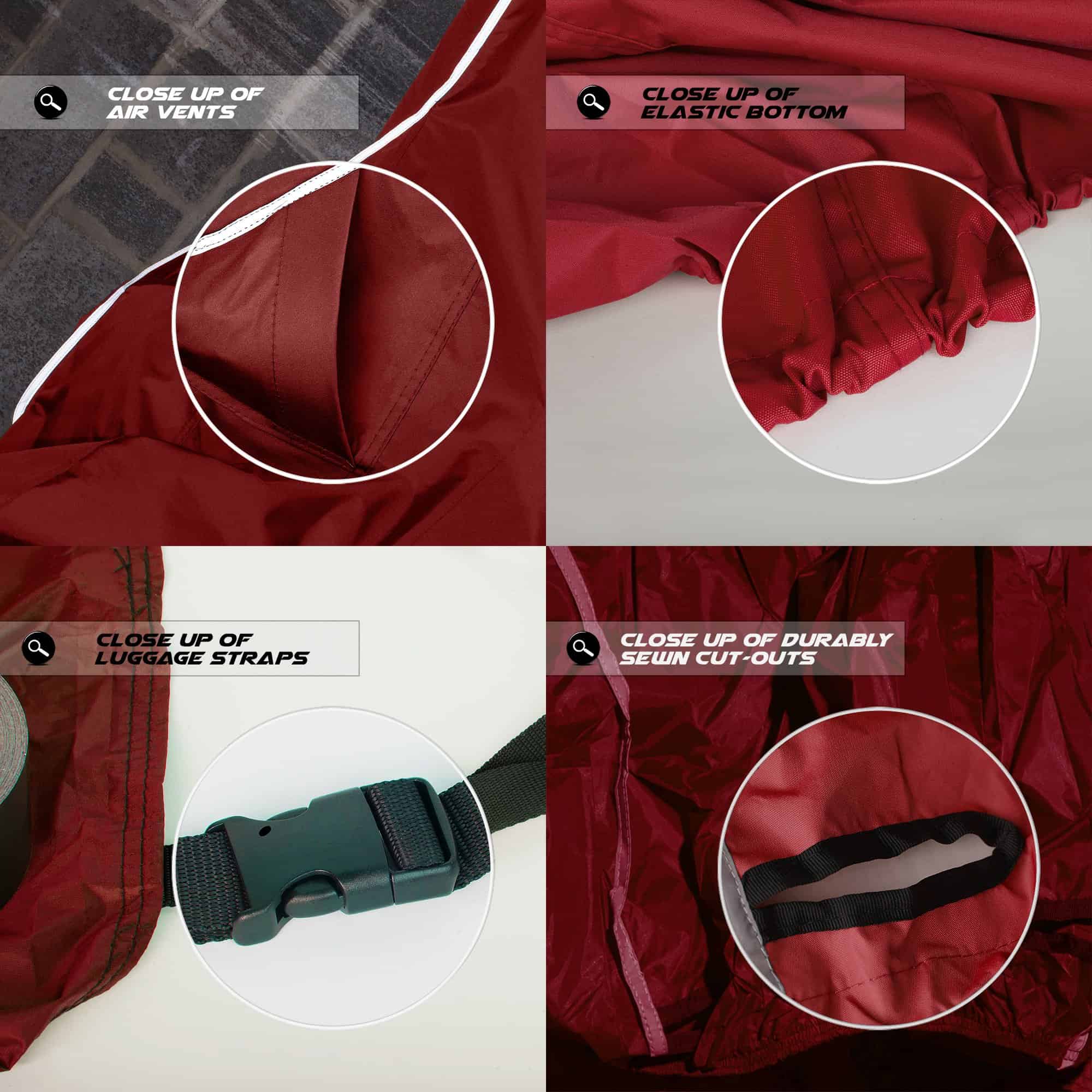 3. FONDO ELÁSTICO RESISTENTE Y CORREA PARA EQUIPAJE, para una calce extremadamente ajustado y asegurarte de que tu cubierta impermeable para motocicleta permanezca cubierta durante fuertes vientos. PROTECTOR TÉRMICO INTERNO – evita quemaduras y derretimientos de la cubierta debido a los TUBOS CALIENTES. Tu cubierta para motocicleta tiene una CLASIFICACIÓN DE CALOR DE 150 GRADOS.