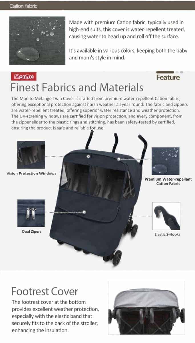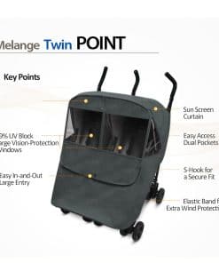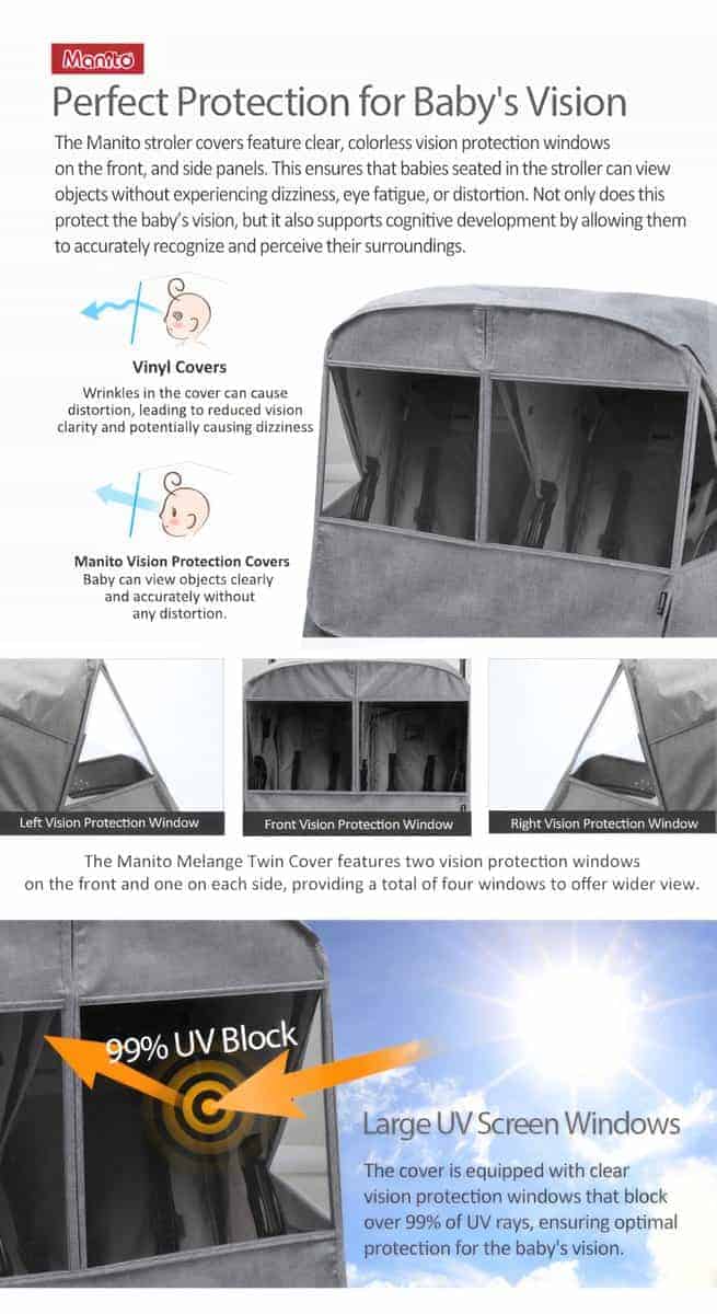La Cubierta de Protección para Carriola Gemelar Manito Melange está diseñada para adaptarse a la mayoría de las carriolas gemelares lado a lado. Algunos mecanismos de plegado de las carriolas permiten plegarse sin necesidad de quitar la cubierta. Cuenta con ventanas ópticas planas grandes y claras en tres lados que filtran el 99% de los rayos UV, ofreciendo una visión libre de distorsiones para promover un desarrollo visual saludable en los bebés. A diferencia de las cubiertas de vinilo que pueden causar mareos o fatiga visual debido a la distorsión, estas ventanas permanecen perfectamente planas. (Nota: Los films de protección deben retirarse de ambos lados de las ventanas, uno dentro y otro fuera en cada ventana antes de su uso para una claridad óptima). La cortina de protección solar fácil de bajar y subir ofrece protección adicional contra la luz solar directa, manteniendo al bebé cómodo dentro de la carriola. Los sistemas de ventilación dual en ambos lados garantizan una circulación de aire óptima para mayor comodidad. La tela Melange repelente al agua y resistente al viento protege de la lluvia, nieve, polvo y viento. La puerta de entrada con cremallera bidireccional grande permite un acceso fácil dentro y fuera de la carriola. El diseño conveniente de inserción de asa y clip inferior facilitan la instalación de forma rápida y segura. Dos bolsillos de conveniencia adyacentes en la parte trasera e incluye una bolsa portátil para un almacenamiento y transporte fácil. Se puede limpiar fácilmente con un paño húmedo o una toalla de papel. Hecho en Corea.