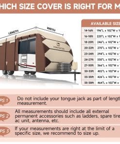 4. A Prueba de Viento y Kit de Accesorios Completo Nuestra cubierta de RV de tela Oxford viene con una variedad de accesorios prácticos. Incluye correas a prueba de viento para sujetar firmemente la cubierta alrededor del cuerpo del RV, evitando que se vuele o se rompa. Además, proporcionamos 6 cubiertas de canalón con esponjas para evitar rayones durante la instalación. Recomendamos cubrir o poner almohadillas en los bordes afilados con una toalla, paño o almohadilla de espuma para evitar daños en la cubierta.