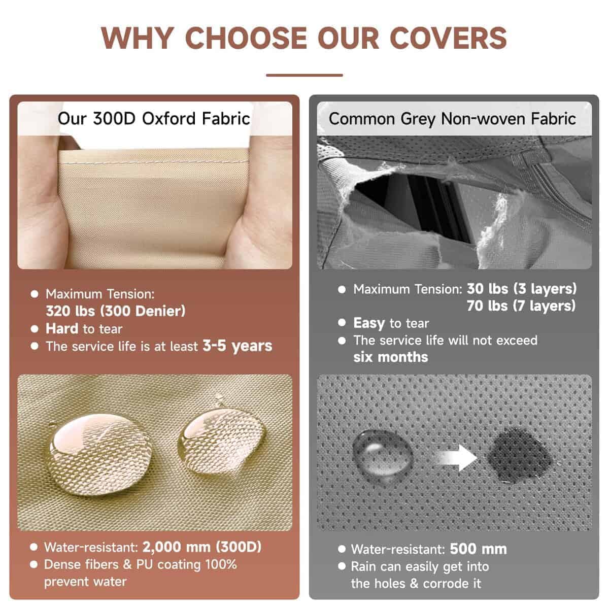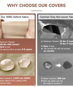 1. Tela Oxford en lugar de Tela no Tejida A diferencia de las cubiertas de RV de tela no tejida ordinarias, la marca Vinpatio elige la tela Oxford de alta calidad de 300D como material. En comparación, nuestra tela Oxford de 300D ofrece una tensión máxima de 320 libras, superando las 70 libras de la tela no tejida de 7 capas. Con nuestra cubierta de RV de tela Oxford, experimentará una resistencia superior a la tensión y al desgarro. Nuestra cubierta de RV de tela Oxford tiene una vida útil al menos 2-4 veces más larga que las cubiertas de tela no tejida.