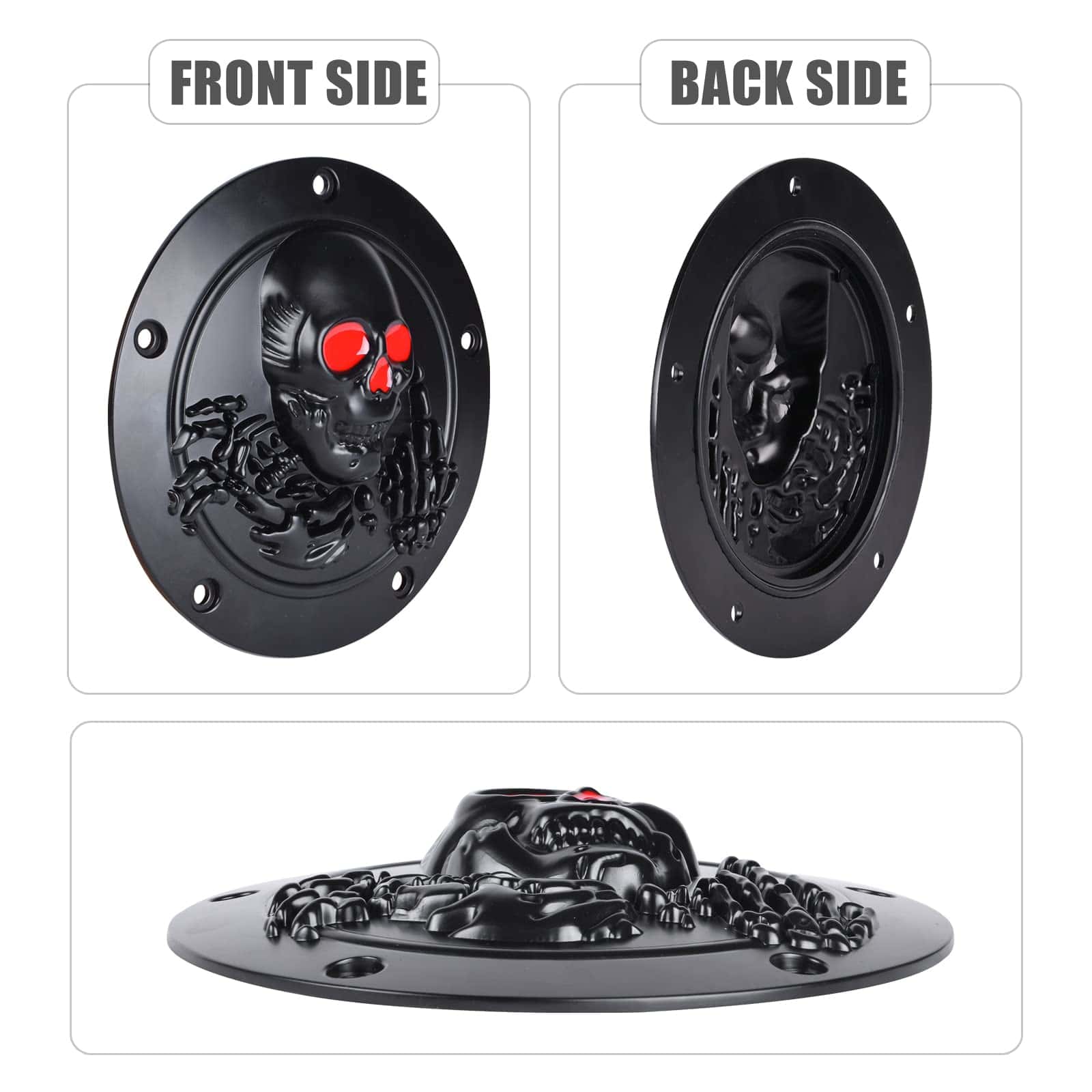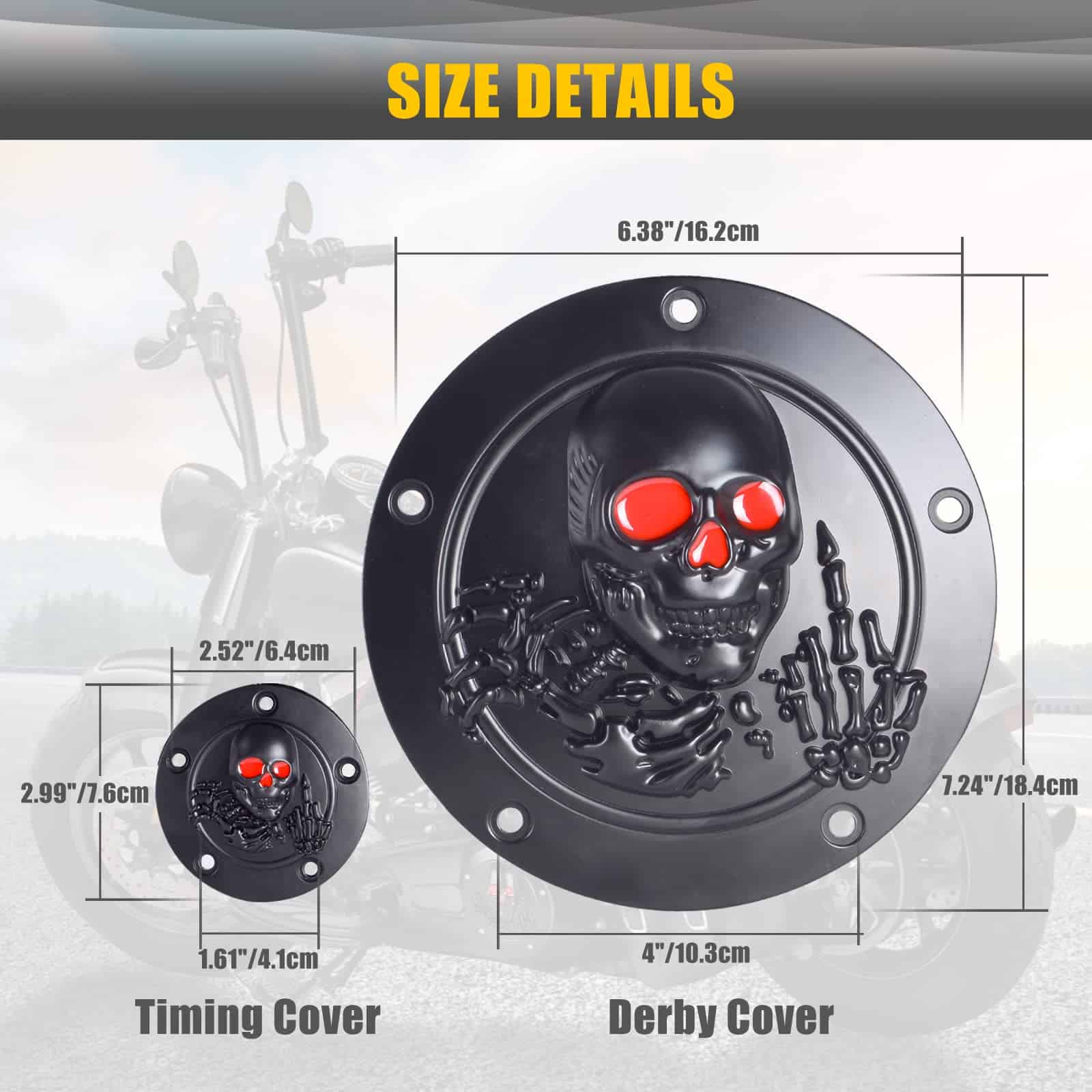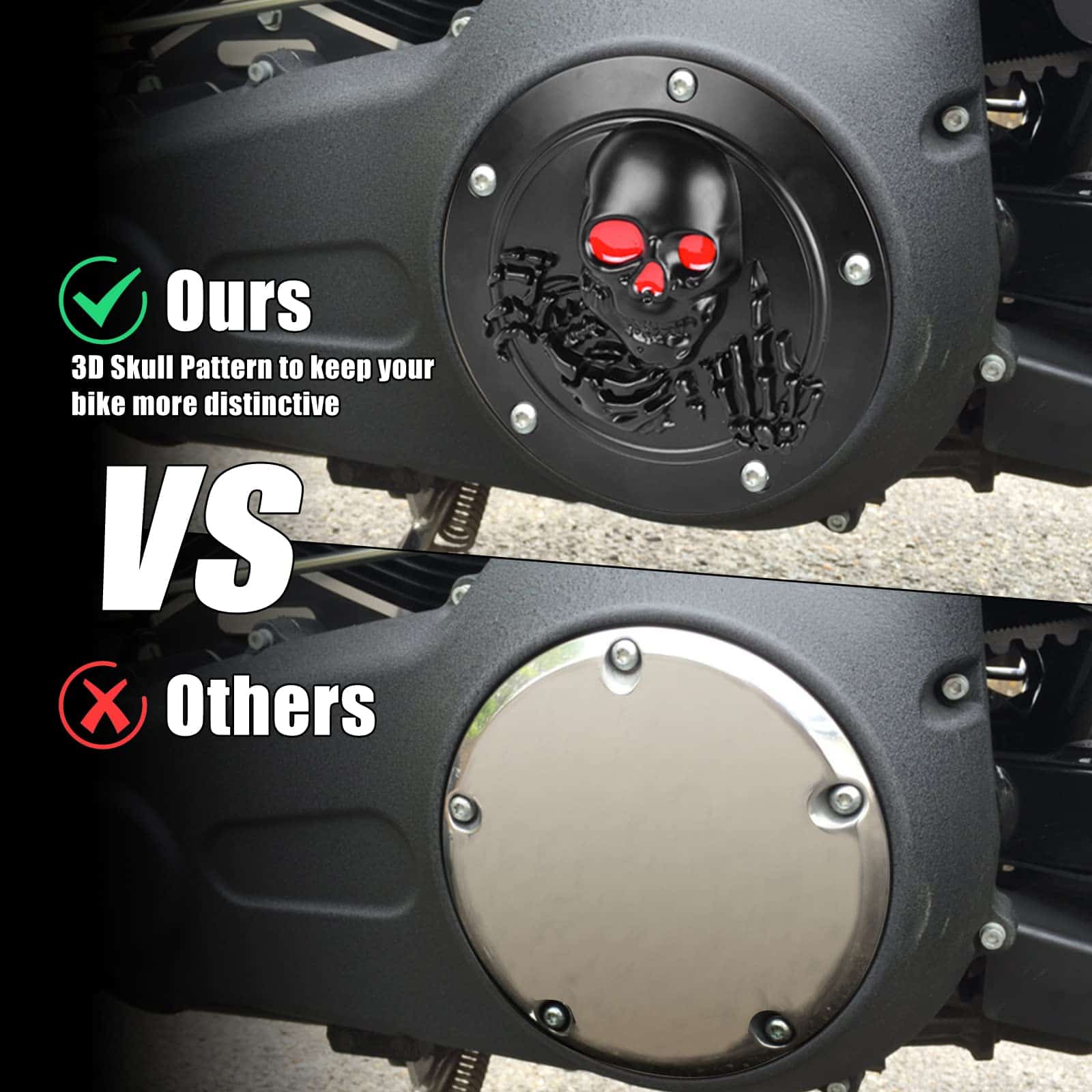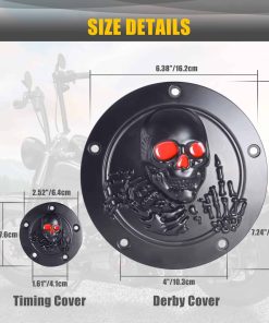 Cubierta de temporizador y puntos derby de calavera 3D con 5 orificios para Harley 1999-2014 Big Twin Cam EVO Touring Road King Electra Glide FLHR FLHX FXST Dyna. Diámetro de la cubierta del temporizador: 7.2, diámetro de la cubierta de puntos: 2.9. Perfecto para modelos Twin Cam con patrón de pernos de 5 orificios. Protege el funcionamiento del embrague de tu motocicleta de polvo y suciedad. Fácil de instalar en 5 minutos sin modificaciones.