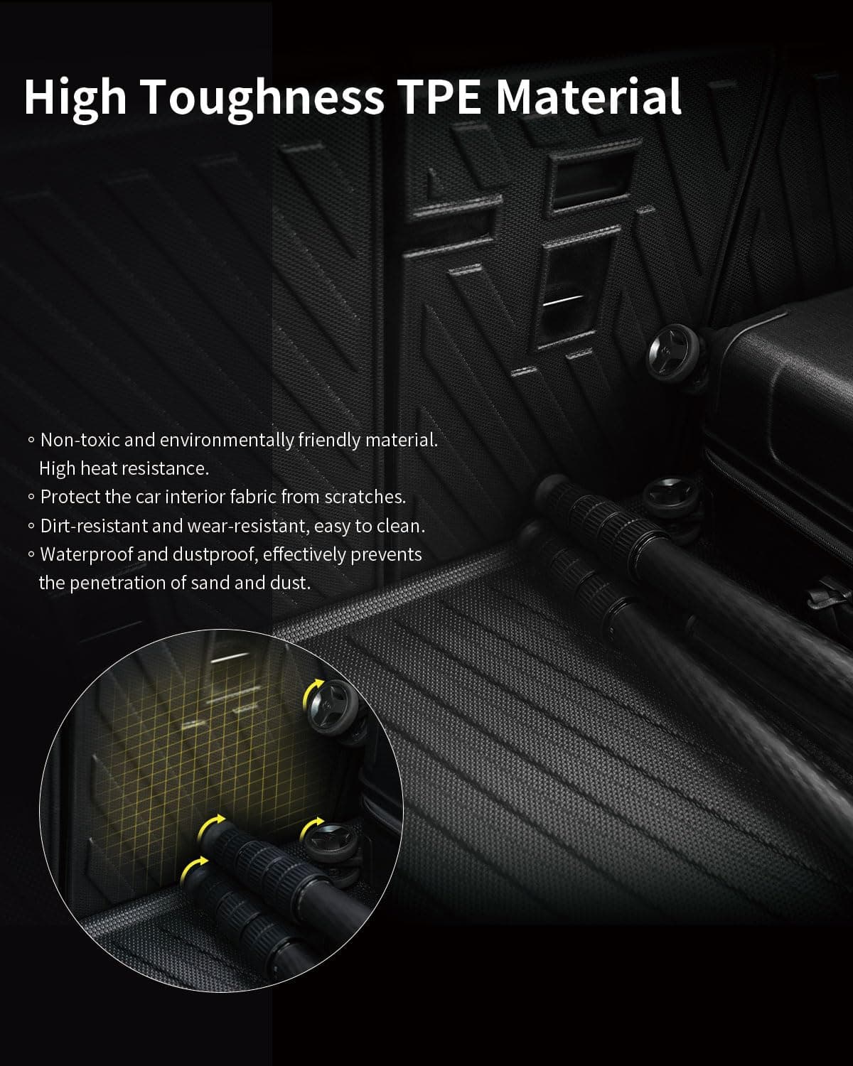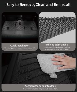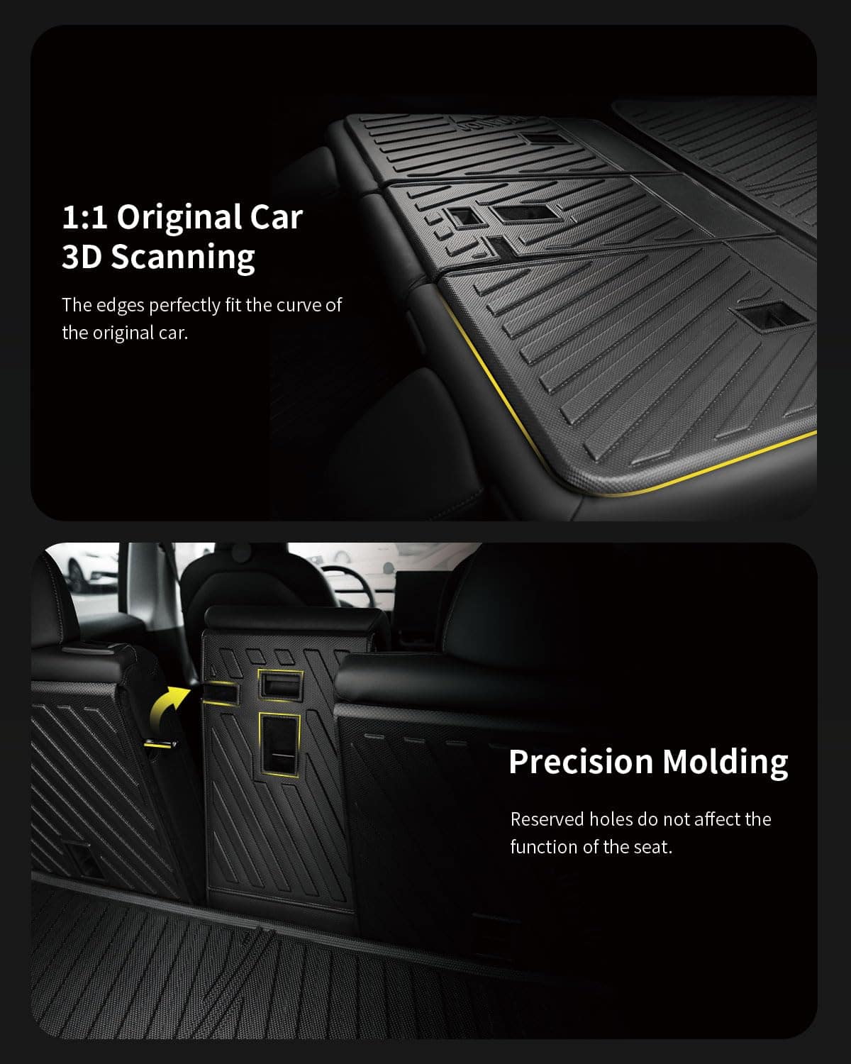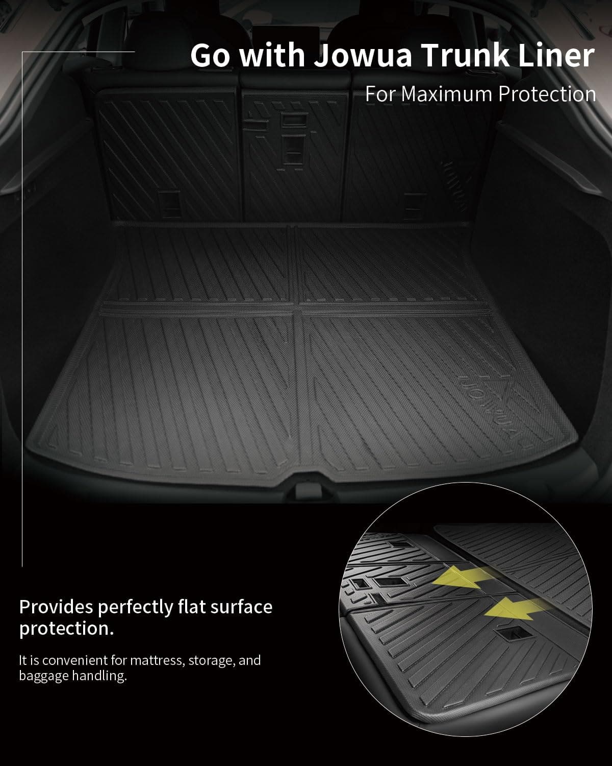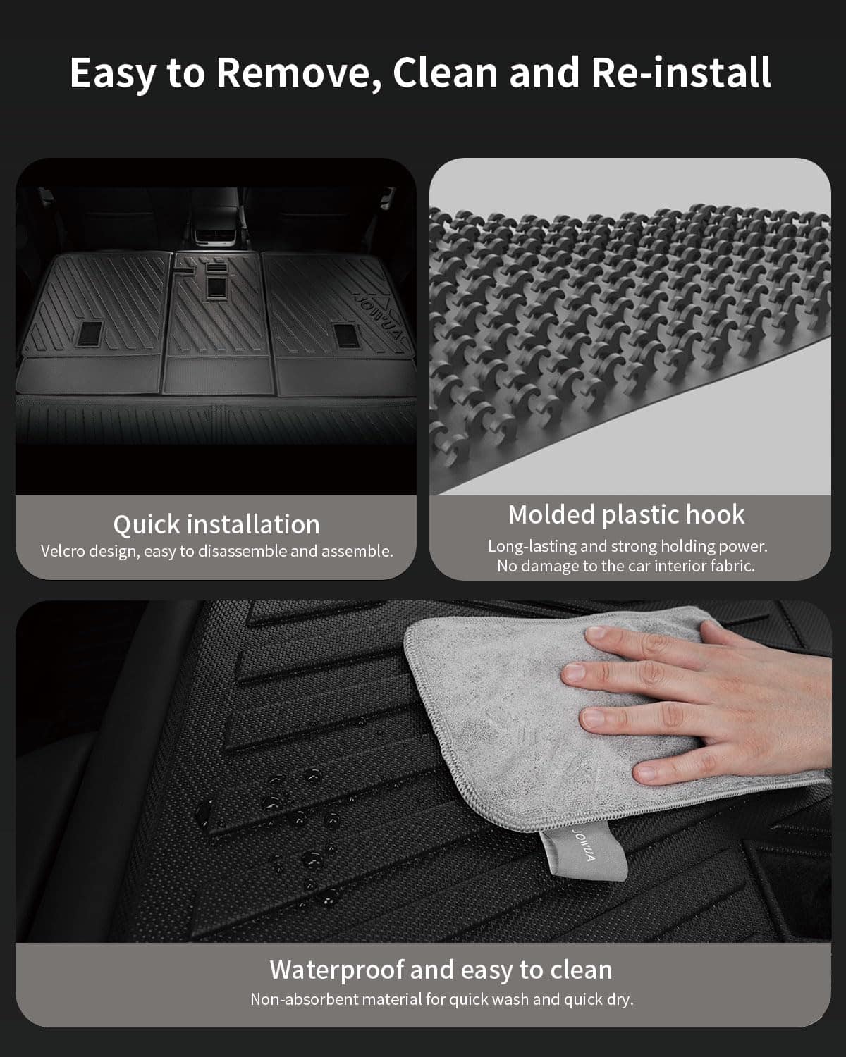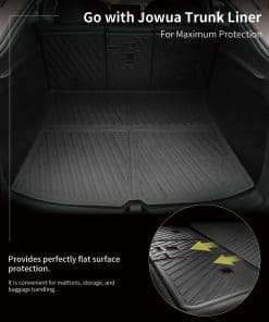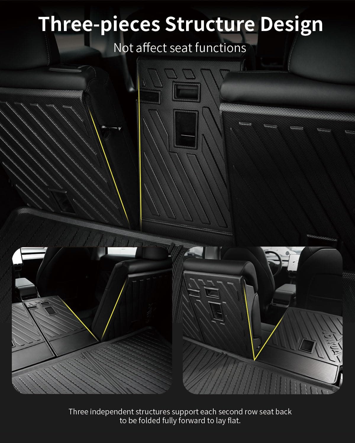 Diseñado para adaptarse a todos los asientos traseros de Tesla Model Y. Material TPE resistente al agua y al polvo. Diseño de tres piezas que permite plegar totalmente hacia adelante cada respaldo del asiento trasero. Gancho de plástico moldeado duradero. Fácil de limpiar y compatible con el Forro de Maletero Jowua. Proporciona protección perfecta para la superficie cuando se coloca plana. Conveniente para colchones, almacenamiento y manipulación de equipaje.