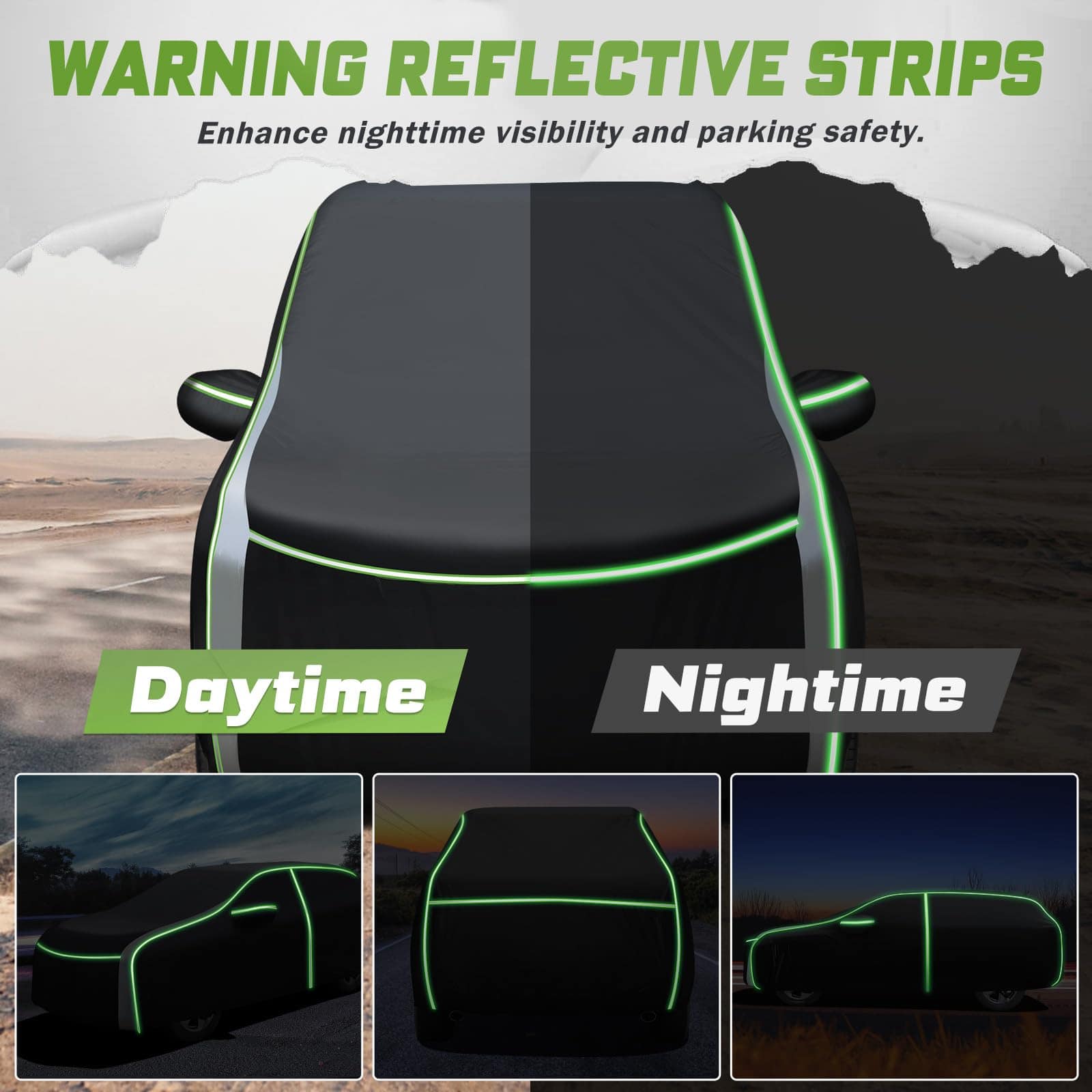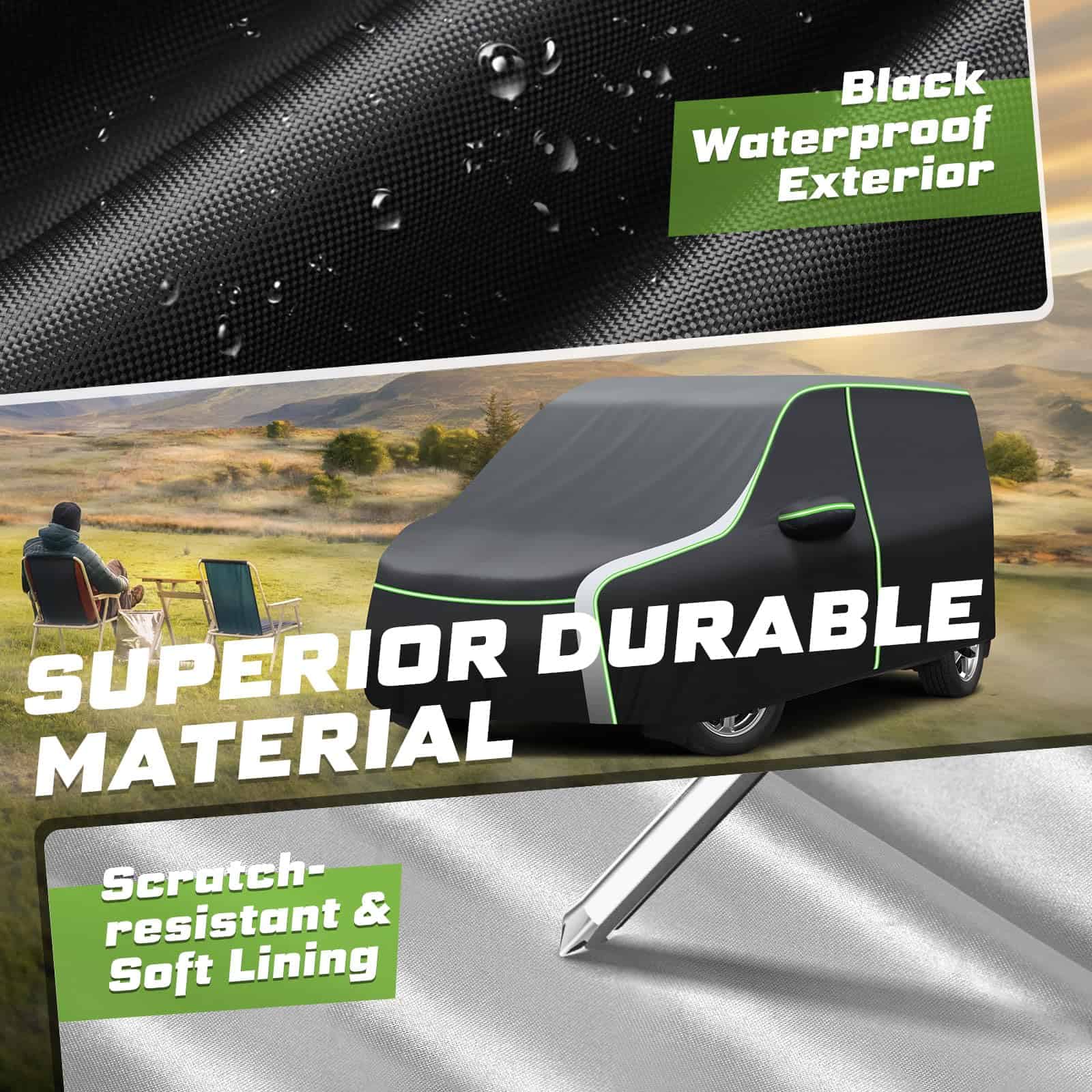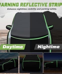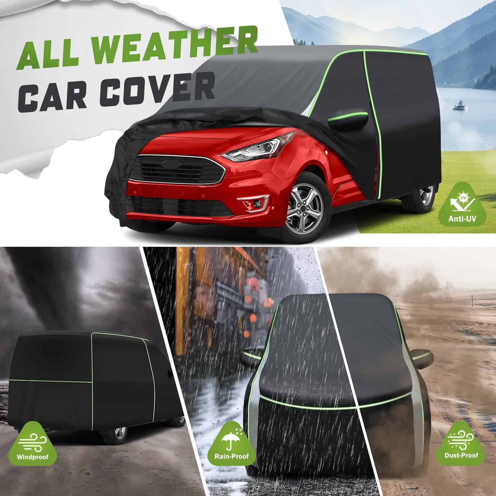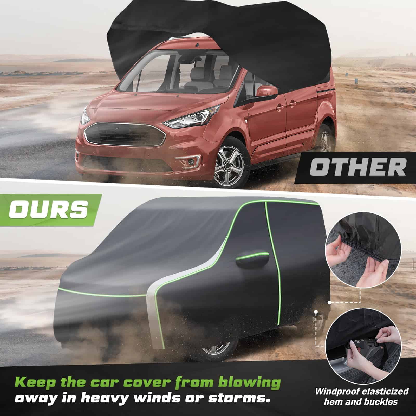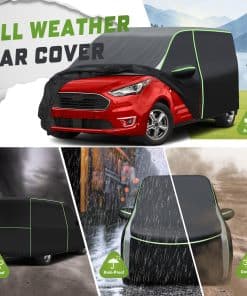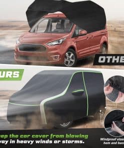 Cubierta para auto para Ford Transit Connect: Las tiras reflectantes en la cubierta para auto para Ford Transit Connect mejoran la visibilidad nocturna y la seguridad al estacionar. Cremalleras en la puerta del lado del conductor para un acceso fácil y rápido al interior. El dobladillo elástico a prueba de viento y 4 hebillas aseguradas en las ruedas evitan que la cubierta para auto se vuele en días ventosos. Construida con poliéster avanzado 240T, superficie exterior negra y respaldo con recubrimiento plateado, nuestra cubierta para auto para Ford Transit Connect cuenta con una durabilidad excepcional, resistencia al desgaste y resistencia a las rasgaduras. Esta propiedad resistente a los rayos UV protege la pintura, el interior y el tablero de su automóvil contra el decoloramiento, las grietas y otros daños causados por el sol. La cubierta para auto completa es a prueba de agua durante todo tipo de clima, lo que la convierte en un testimonio de su diseño excepcional. La cubierta para auto para Ford Transit Connect protege su automóvil de los efectos dañinos de los elementos climáticos como la lluvia, la nieve, el granizo y la luz solar intensa. Evita que el agua se filtre en el automóvil y provoque óxido, moho u otros daños. La cubierta interior de nuestra cubierta para auto, hecha de poliéster suave, proporciona un toque suave a la pintura de su vehículo. Instalación sin arañazos: Diga adiós a las preocupaciones sobre arañazos, abrasiones o daños causados por el contacto con la cubierta para auto. Fácil de instalar y guardar esta cubierta para auto con la bolsa proporcionada.