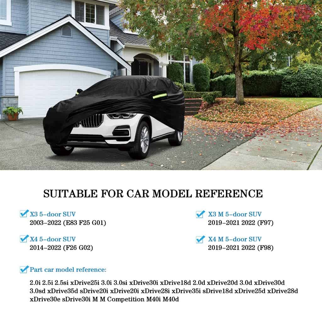 Cubierta para automóvil Abdeck compatible con BMW X3 (2003-2025) X4 (2014-2025), cubierta para automóvil impermeable para todo clima interior exterior cubiertas completas para lluvia nieve polvo protección solar. Dimensiones: Cubierta para automóvil exterior completa Abdeck Compatible con BMW X3 SUV (E83 F25 G01 2003-2025)/ X3 M SUV (F97 2019-2025)/ X4 SUV (F26 G02 2014-2025)/ X4 M SUV (F98 2019-2025). Material: Hecho de poliéster Oxford transpirable y resistente a las roturas en el exterior; capa de revestimiento plateado más capa impermeable en el interior; por lo tanto, las cubiertas para automóviles Abdeck se pueden utilizar en ambos lados. Diseño: Las 6 tiras reflectantes fluorescentes adornan la lona del coche para proteger su automóvil contra otro vehículo que choque contra él por la noche; las 4 correas a prueba de viento debajo del coche y el dobladillo elástico ajustable en la parte delantera y trasera aseguran que la cubierta del vehículo permanezca firmemente en su lugar, este ajuste ceñido también evita que se vuele en vientos fuertes; 2 bolsillos para espejos para una cobertura óptima; la artesanía de doble costura hace que la cubierta Abdeck sea más duradera en uso. Protección: La cubierta para automóvil resistente a la intemperie de Abdeck protegerá su automóvil de la lluvia, los rayos UV, la nieve, el polvo, las deposiciones de aves y las huellas de patas de gato. Nota: Por favor, verifique el modelo y el año de su automóvil antes de comprar; Las cubiertas para automóviles Abdeck se pueden utilizar tanto en interiores como en exteriores; bolsa de almacenamiento adjunta.