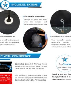 Las cubiertas para automóviles EzyShade son 100% a prueba de climas. Los materiales duraderos a prueba de clima y las costuras reforzadas de alta resistencia combinadas con la garantía de ajuste personalizado de EzyShade producen una cubierta impermeable, a prueba de viento, a prueba de nieve, a prueba de polvo, 100% protectora contra el sol y los rayos UV y resistente a los arañazos. Las cubiertas cuentan con correas delanteras, medias y traseras con hebillas clic-tight para proteger contra vientos fuertes, franjas reflectantes que brindan visibilidad nocturna, una cremallera en la puerta lateral que permite un fácil acceso al vehículo, bolsillos de espejos especialmente diseñados que se ajustan a cualquier espejo sin verse holgados, agujeros de grommets de bloqueo de cables que ofrecen protección contra robos, una generosa bolsa de almacenamiento que permite un almacenamiento fácil y un kit de protección de antena incluido en cada compra. Los clientes de EzyShade se han beneficiado durante mucho tiempo de generosas garantías de producto y un servicio al cliente líder en la industria. ¡Todos los productos EzyShade con una Tabla de Tallas de Vehículos (incluidas las cubiertas para automóviles) incluso vienen con una Garantía de Ajuste Perfecto!