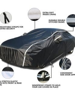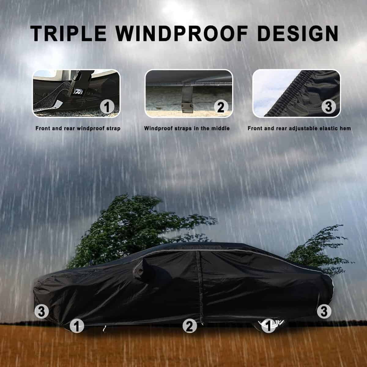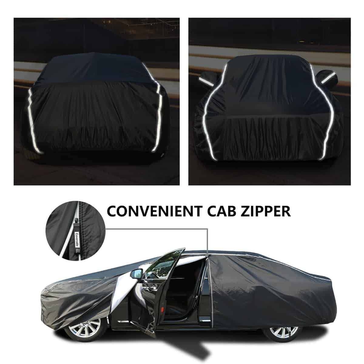 2. DISEÑO ÚNICO: 1. LA CREMALLERA DE LA PUERTA DEL CONDUCTOR en el lado izquierdo de la cubierta para un fácil acceso. 2. Las correas a prueba de viento delanteras, medias y traseras sujetan sus cubiertas para automóviles para evitar que se las lleve el viento fuerte. 3. Rayas reflectantes grandes y largas alrededor para alertar a otros por la noche. 4. Bolsillos de espejo a medida con rayas reflectantes.