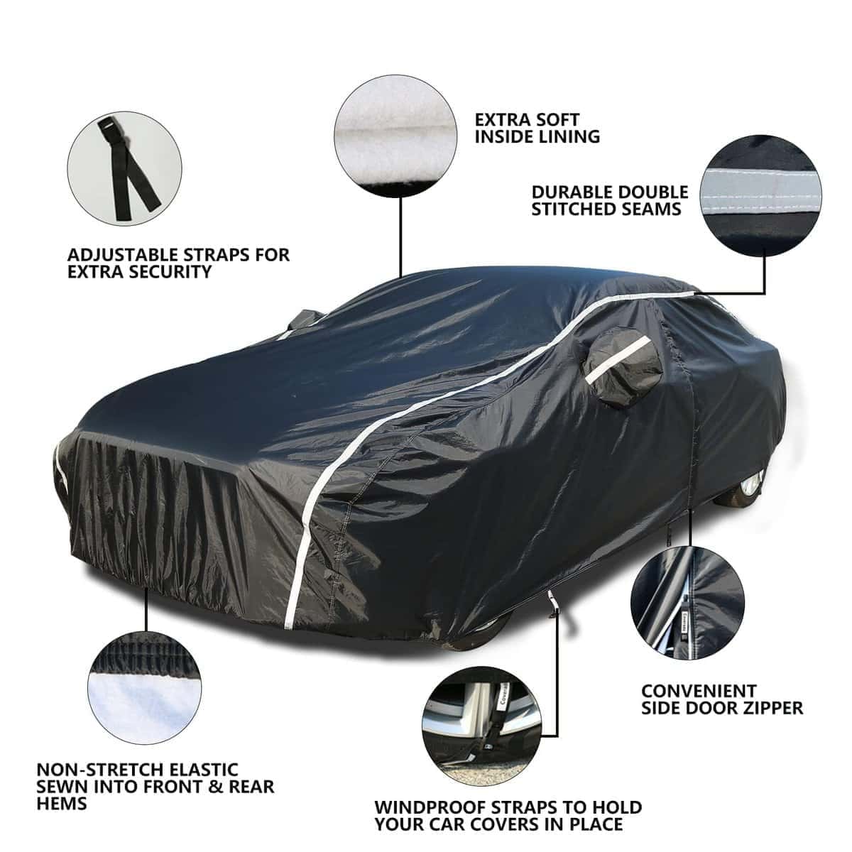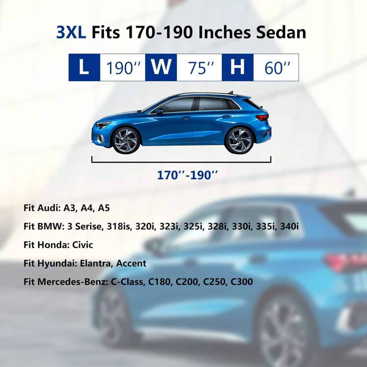 1. TAMAÑO COMPATIBLE: La cubierta para automóvil Tecoom 3XL se ajusta a sedanes de 170″-190″ de longitud. Por favor, verifique los detalles del automóvil antes de ordenar: hatchback, cupé o SUV; fecha de fabricación; longitud total del vehículo.