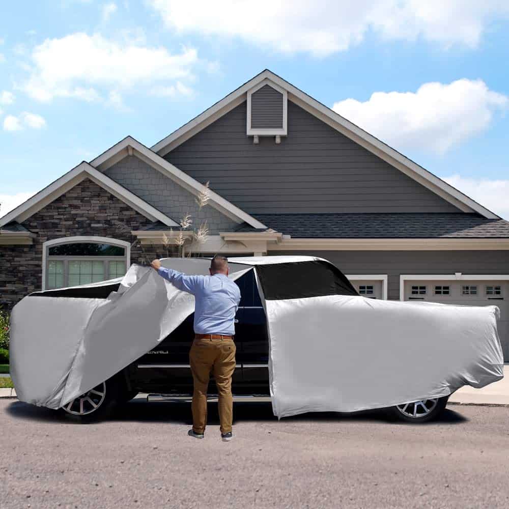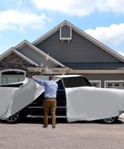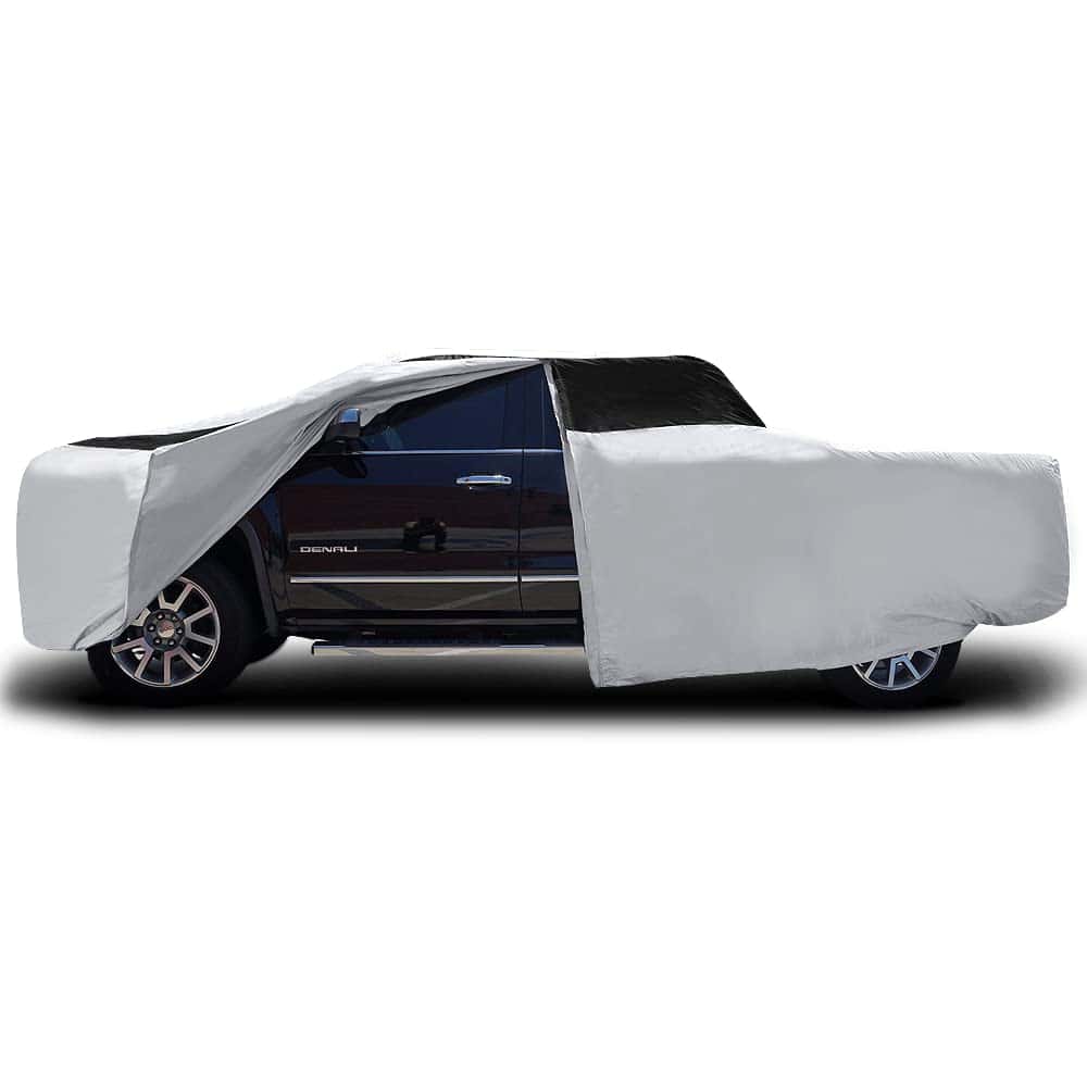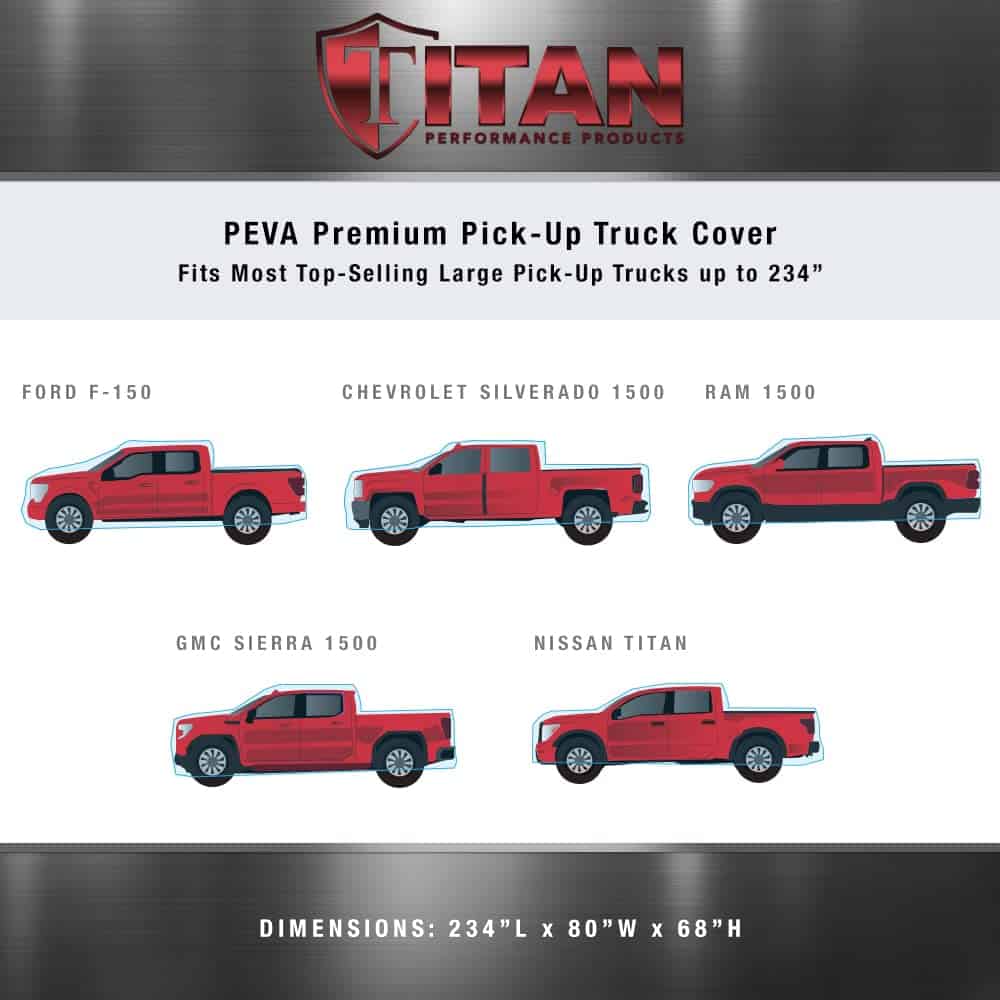 Cubre tu camioneta grande con estilo y protección con la Cubierta para Automóvil Titan Premium Multi-Capa PEVA. Esta cubierta está diseñada para adaptarse a vehículos de camioneta de 213-234 pulgadas de largo, incluidos modelos como F-150 y Silverado. Confeccionada con PEVA resistente a desgarros, esta cubierta es duradera y puede soportar las inclemencias del tiempo. El protector solar reflectante de aluminio proporciona protección UV adicional para mantener la pintura de tu camioneta con un aspecto fresco y nuevo. El forro de algodón suave evita arañazos en la pintura y mantiene tu camioneta en condiciones impecables. La apertura con cremallera en el lado del conductor permite un fácil acceso al vehículo cuando la cubierta está puesta. Dos correas de nylon con hebillas de cierre clic se aseguran de que la cubierta permanezca en su lugar incluso en condiciones de viento. Fácil de poner y quitar, esta cubierta se guarda de forma compacta en su propia bolsa de almacenamiento cuando no está en uso. Protege tu camioneta de las adversidades del tiempo con la Cubierta para Automóvil Titan Premium Multi-Capa PEVA.