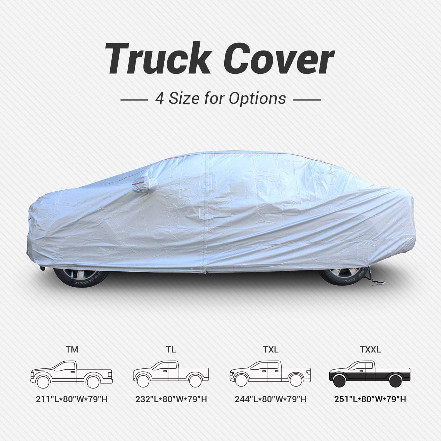La cubierta para automóvil Tecoom es perfecta para uso interior y exterior, ya sea bajo el sol o en clima frío, protege su automóvil de los rayos UV, nieve, lluvia, escarcha, arena, polvo, hojas, ramas y excrementos de aves. Viene con una bolsa de almacenamiento portátil para mantener su cubierta de auto. Compatible con camionetas de tamaño completo con una longitud de hasta 252″ como Ford F150 / Chevrolet Silverado 1500 / Ram 1500 / GMC Sierra 1500 cabina de tripulación–Cama estándar y también compatible con Ford F250 / Chevrolet Silverado 2500 / Ram 2500 / GMC Sierra 2500 cabina de tripulación–Cama estándar.