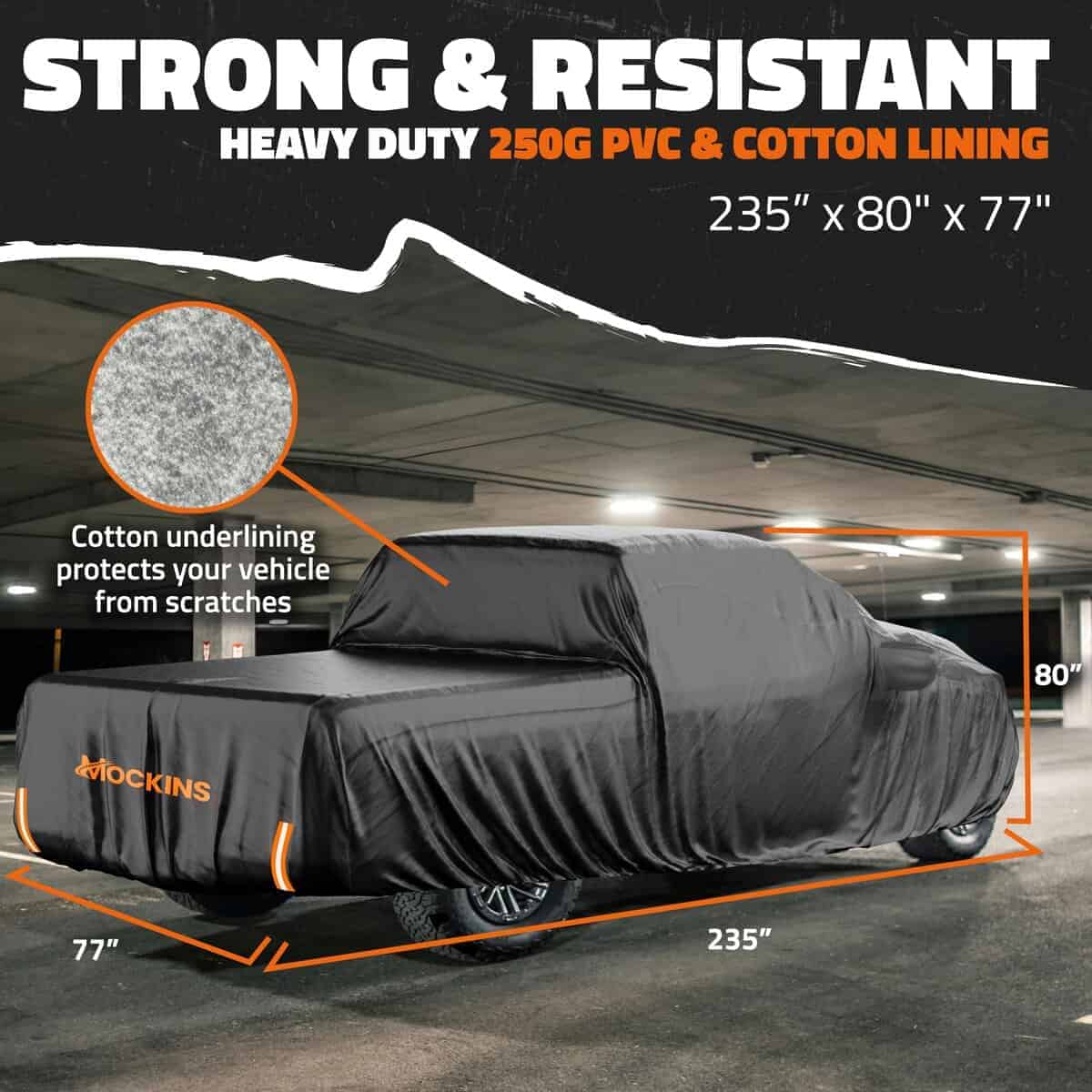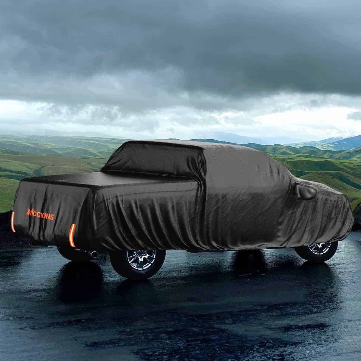 – Cubierta para camioneta resistente para todas las condiciones climáticas: Hecha con doble capa de PVC Negro de 250G y Algodón HD, esta cubierta para camioneta de 235″x80″x77″ ofrece una cobertura premium impermeable y resistente. Ideal tanto para uso interior como exterior, estas cubiertas impermeables protegen su camioneta del polvo, la suciedad, los excrementos de aves, la luz UV, la lluvia, el hielo, la nieve, la escarcha e incluso el granizo ligero. La Cubierta de Nieve para Camioneta Mockins está diseñada para proteger su vehículo de todos los elementos y más.