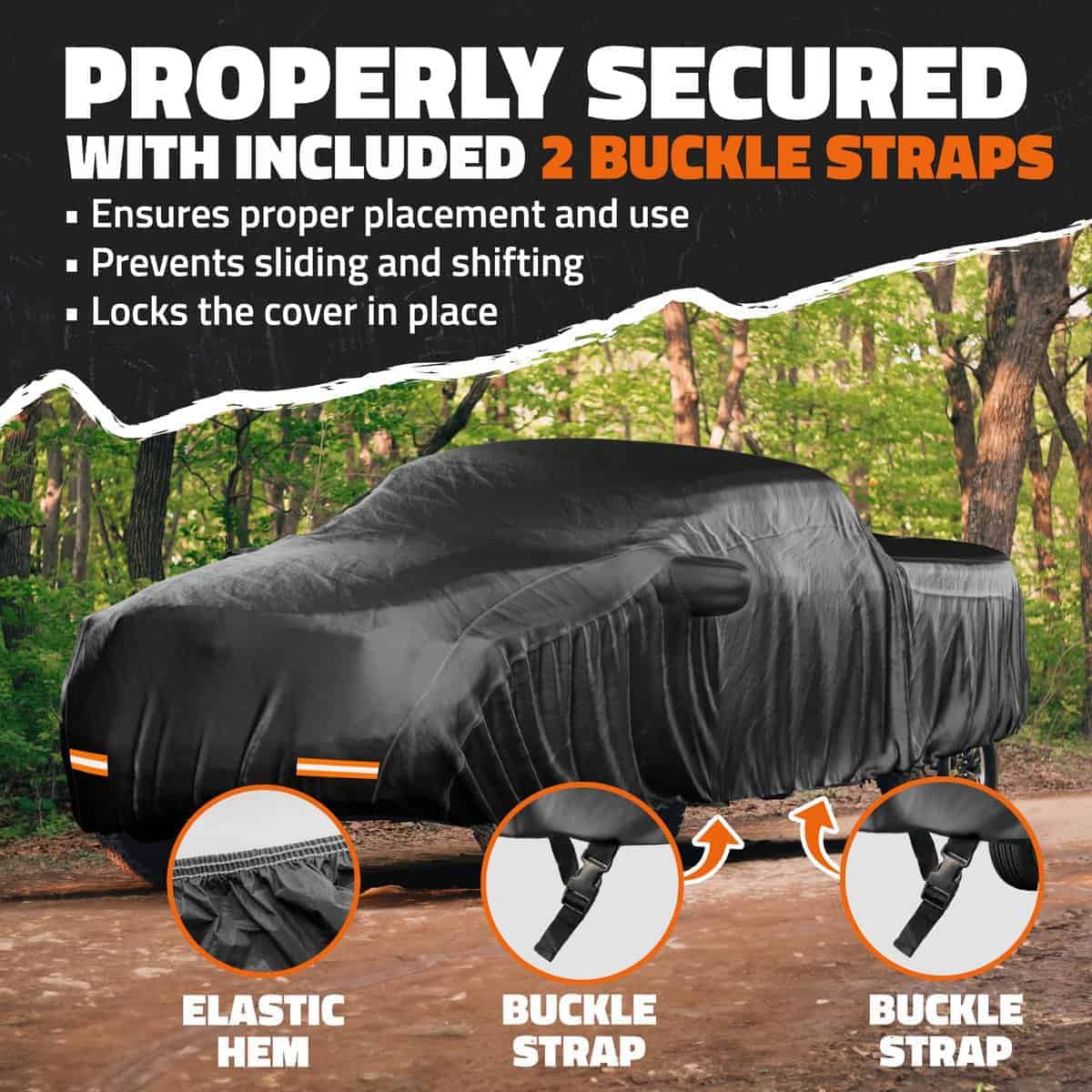 – Cubierta para tormentas de coches a prueba de viento: Proteja su camioneta con un diseño de cubierta para coche impermeable y a prueba de todo clima que está hecho para resistir cualquier clima. Asegurado con 2 correas de hebilla cosidas, esta cubierta impermeable se mantendrá segura incluso en vientos fuertes. Equipada con 4 tiras reflectantes para mejorar la visibilidad de noche o en condiciones de poca luz, esta cubierta universal para coche para nieve también tiene un dobladillo elástico de doble costura para un ajuste ceñido y una defensa resistente para su camioneta.
