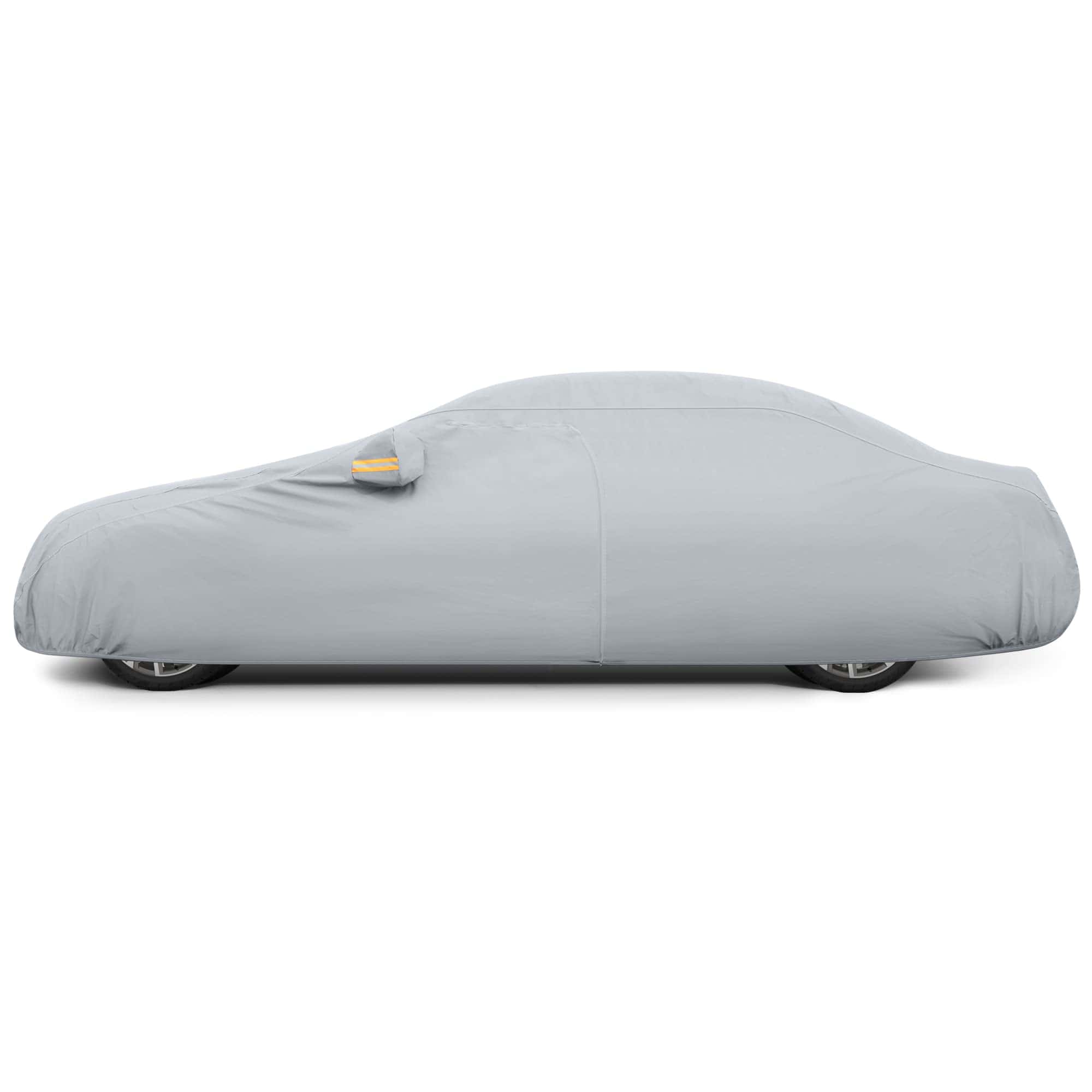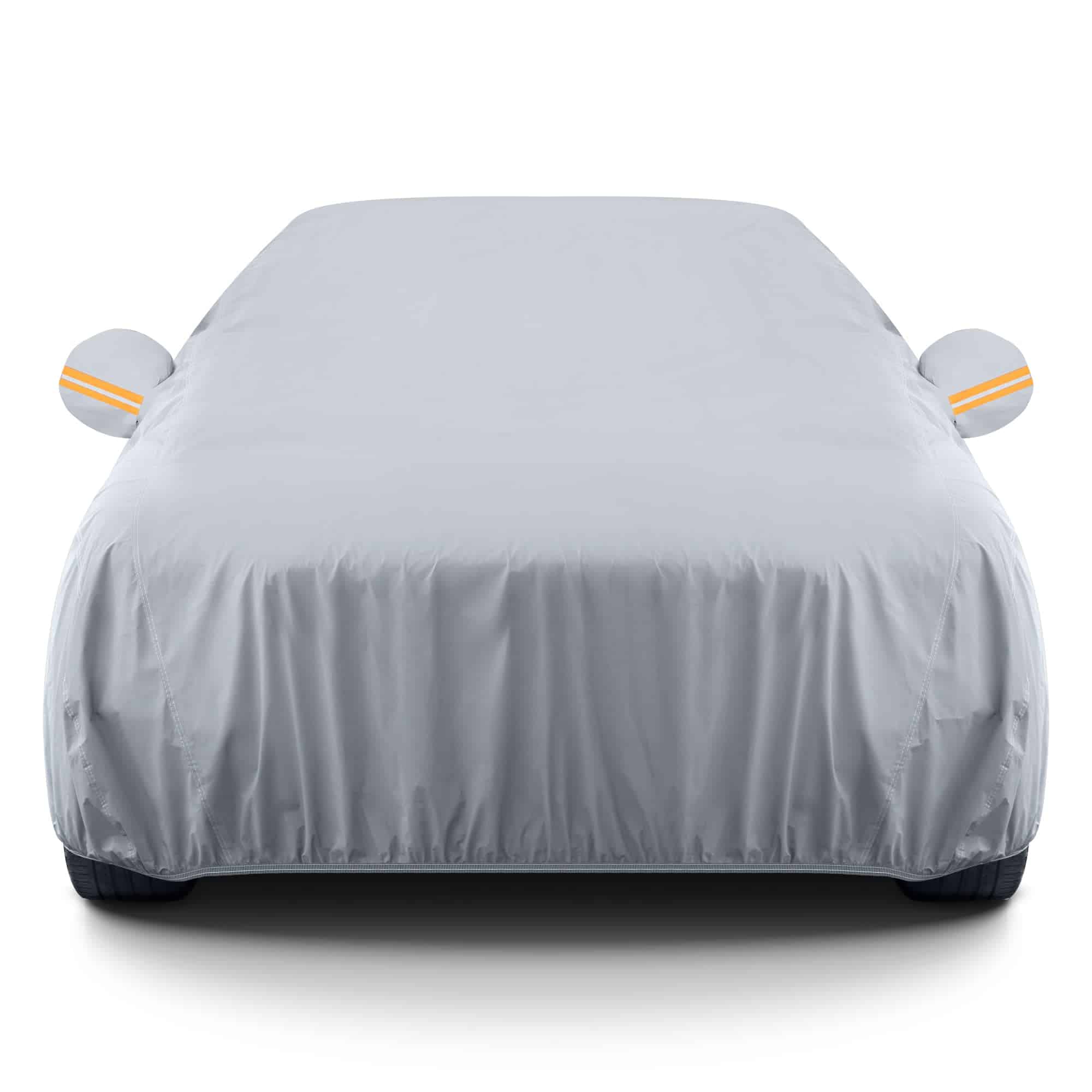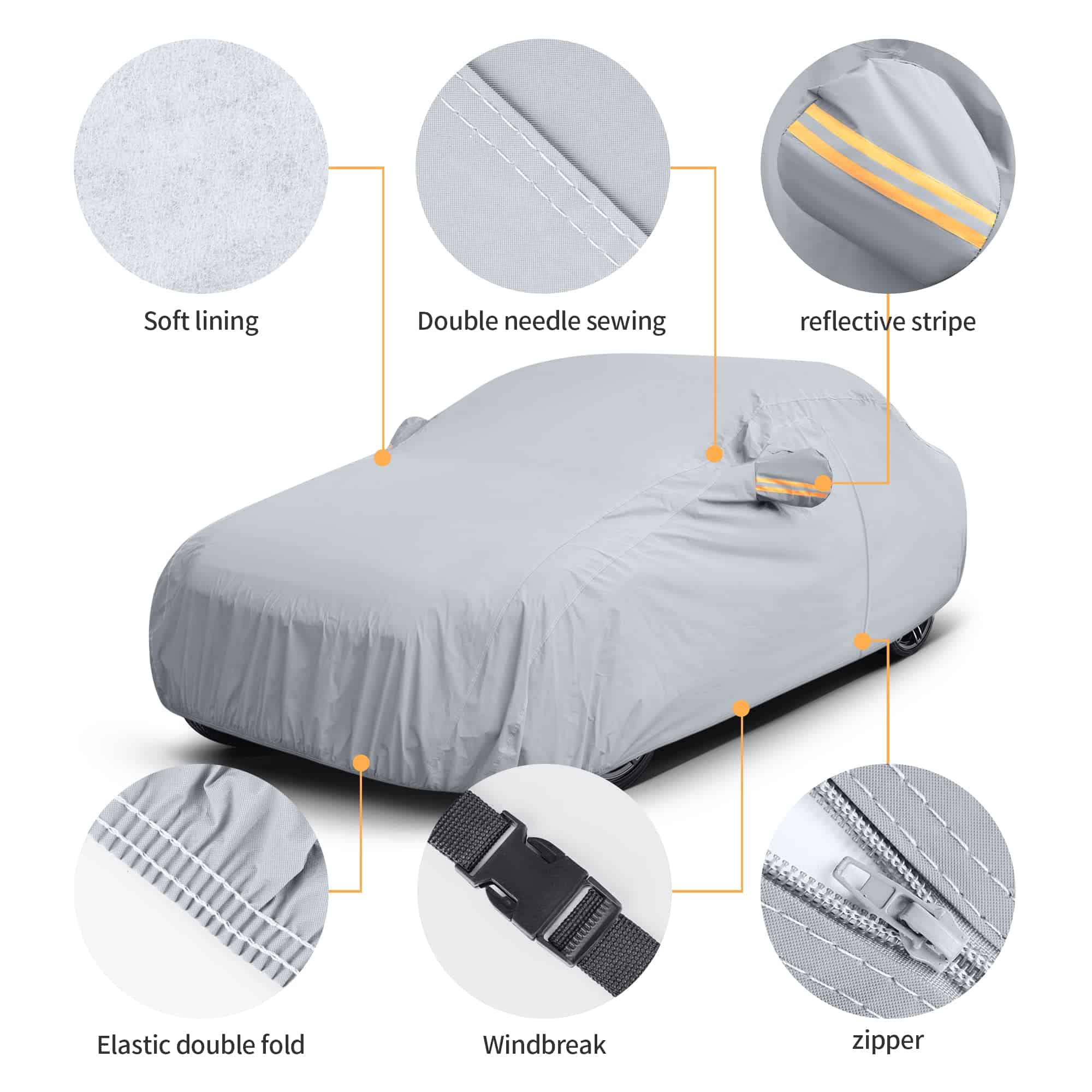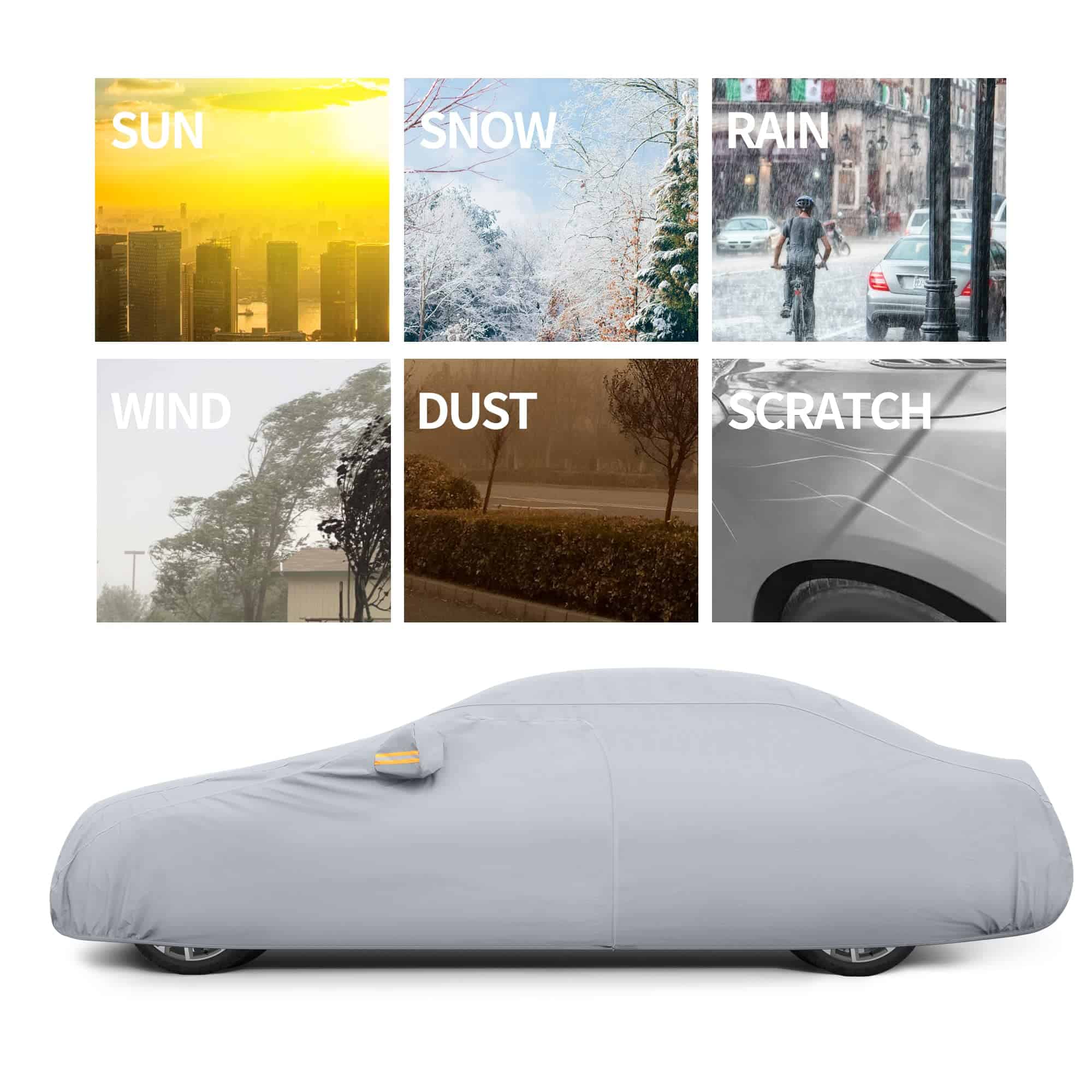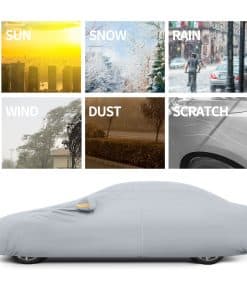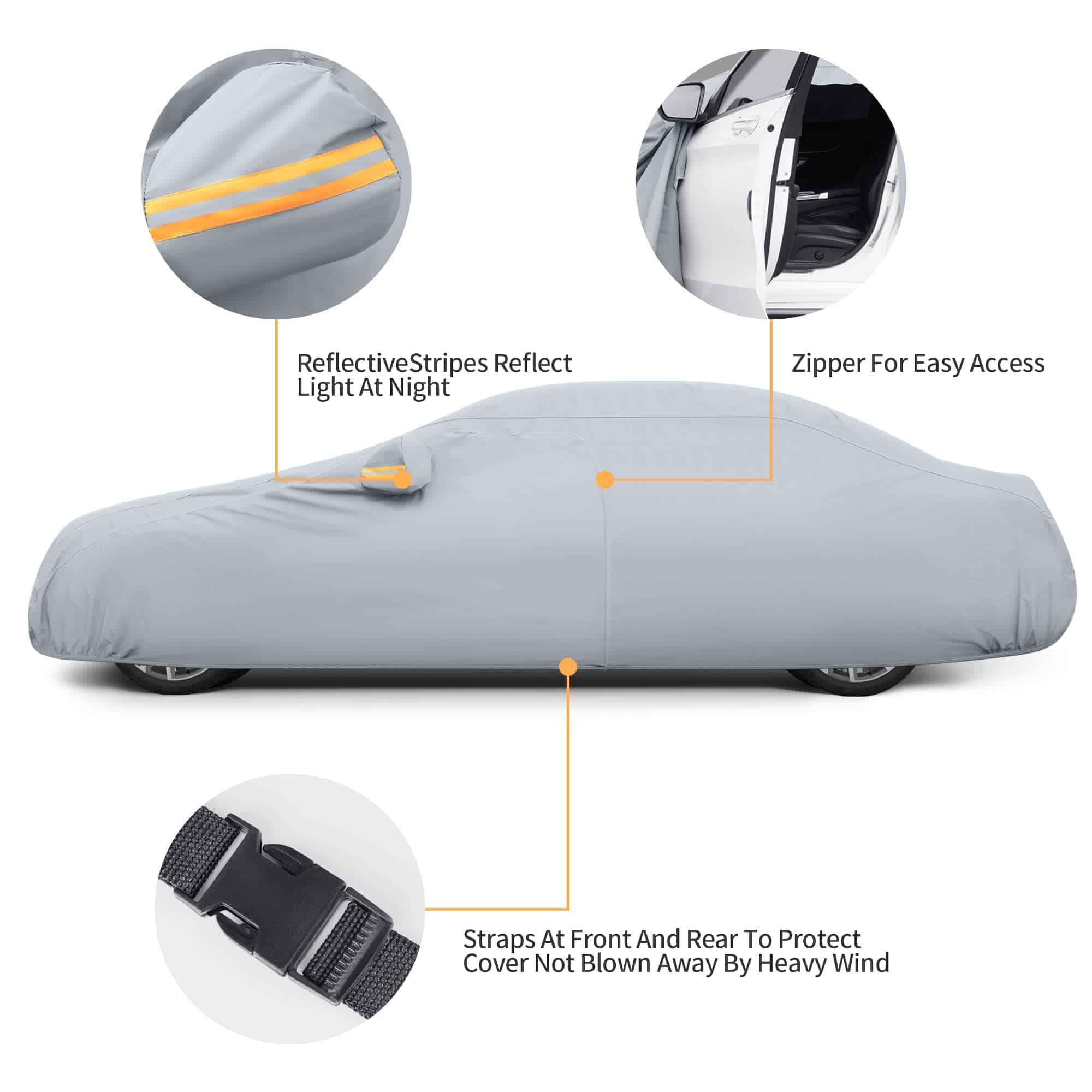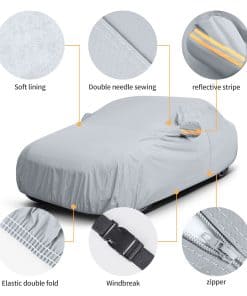 4. DISEÑO PROFESIONAL: Cremallera en la puerta del conductor para un fácil acceso mientras el coche está cubierto. Se incluyen bolsillos para los espejos, tira reflectante y hebilla a prueba de viento para mejorar la seguridad de su vehículo para uso en exteriores. El borde elástico se envolverá en el borde inferior del coche y la correa ajustable con hebilla de longitud está diseñada para asegurar la cubierta en su lugar durante condiciones ventosas. Se incluye una bolsa de almacenamiento para guardar la cubierta cuando no se está utilizando.