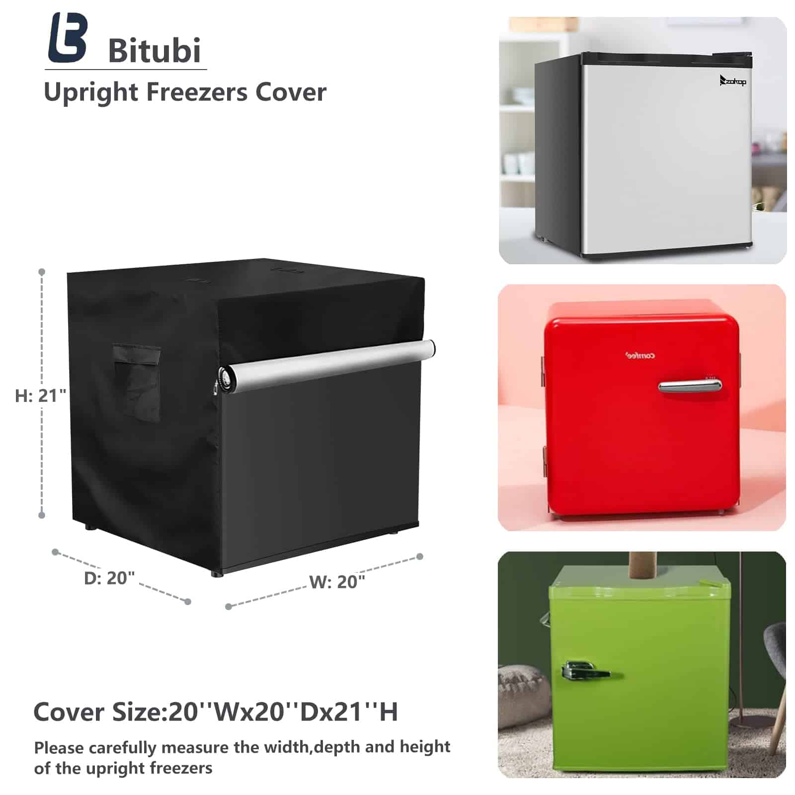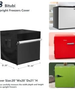 1. TAMAÑO – 20″ W x 20″ D x 21″ H. Basado en una gran cantidad de investigaciones de mercado, nuestra cubierta para refrigeradores es adecuada para la mayoría de congeladores verticales, refrigeradores de bebidas, mini congeladores, congeladores compactos, etc. en el mercado. Por favor, mida su máquina cuidadosamente antes de realizar su pedido.