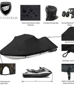 Cubierta para moto acuática EliteShield Trailerable: esta cubierta resistente al agua, desgarrable y resistente al desgaste de poliéster está diseñada para adaptarse a motos acuáticas de hasta 3 plazas de las marcas Sea doo, Yamaha, Kawasaki, y waverunner PWC. Protege tu moto acuática de los elementos exteriores y alarga su vida útil. Ideal para el transporte en remolques.