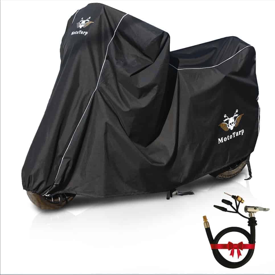 Cubierta para motocicleta de alta resistencia MotoTarp 600D, diseñada para proteger tu motocicleta de los daños causados por el clima. Esta cubierta fuerte y resistente cuenta con protección solar UV 50+ y protección impermeable al 100% de hasta 10,000 pa-. Además, protege tu ciclo de daños como arañazos en el vidrio y la pintura. La ventana de la placa de matrícula garantiza que la placa de tu moto esté visible cuando esté estacionada en público, lo que te permite identificar fácilmente tu moto en un estacionamiento abarrotado. El protector de calor para el escape está fabricado con un tejido avanzado que evita el calentamiento y fundición en la zona del escape. Esto significa que puedes cubrir inmediatamente tu moto sin necesidad de esperar a que se enfríen los tubos de escape, creando un refugio instantáneo para tu moto donde quiera que estés. Las características de seguridad inteligentes incluyen la posibilidad de asegurar la cubierta a las ruedas de tu moto envolviendo una cadena (no incluida) alrededor de las ruedas delanteras y traseras. Las franjas reflectantes hacen que esta cubierta sea fácil de ver en estacionamientos oscuros y por la noche. Se incluyen 3 clips fuertes para asegurar los dos lados en la base de tu moto. Como bonificación, hemos incluido una manguera de extensión para inflar neumáticos de conexión rápida y liberación rápida para una inflación rápida y sencilla de los neumáticos. Además, un paño en bucle para limpiar rápidamente el polvo del tablero y el parabrisas.