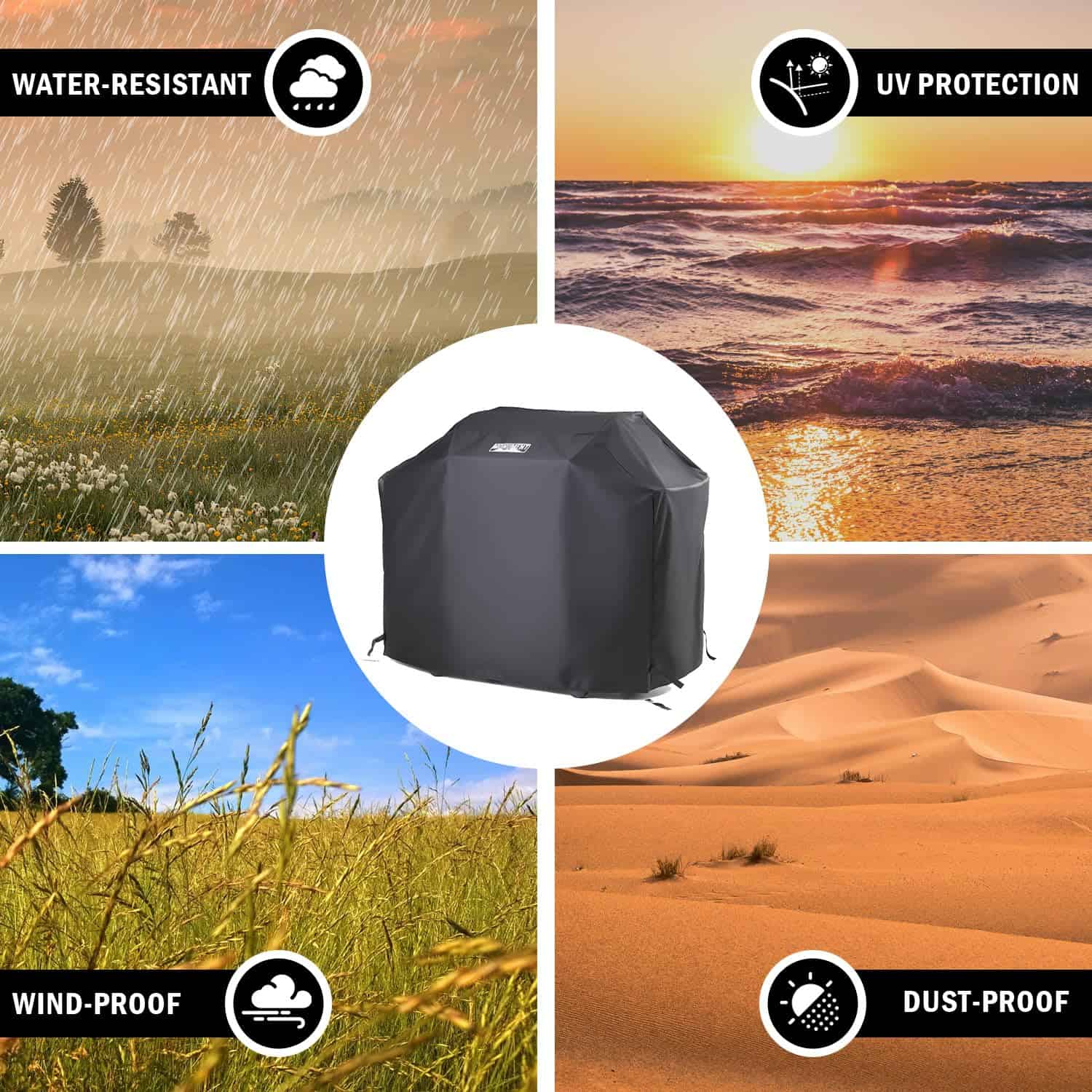 Esta cubierta para parrilla de gas pesada Monument es la mejor manera de proteger su parrilla de exterior Monument de 4 quemadores de los elementos. Con un exterior de tela Oxford resistente al agua y un forro de PVC en el interior, esta cubierta es resistente al agua, protección UV, a prueba de viento y a prueba de polvo para garantizar que su parrilla esté protegida en todas las condiciones climáticas. Con una amplia compatibilidad, esta cubierta está diseñada para adaptarse a todos los modelos de parrillas de 4 quemadores Monument de 54 pulgadas de ancho x 20 pulgadas de profundidad x 43 pulgadas de altura, incluidos los modelos Mesa 400, 13892, 25392, 24633, 35633, 17842, 24367, 41847NG. (NOTA: NO COMPATIBLE CON Denali D405 y Denali D425). Las correas de velcro incluidas aseguran que la cubierta permanezca en su lugar incluso en condiciones de viento fuerte. Además, esta cubierta es fácil de limpiar, simplemente pase un paño húmedo para mantenerla en condiciones óptimas.
