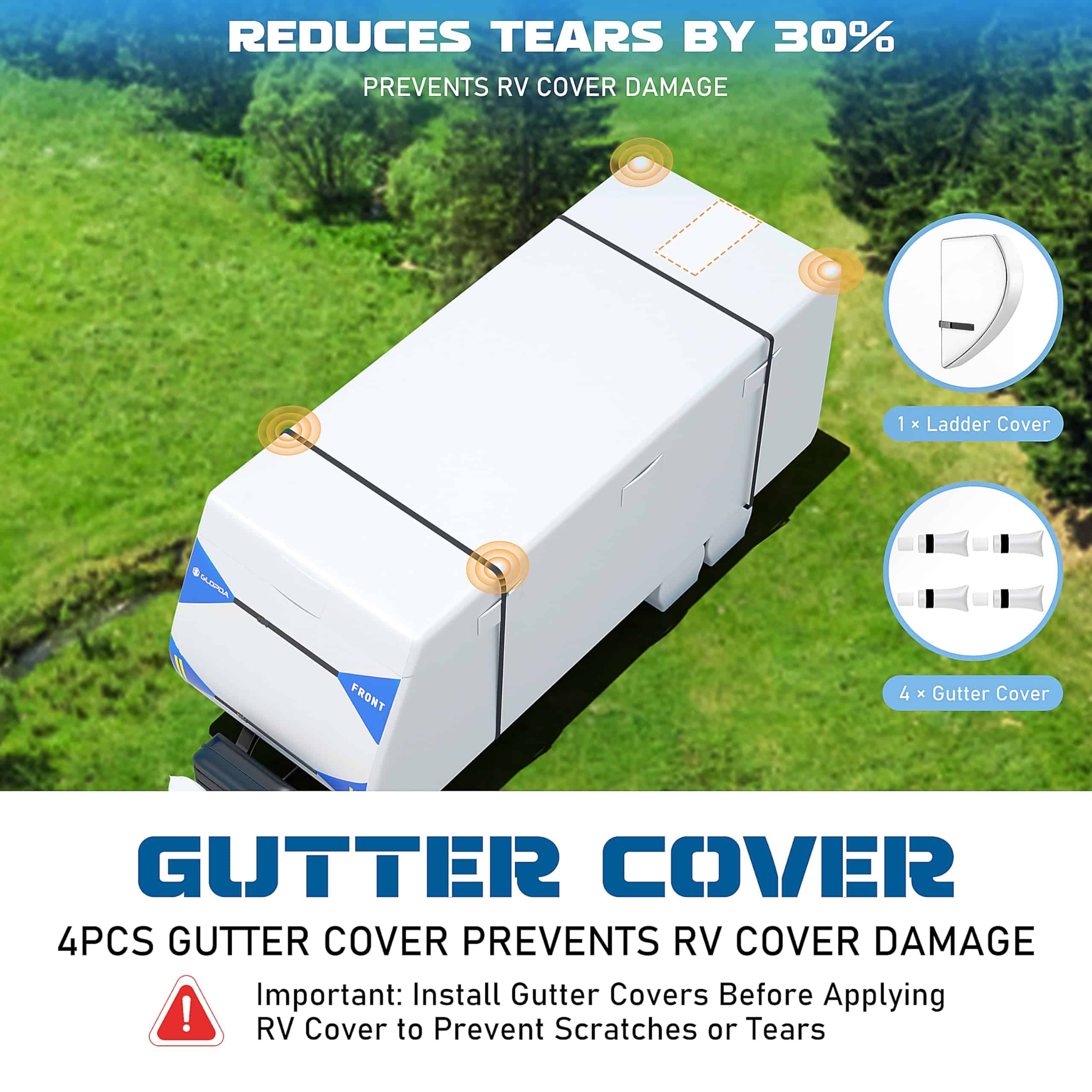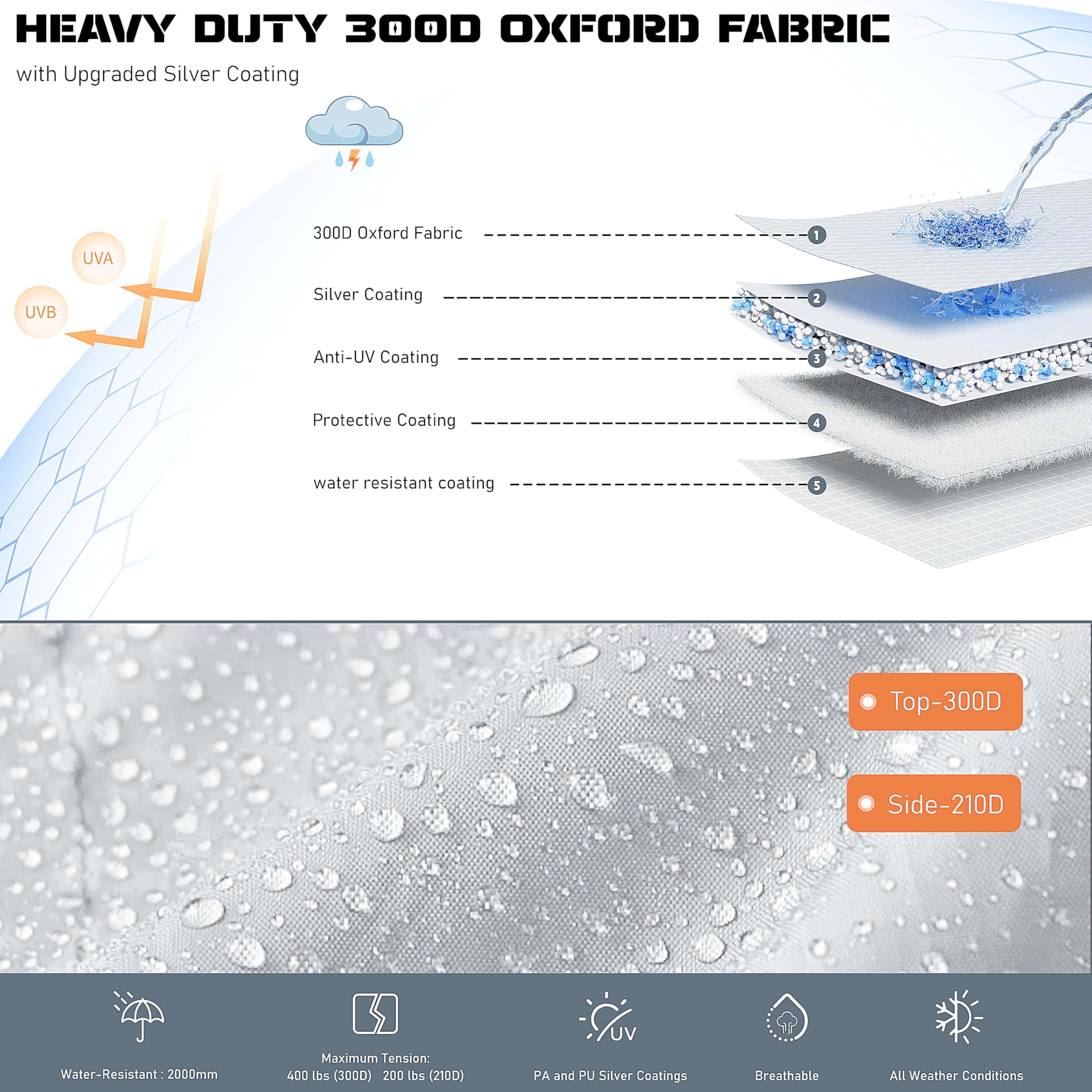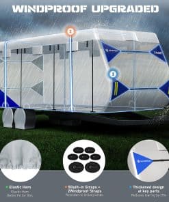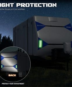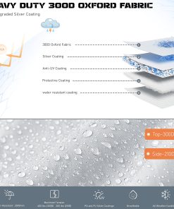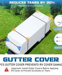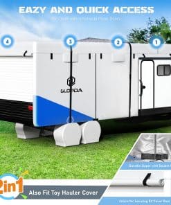1. TELA RESISTENTE A LAS ROTURAS: Nuestra cubierta de RV está hecha de tela Oxford plateada de 300D en la parte superior y 210D en los costados. El revestimiento plateado proporciona una resistencia superior (hasta 400 libras) y durabilidad, asegurando que la cubierta permanezca intacta incluso con un uso frecuente. Con una impermeabilización excepcional (más de 2000mm de resistencia al agua) y protección UV, proporciona una protección duradera para su RV en todas las condiciones climáticas. 2. DISEÑO MEJORADO A PRUEBA DE VIENTO: Para ofrecer una resistencia superior contra vientos fuertes y condiciones adversas, dos correas extra largas a prueba de viento reducen el riesgo de roturas hasta en un 80%. Las correas a prueba de viento inferiores con hebillas duraderas permiten una instalación fácil y liberación rápida. Las esquinas elásticas del dobladillo y los paneles de tensión ajustables en la parte delantera y trasera aseguran la cubierta del remolque de forma segura, evitando que se vuele o se rompa incluso en los vientos más intensos. 3. PROTECCIÓN IMPERMEABLE Y SOLAR: Nuestra cubierta para remolque de viaje está hecha de tela Oxford de 300D de alta densidad con un revestimiento plateado premium, excelente resistencia a los rayos UV y capacidad impermeable. El revestimiento plateado refleja eficazmente los rayos UV dañinos, evitando el envejecimiento de la tela, mientras que la capa de PU garantiza un 100% impermeable, superando una prueba de impermeabilidad de 2000mm. Adecuado para su uso en áreas lluviosas, ventosas y con exposición prolongada al sol. 4. VENTILACIÓN Y ACCESIBILIDAD: Nuestras cubiertas para RV y remolques están diseñadas con 4 ventilación en cada lado y una ventilación adicional en la parte delantera para mantener el remolque seco en todo momento, especialmente durante períodos de almacenamiento prolongado. 3 puertas con cremallera enrollables en el lado del pasajero y otra en la parte trasera para facilitar el acceso al RV sin quitar la cubierta. También se adapta a la cubierta de toy hauler. 5. ACCESORIOS ABUNDANTES Y FÁCIL INSTALACIÓN: Por favor, mida antes de comprar. Se adapta a cubiertas de campista de 14 a 16 pies. El paquete incluye: 1 cubierta de remolque de viaje, 4 cubiertas para llantas, 2 correas a prueba de viento, 6 cubiertas de canal, 1 cubierta para gato de lengua, 1 cubierta para escalera, 1 bolsa de lanzamiento, 1 parche de reparación adhesivo y 1 bolsa de almacenamiento (que también sirve como cubierta de tanque de propano). La cubierta está claramente etiquetada como Delantera y Trasera para una instalación fácil. ¡Respaldado por 2 años de soporte de GLOPDA, para que pueda comprar con confianza!
