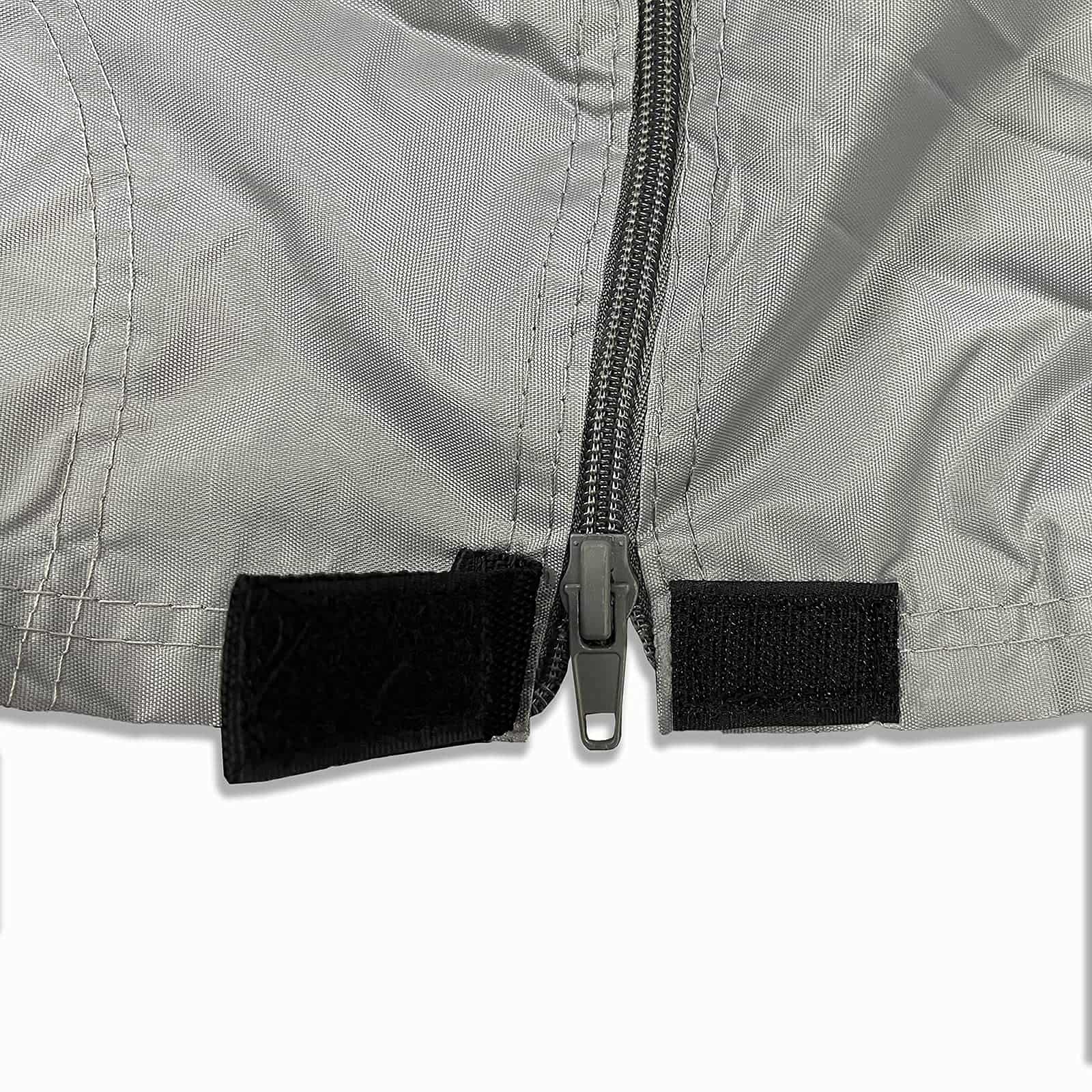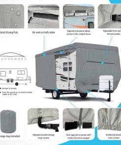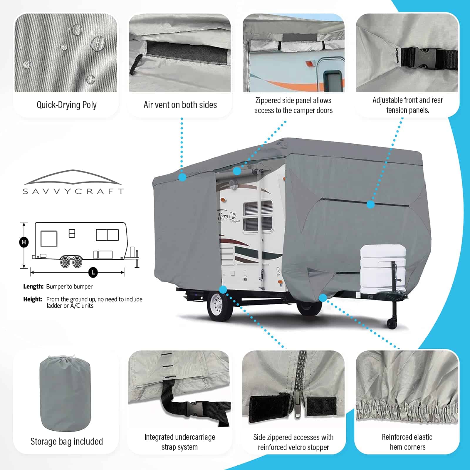 Cubra su remolque de viaje RV con la cubierta SavvyCraft Premium para protegerlo de los elementos y aumentar su vida útil. Hecho con poliéster resistente con recubrimiento de PU, esta cubierta es más resistente a las roturas que el tejido no tejido convencional. El poliéster tejido de forma ajustada repele eficazmente el agua y la nieve, evitando el envejecimiento y la degradación de su remolque. Además, el tejido tratado con UV protege su RV de los daños causados por los rayos UV, la lluvia, la nieve, la suciedad, los golpes y los arañazos, previniendo las grietas y la decoloración. La cubierta también es resistente al viento, con esquinas elásticas y correas ajustables que garantizan un ajuste seguro. Los paneles con cremallera en el lado del pasajero permiten un acceso conveniente al remolque en cualquier momento, y las rejillas de ventilación en ambos lados reducen el estrés del viento y ventilan la humedad interior. Con una instalación rápida y sencilla gracias al material ligero pero duradero, la cubierta SavvyCraft Premium es la elección perfecta para proteger su preciado remolque de viaje RV.