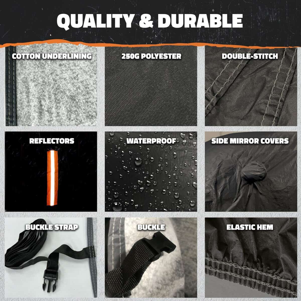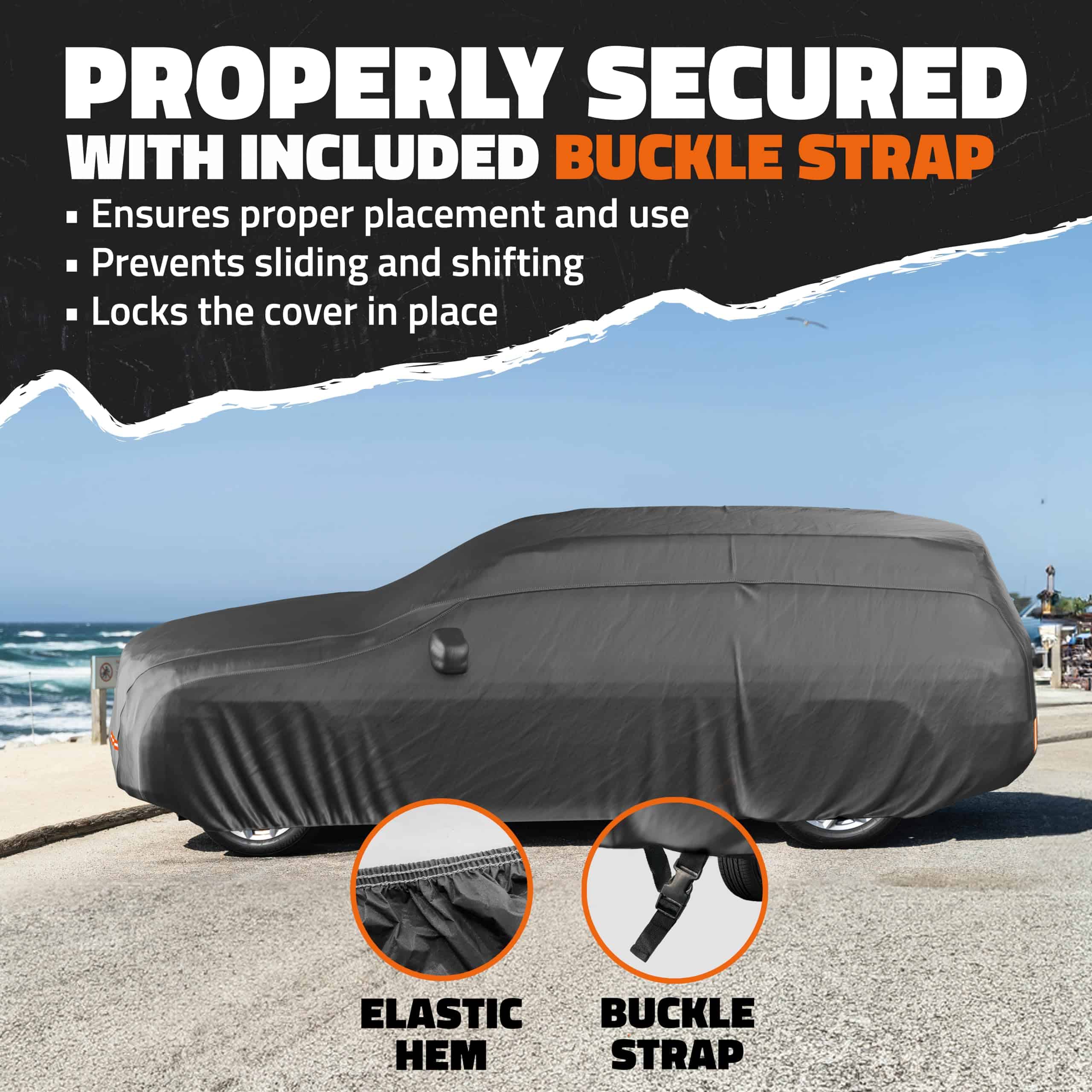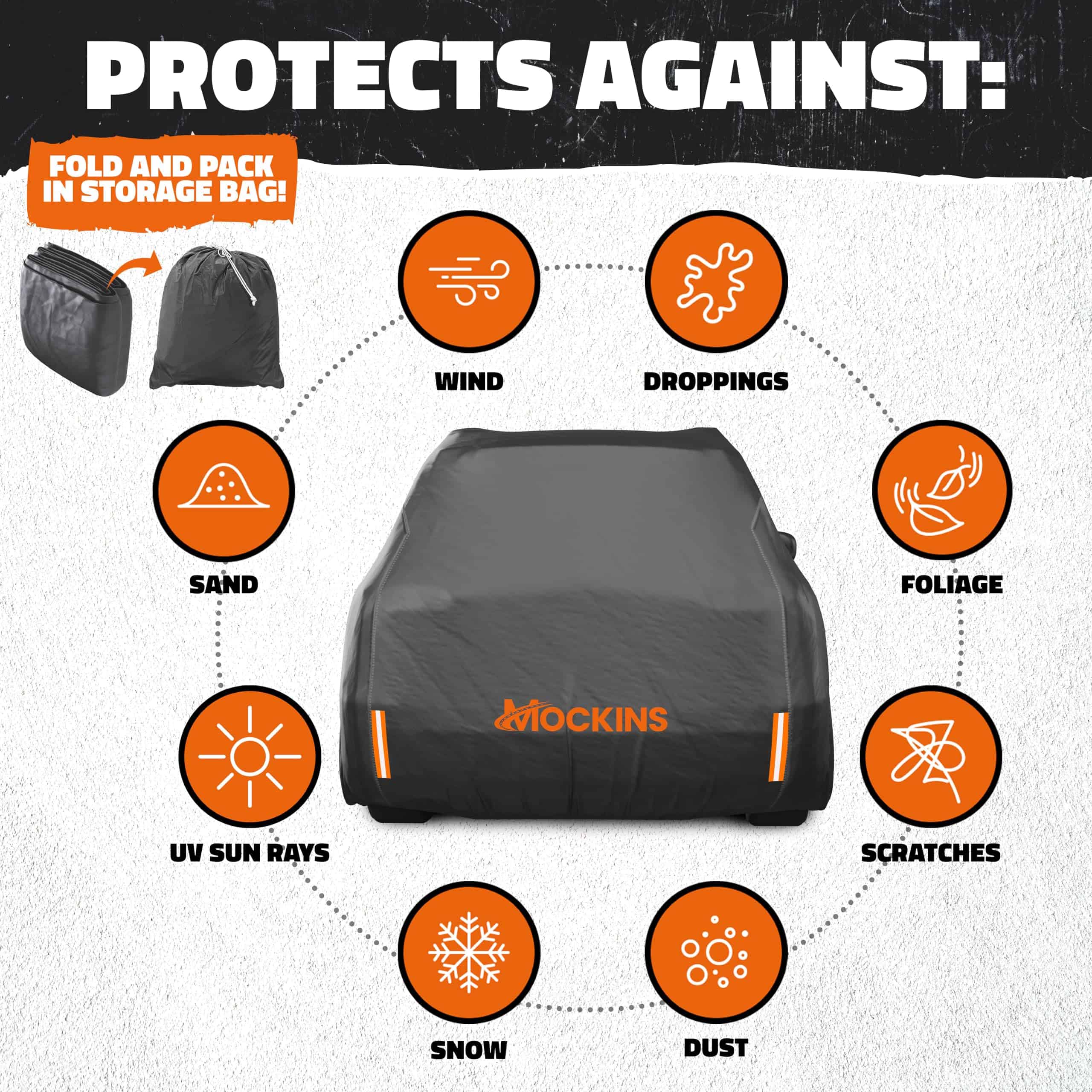 3. ¡CUBIERTAS DE COCHES IMPERMEABLES Y FÁCILES DE INSTALAR: Este kit de cubierta de coche exterior a prueba de agua de todo clima incluye cubiertas de espejos incorporadas, reflectantes, una correa de hebilla resistente al viento y una bolsa de almacenamiento conveniente. La Cubierta de Invierno de Coche Mockins está disponible en varias tallas y grosores, con diseños opcionales de puertas con cremallera para un acceso interior rápido. Desde la cubierta de polvo del coche de uso interior hasta la protección exterior de la tormenta del coche, estas cubiertas de coche a prueba de mal tiempo son fáciles de instalar y protegen su vehículo del desgaste y la intemperie.