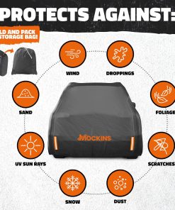 4. ¡SATISFACCIÓN DEL CUIDADO DEL CLIENTE: ¡Mockins se dedica a ofrecer productos de protección solar de cubierta de coche de primer nivel y apoyo! Nuestras cubiertas SUV para uso en exteriores de todo tipo de clima vienen con una garantía limitada de 1 año para garantizar la satisfacción. Diseñada para la durabilidad, esta cubierta de coche completa ofrece una protección confiable. Si tiene alguna inquietud sobre esta cubierta de coche a prueba de agua, nuestro equipo dedicado de atención al cliente está aquí para ayudarlo. ¡Enfrente el tiempo duro con confianza con la cubierta de coche portátil Mockins SUV para la protección en exteriores!
