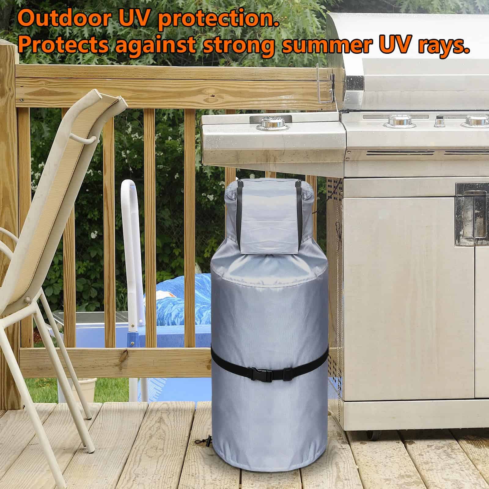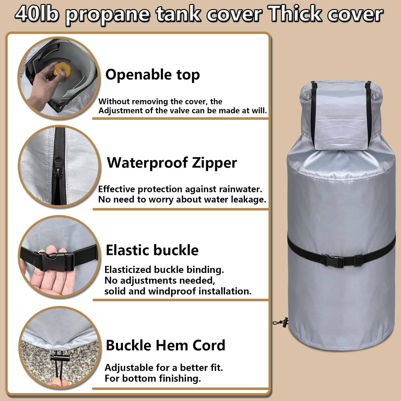 Nuestra Cubierta para Tanque de Propano está hecha con tela de poliéster impermeable plateado premium para propiedades de impermeabilización consistentes. El acabado plateado también ayuda a refractar la mayor parte del daño causado por los súper fuertes rayos UV en la pintura del tanque de propano y en cada parte del tanque. Nuestra Cubierta para Tanque de Propano de 40 lb también tiene una capa de fielto de alta calidad en el interior que proporciona aislamiento y protección contra heladas, lo que protege tu Tanque de Propano de 40 lb del calor y las heladas, y ayuda a minimizar el daño por fricción e impacto al transportar y usar tu Tanque de Propano de 40 Galones.