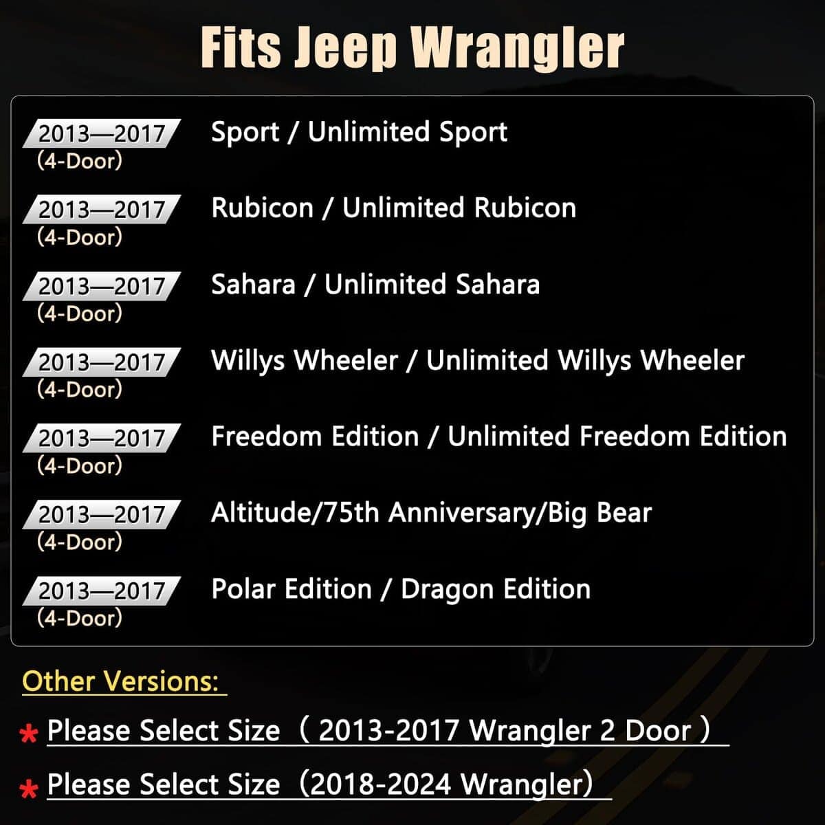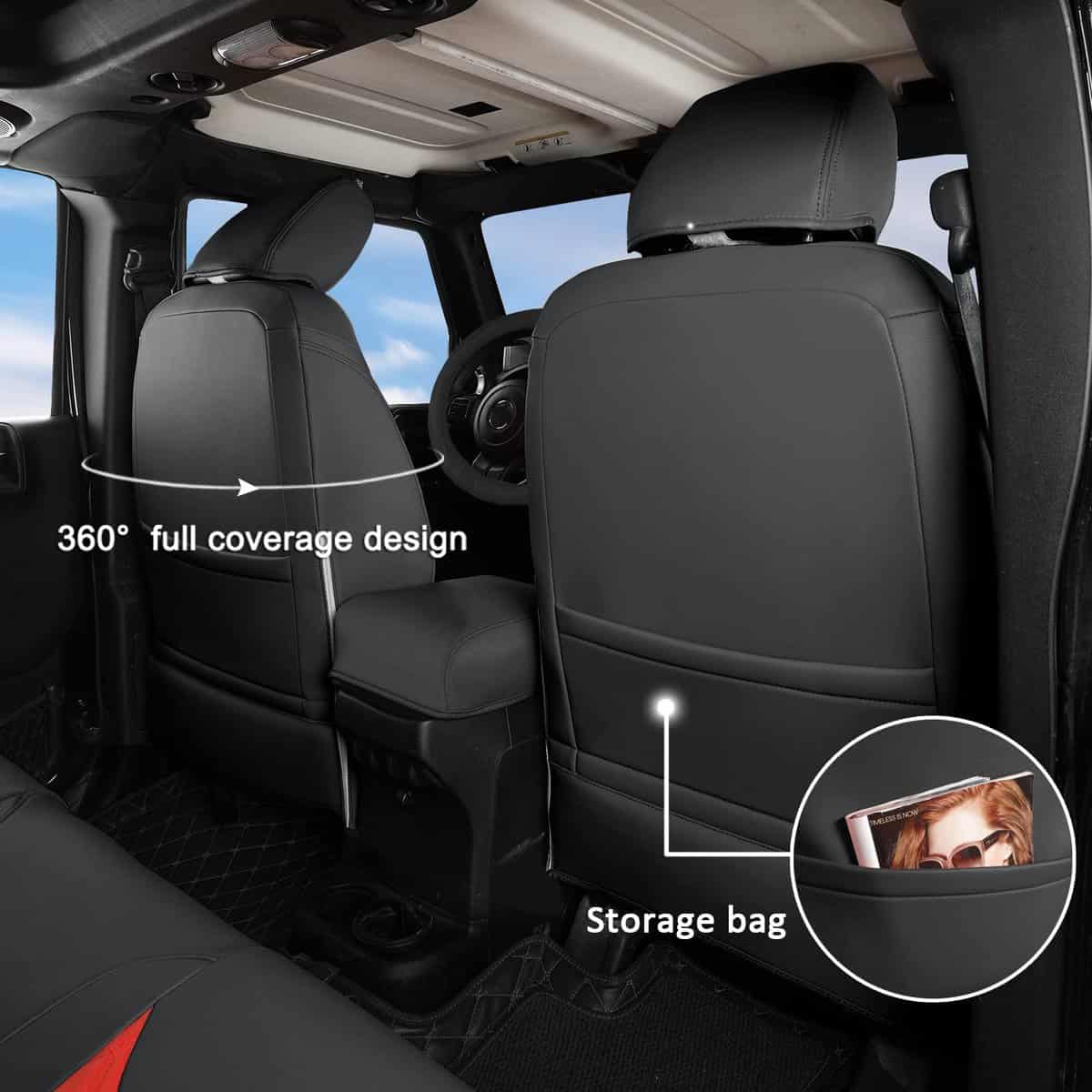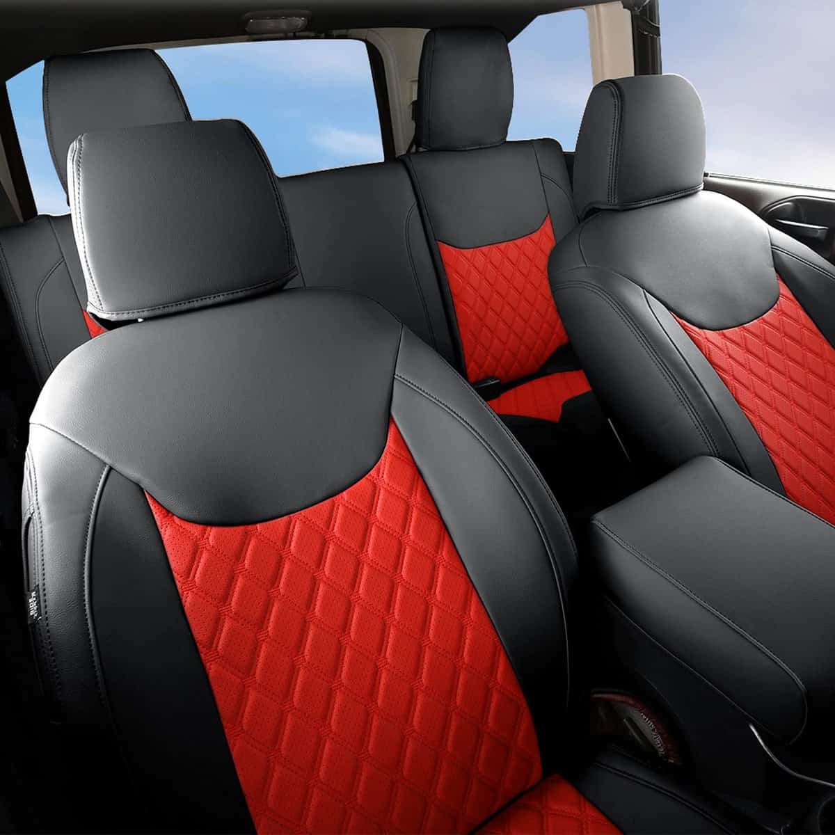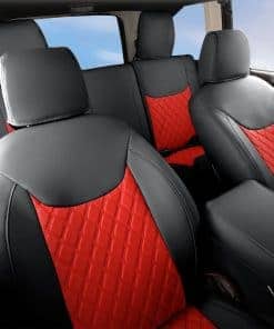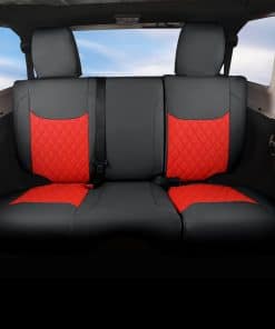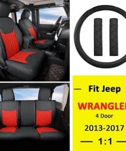 Cubiertas de asiento personalizadas a medida para Jeep Wrangler JK 4 puertas 2013 2014 2015 2016 2017. Material suave de piel sintética, resistente al desgaste y fácil de limpiar. Diseño acolchado de rombos para proteger los asientos originales de desgaste, manchas y cabello de animales.