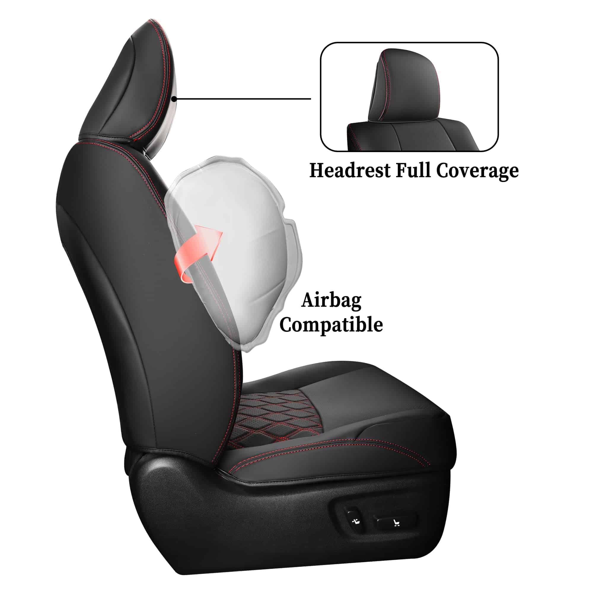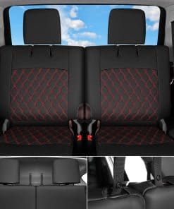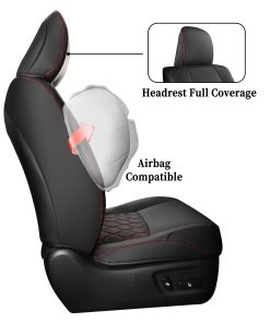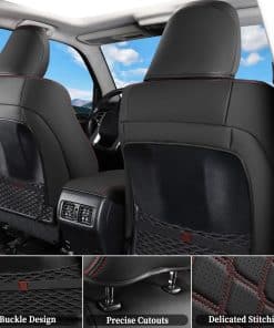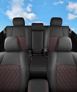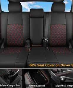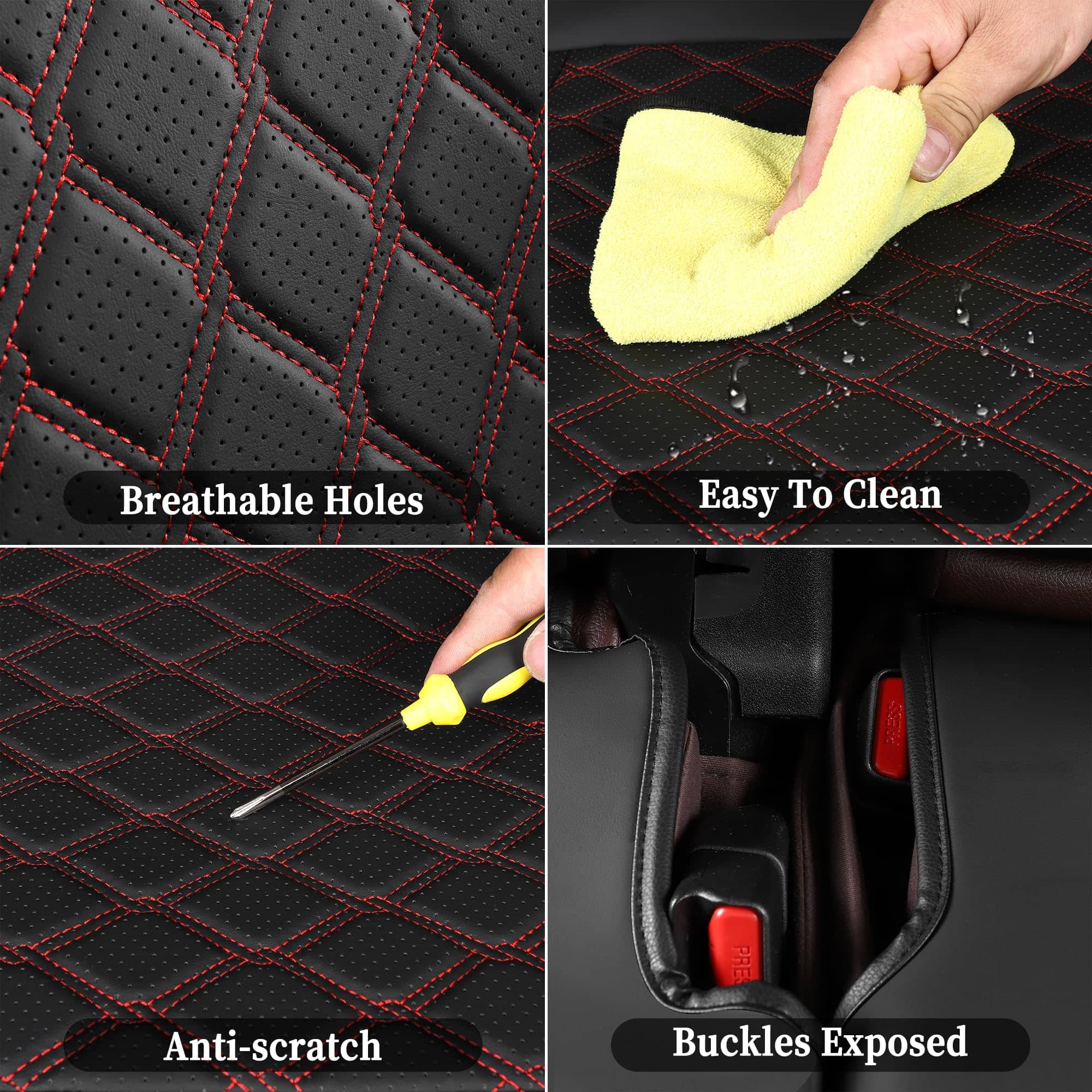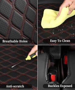 Cubiertas de asiento impermeables hechas de cuero sintético duradero, transpirable, resistente al desgaste y acolchado con esponja y algodón para mayor comodidad. Protege los asientos originales de tu automóvil de manchas o daños. Diseño exclusivo compatible con airbags, asientos de seguridad para bebés y cinturones de seguridad. Fácil de instalar y limpiar. Un toque moderno para el interior de tu auto.