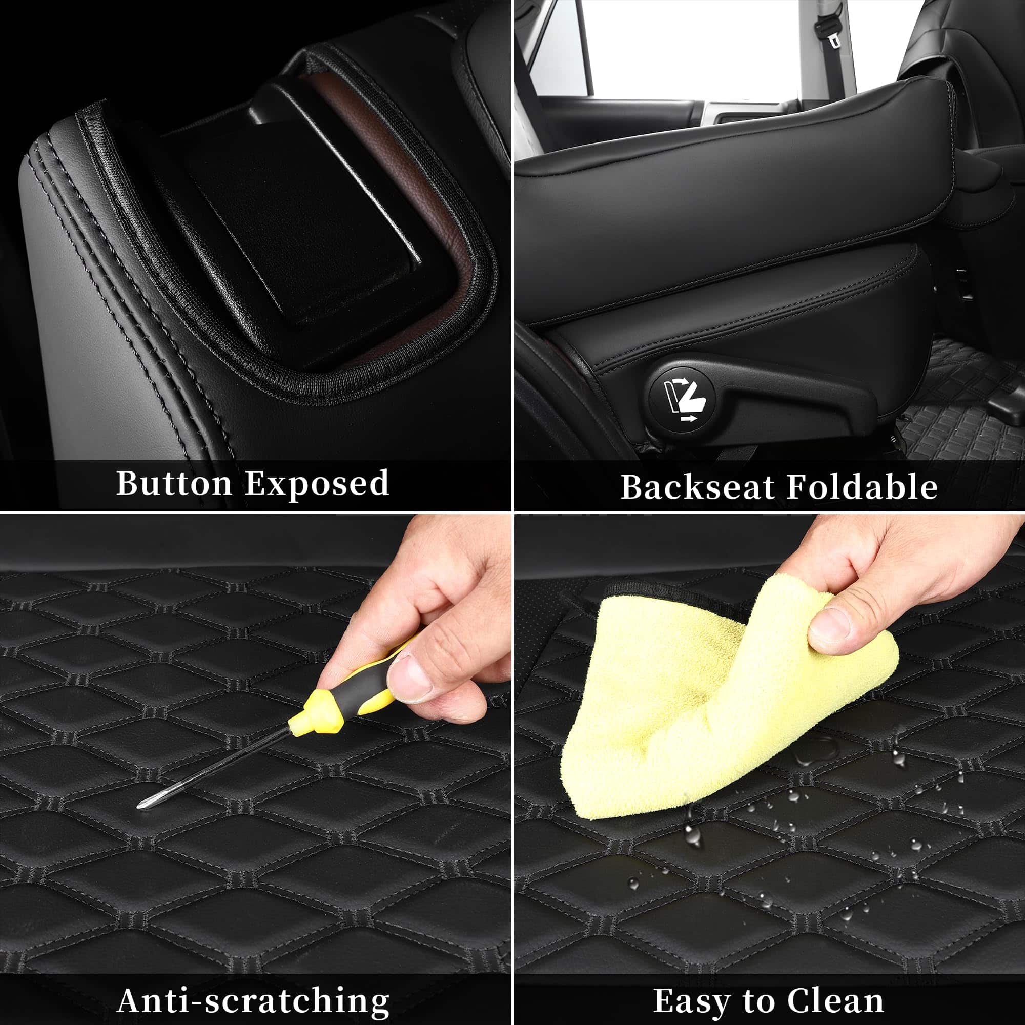 3. Material Premium Las cubiertas de asiento 4Runner están hechas de cuero sintético duradero, transpirable, resistente al desgaste e impermeable, acolchadas con esponja y algodón para que se sienta más suave y cómodo. Amigable con las mascotas, las garras de los perros no dejarán arañazos en las cubiertas de los asientos del automóvil.