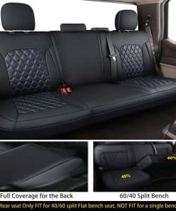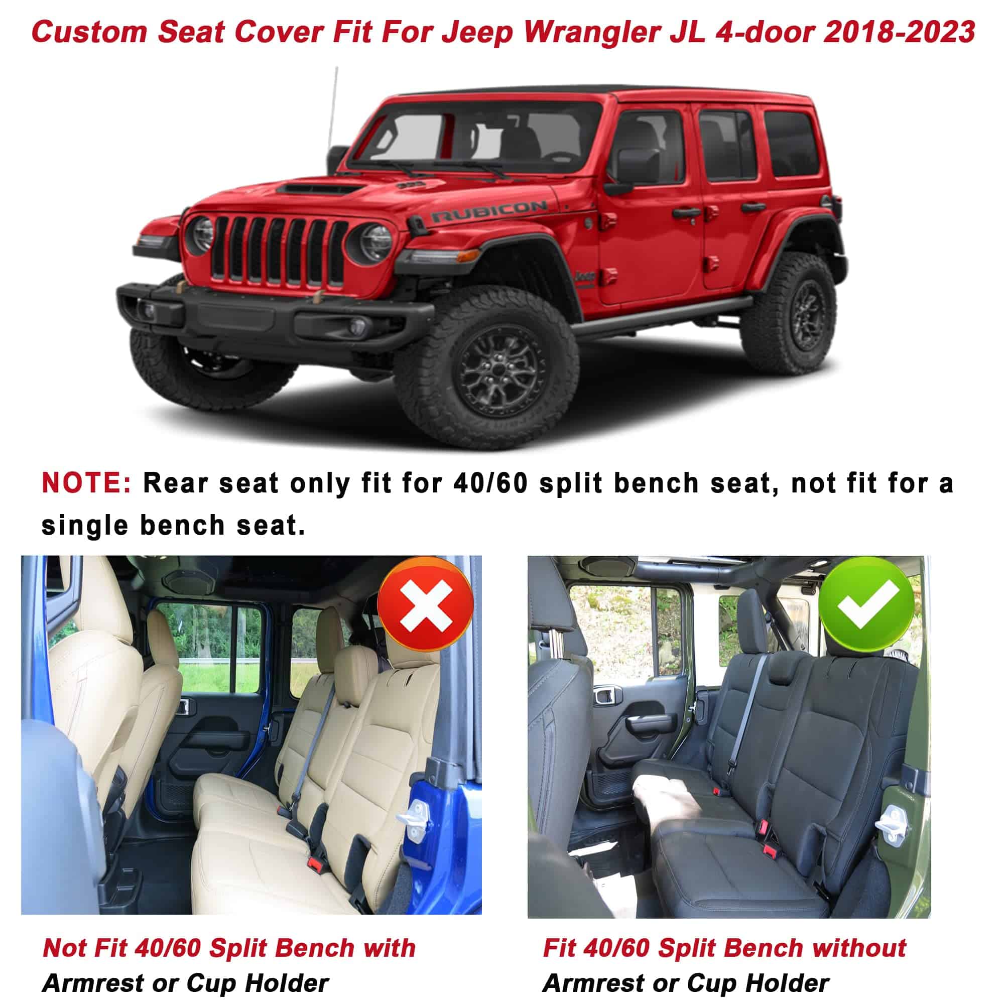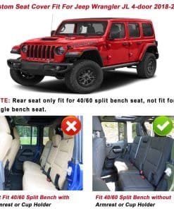 1. Ajuste personalizado: Precisamente medido y diseñado, las cubiertas de asiento delantero y trasero compatibles con el Jeep Wrangler JL de 4 puertas 2018-2024 sin portavasos trasero. NOTA IMPORTANTE: Este artículo SOLO ES COMPATIBLE con Wrangler de 4 puertas con asiento dividido 40/60 y sin portavasos trasero, No apto para Wrangler de 2 puertas, No apto para Wrangler de 4 puertas con asiento trasero de banco completo y con portavasos trasero, como se muestra en la Figura 6. Por favor, elija el tamaño correcto para su camioneta.