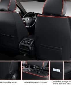 El diseño único de las cubiertas, con botón superior y cremallera lateral, permite un ajuste fácil y una instalación rápida. Los asientos delanteros cuentan con bolsillos de almacenamiento en los lados delantero y trasero, brindando espacio adicional para guardar objetos pequeños. Además, las cubiertas son compatibles con airbags y cinturones de seguridad, manteniendo intacta la funcionalidad de los asientos. Los puntos de silicona antideslizantes en la parte trasera aseguran que el cojín permanezca en su lugar al entrar y salir del asiento.