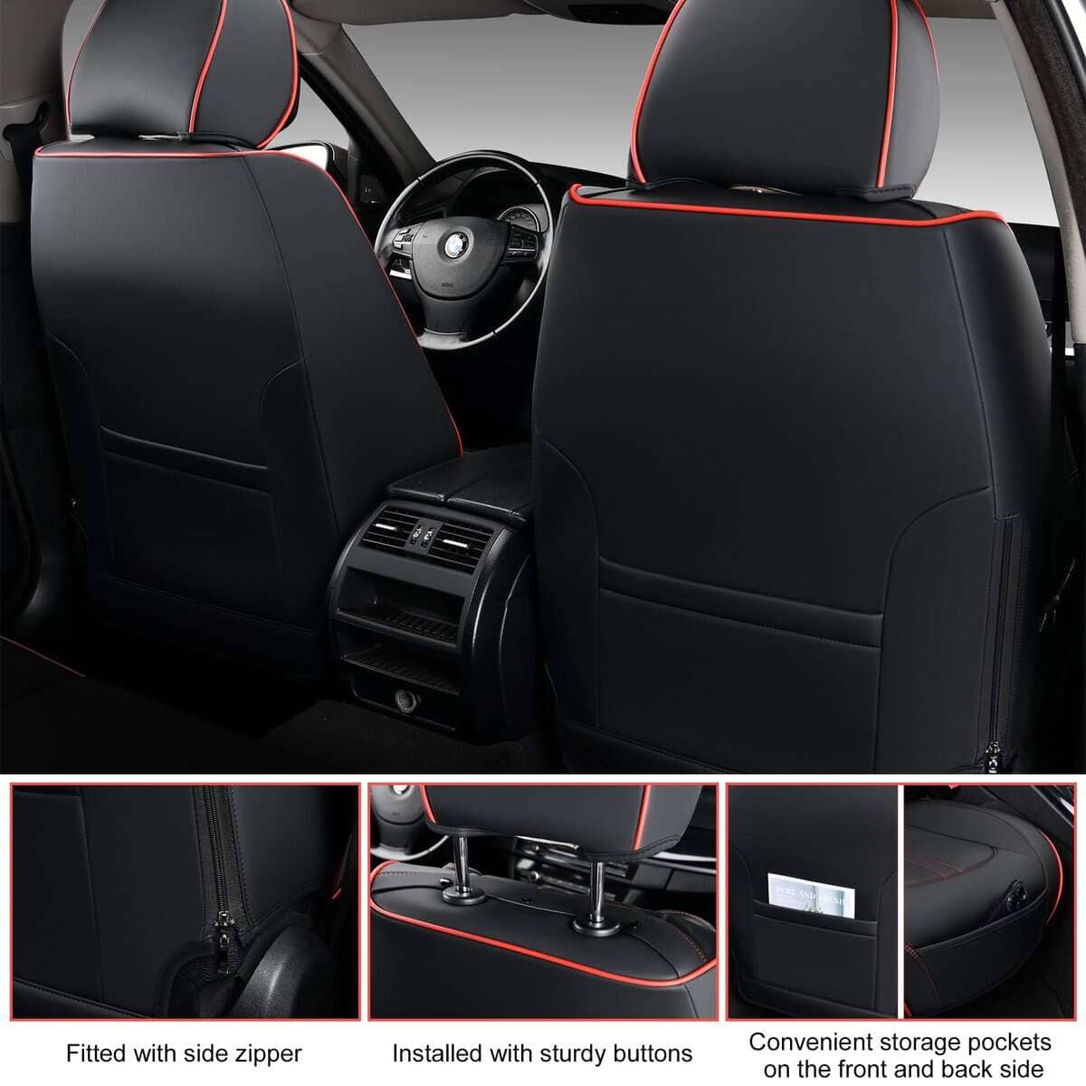 3. Diseño Único: El diseño de botón superior y cremallera lateral te ayuda con un ajuste fácil e instalación rápida. Los asientos delanteros tienen bolsillos de almacenamiento en los lados delantero y trasero. Compatible con airbags y cinturones de seguridad, manteniendo intacta la función del asiento. Puntos de silicona antideslizantes en la parte trasera para mantener el cojín en su lugar al entrar y salir del asiento.