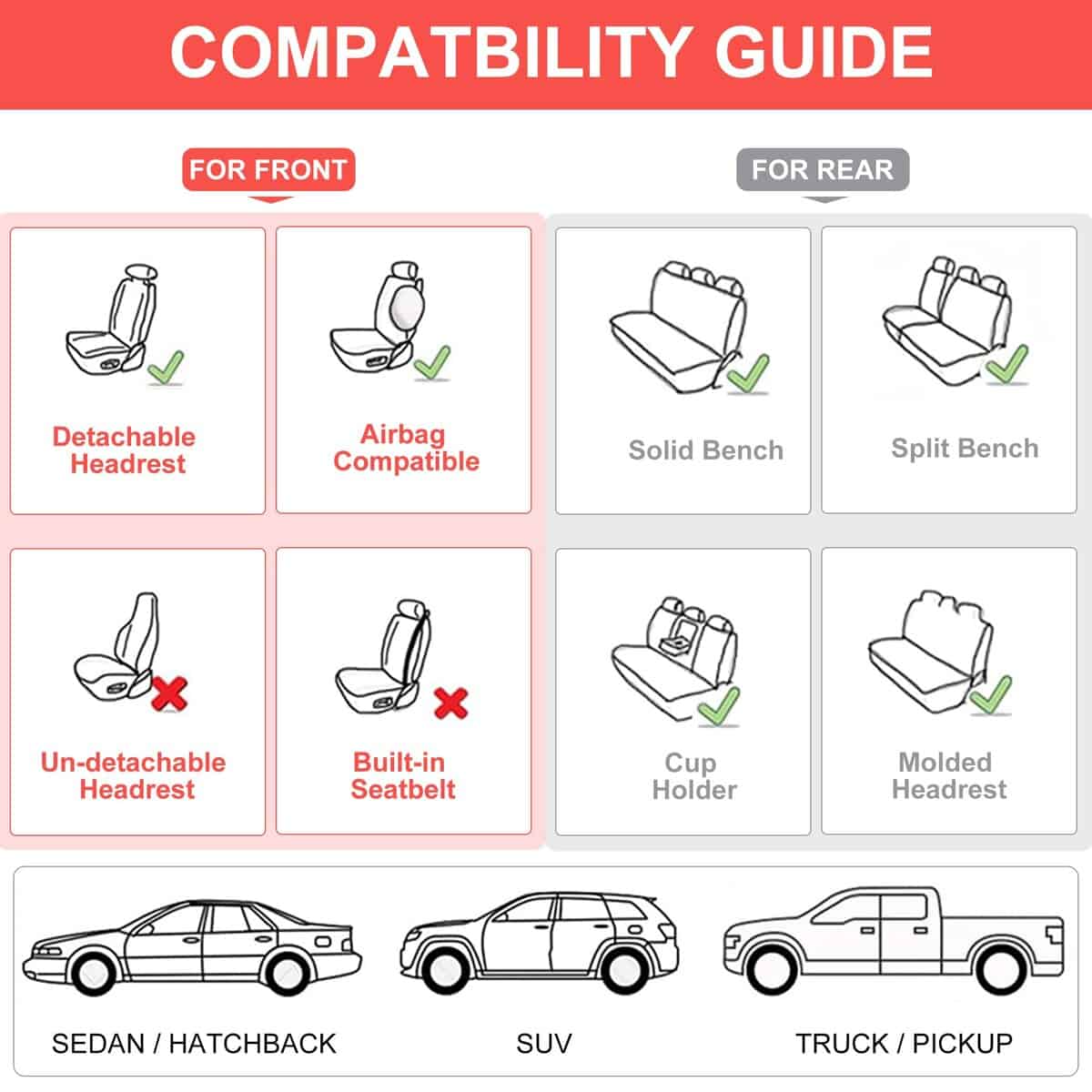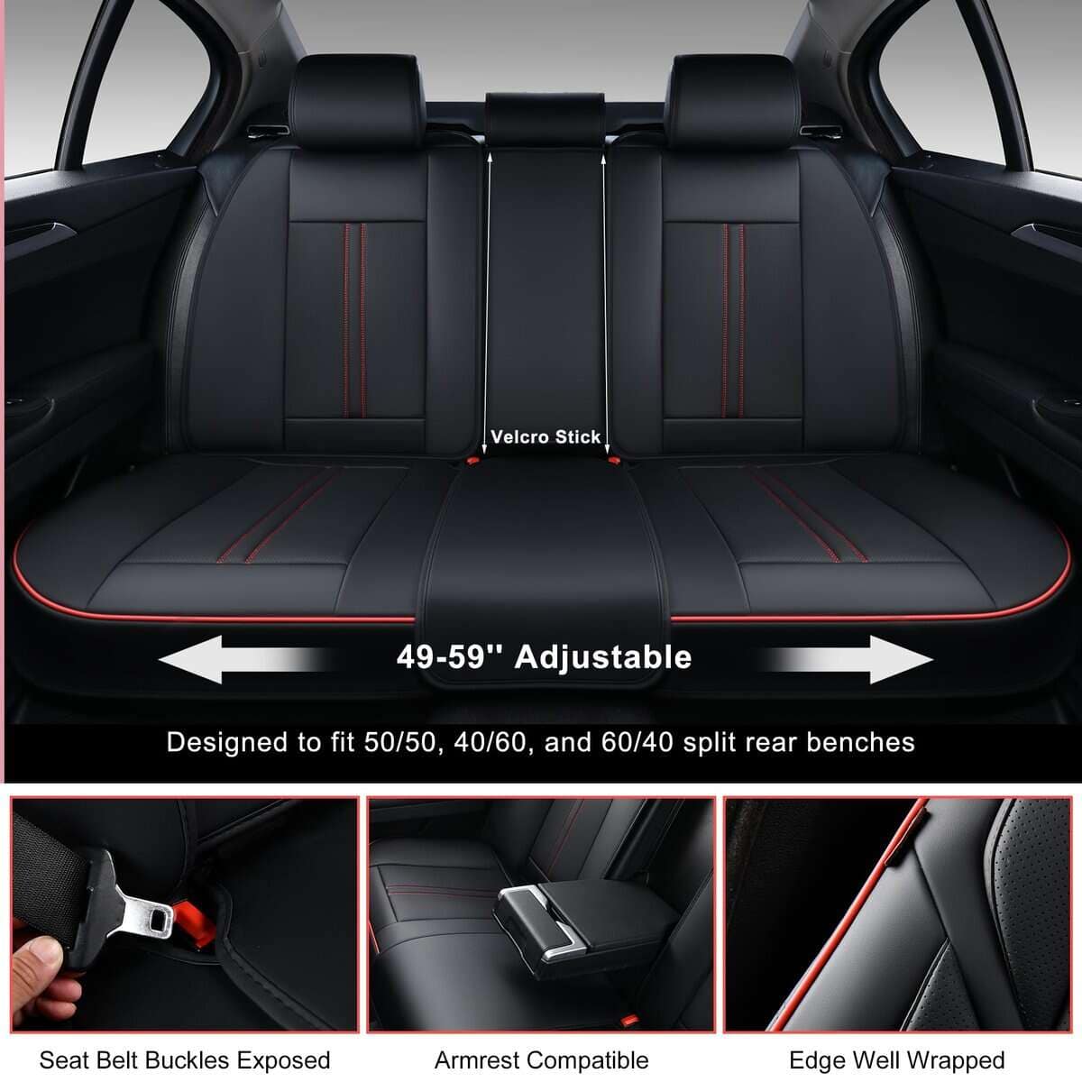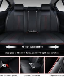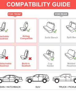 4. Fácil de Instalar: Cada paquete viene con cubiertas de asiento de automóvil de juego completo (cubiertas de asientos delanteros y traseros), una bolsa de hardware con ganchos y chavetas, y un manual de instalación. Diseñadas para adaptarse a bancos traseros divididos 50/50, 40/60 y 60/40. Por favor, confirma que el ancho de los asientos traseros es menor a 56 pulgadas antes de comprar.