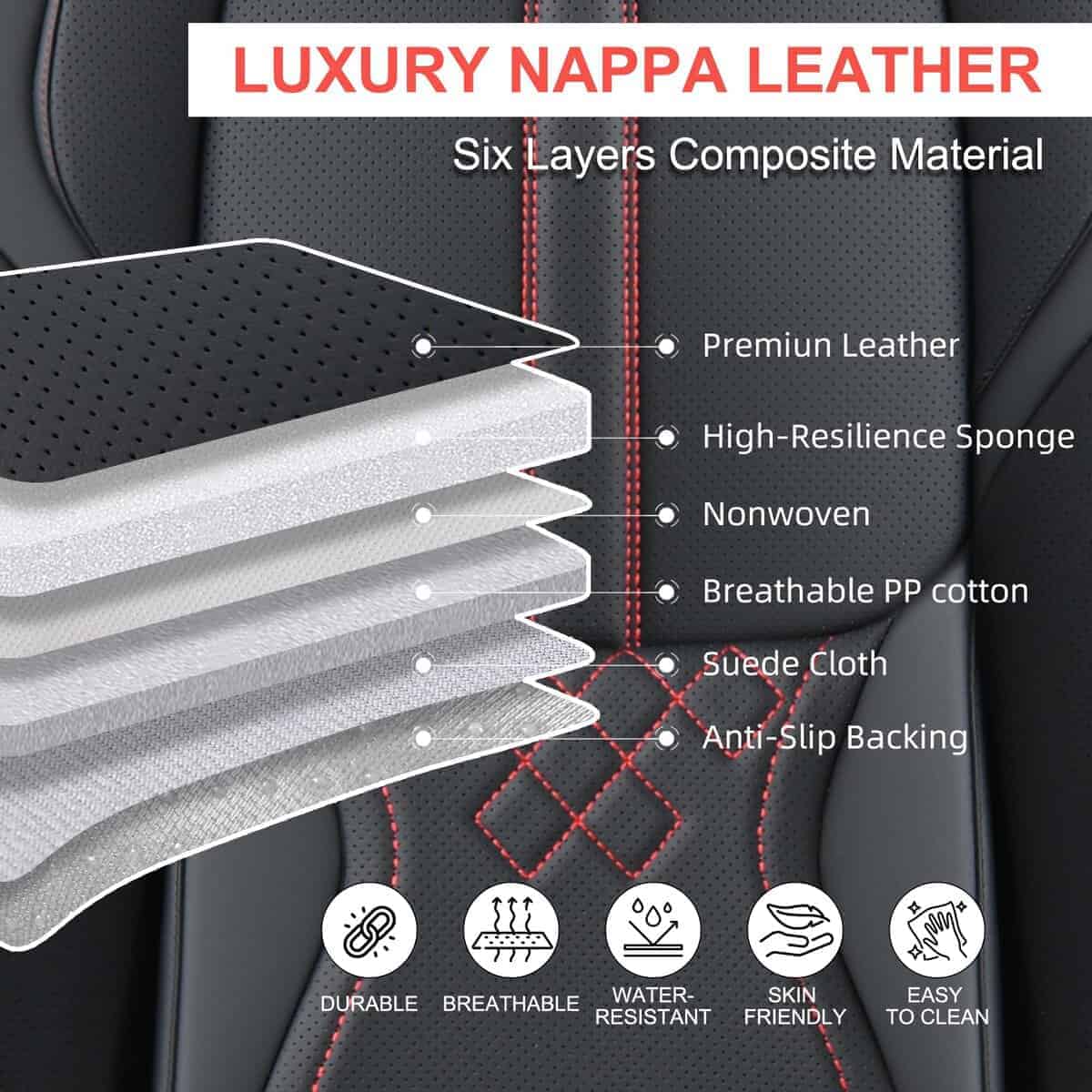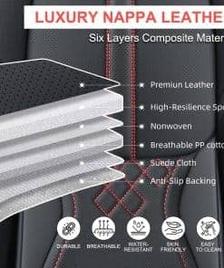 1. Cubiertas de Asiento de Cuero: Las cubiertas de asiento de automóvil BWTJF están hechas de cuero Nappa compuesto, seis capas de diferentes materiales para crear una máxima comodidad durante tu conducción. Ofrecen protección completa, dando a los asientos originales un aspecto nuevo.