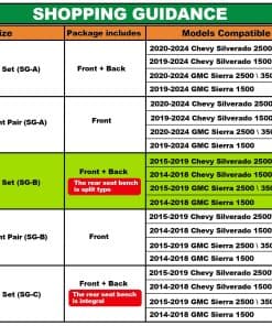 1. Juego Completo (SG-B) SOLO se ajusta a los siguientes camiones 2014-2018 Chevy Silverado. 2014-2018 GMC Sierra 1500. 2015-2019 GMC Sierra 2500HD 3500HD CREW Cab. Incluyendo los acabados de Silverado a continuación: ZR2, LT, RST, WT, CUSTOM, LTZ, HIGH COUNTRY,LT Trall Boss, WORK TRUCK, CUSTOM TRAIL BOSS. Incluyendo los acabados de GMC Sierra a continuación: AT4X, AT4, SLT, BASE, DENALI, ELEVATION, SLE.