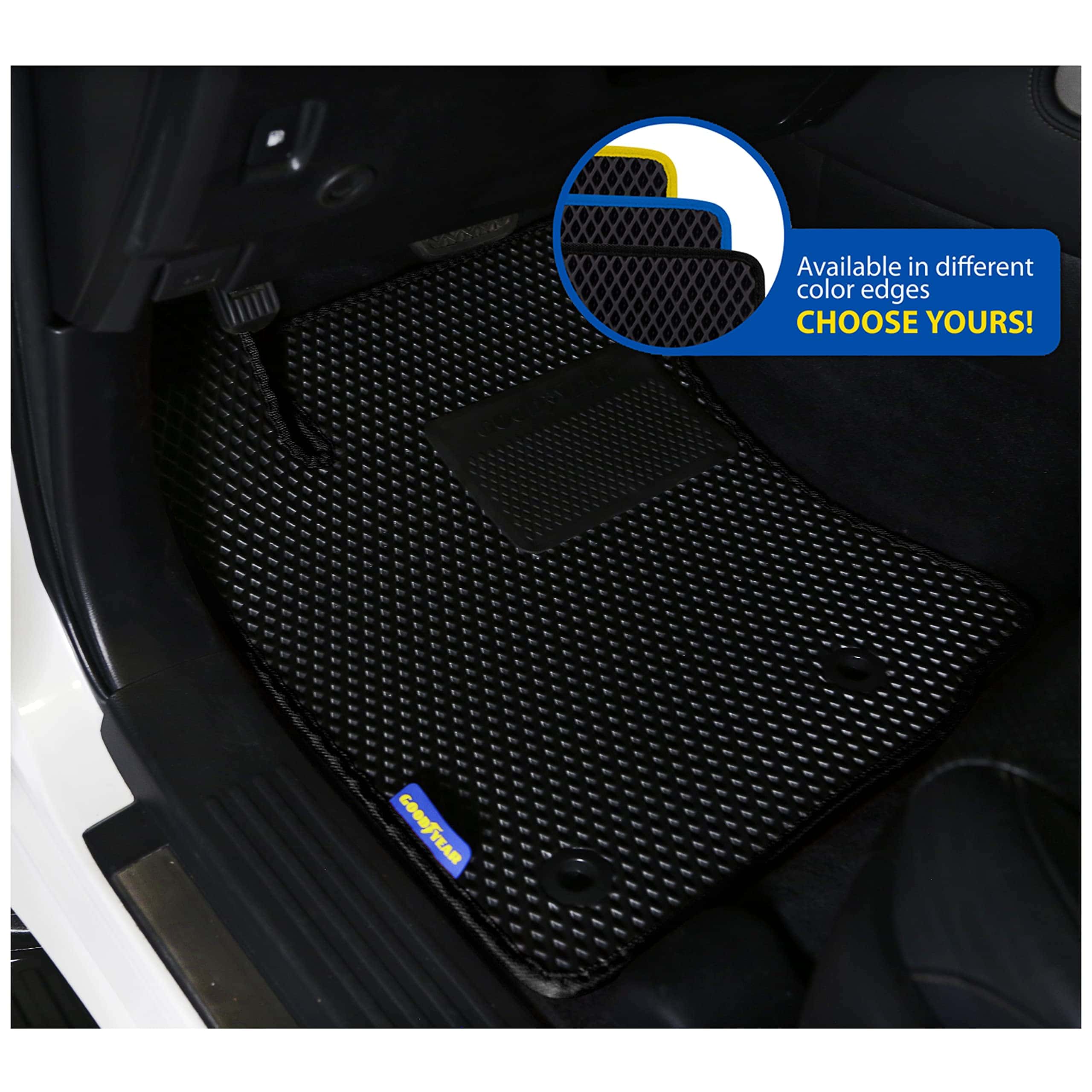 3. Durabilidad y Resiliencia Reforzadas Las cubiertas de piso de Goodyear para autos incluyen un refuerzo especial de talón termoplástico en el área de control del pedal para reducir el desgaste del piso; además cuentan con una resistencia a temperaturas de -40 F a 122 F para todo clima.