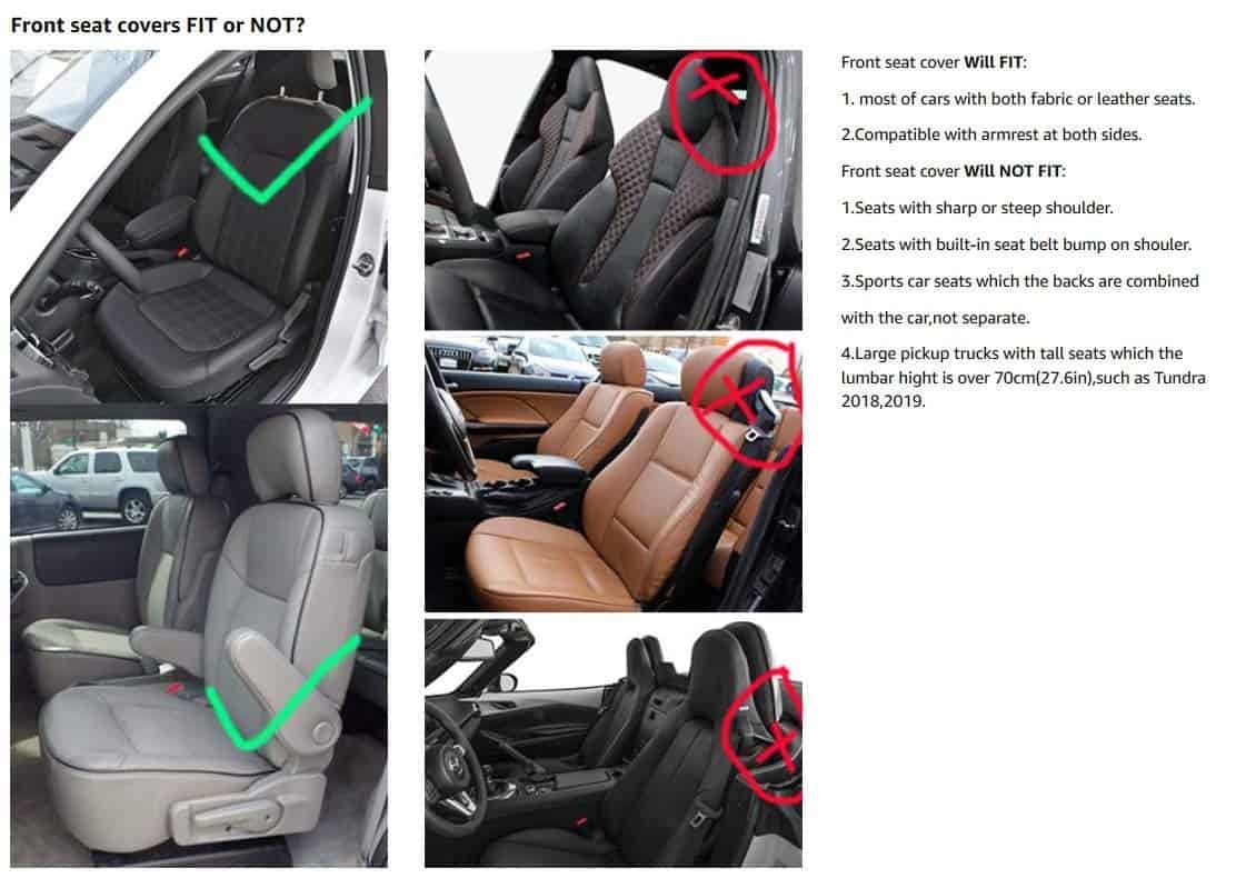 AVISO: NO ES COMPATIBLE CON UN CAMIÓN PICK-UP, UN COCHE DEPORTIVO CON 2 ASIENTOS O 4 ASIENTOS, POR FAVOR TENLO EN CUENTA. Aceptamos devoluciones y reembolsaremos si no se ajusta a tu coche, así que siéntete libre de pedirlo. Esta es una cubierta de asiento de coche universal, según nuestra experiencia de venta, es adecuada para más del 99% de los coches de 5 asientos. La cubierta de los 3 asientos traseros es desmontable (unida con cremallera), por lo que puedes reclinar el asiento trasero como de costumbre, por favor no te preocupes. La calefacción del asiento del coche, la ventilación y las funciones del airbag se pueden utilizar normalmente después de instalarlo. Somos proveedores profesionales de accesorios para coches, tenemos varias cubiertas de asientos, por favor visita nuestra tienda para encontrar más. Si tienes alguna otra pregunta sobre el producto, no dudes en contactarnos. Paquete incluido: 2 almohadas para reposacabezas 2 almohadas de apoyo para la cintura 2 cojines para el asiento delantero 2 respaldos para la fila trasera 1 cojín para el asiento de la fila trasera 1 cojín para la caja del reposabrazos trasero