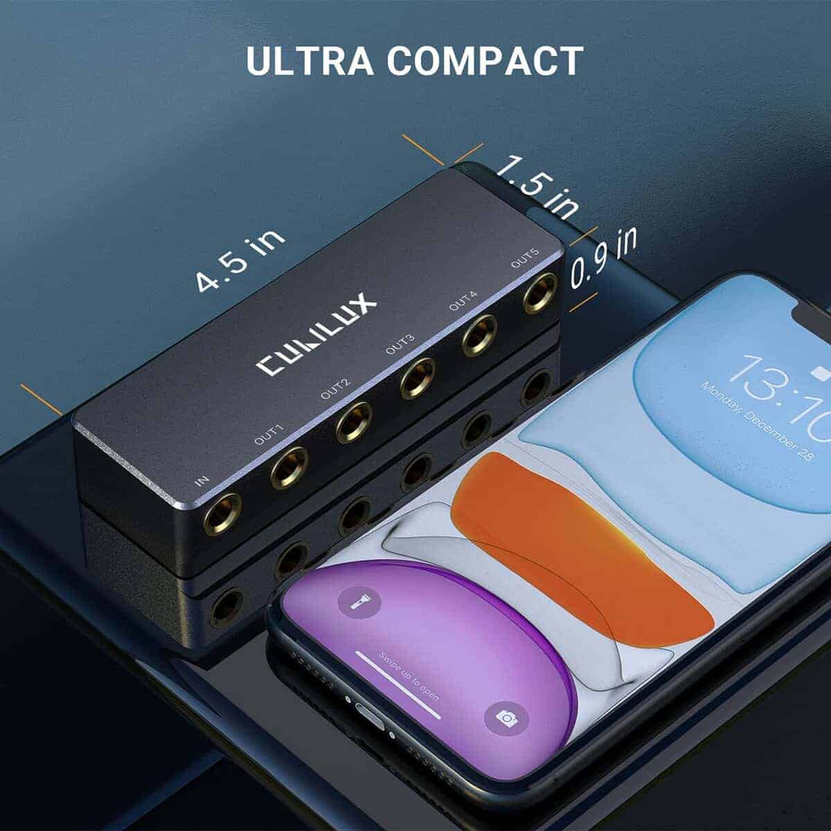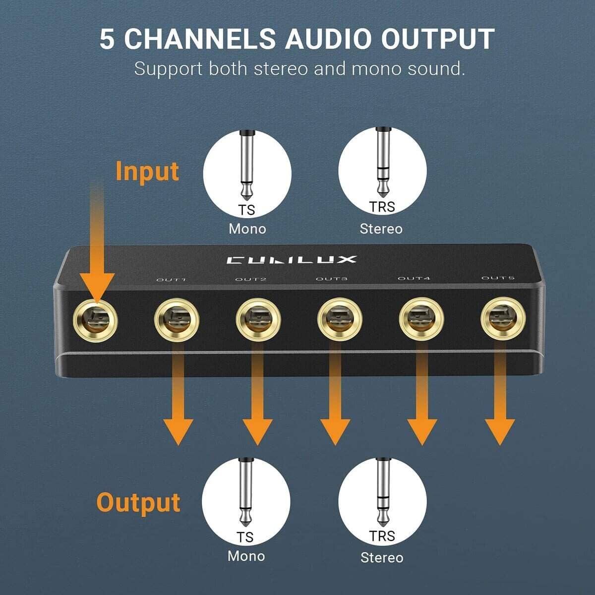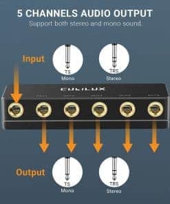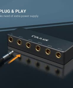 Cubilux Passive 6.35mm Headphones Splitter Box es un divisor de audio que te permite distribuir una señal de audio en modo Mono/Stereo a hasta 5 canales mediante sus 5 salidas de jacks 1/4″ TS/TRS. Con una calidad de audio superior gracias a los conectores chapados en oro que garantizan una transmisión de audio sin pérdidas, sin distorsión ni ruidos estáticos. Su cuerpo de metal completo, construido con aleación de aluminio, proporciona durabilidad y confiabilidad. Además, su diseño compacto y portátil lo hace fácil de transportar. Incluye una garantía de 12 meses ofrecida por Cubilux, que garantiza un reembolso sin problemas o un reemplazo gratuito.