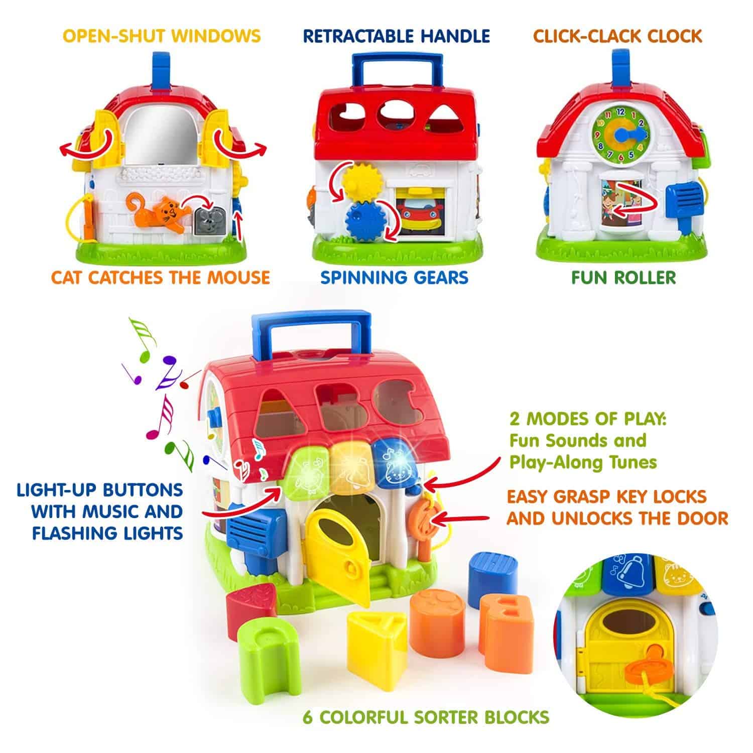 1. – CLASIFICADOR DE FORMAS PARA NIÑOS – Con un divertido diseño de casa para bebés, 6 bloques brillantes, este clasificador de formas se adapta perfectamente a la etapa de desarrollo de los niños de aproximadamente 12 a 36 meses y mejora sus habilidades motrices finas. Cada bloque encaja en una ranura particular y puede ser recuperado a través de la puerta con cerradura.