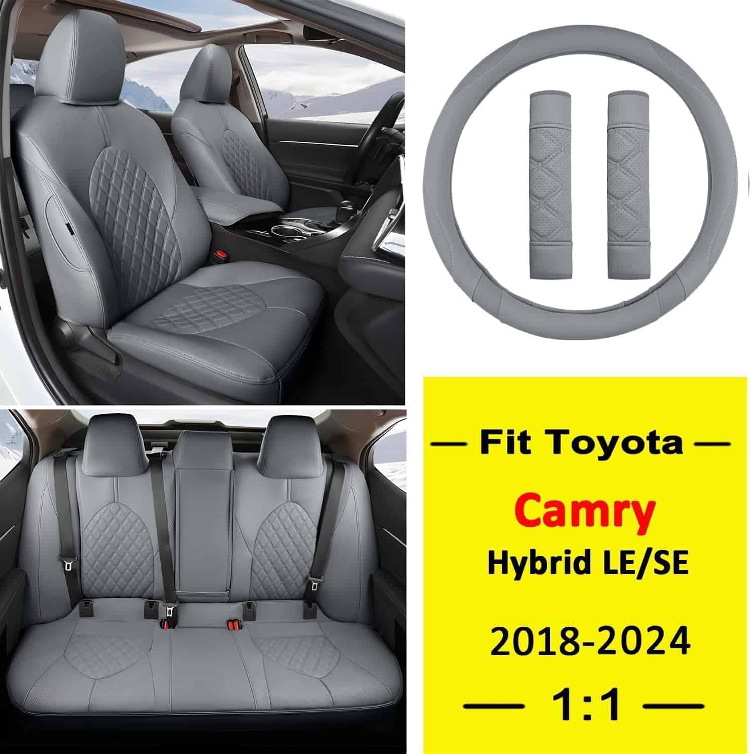 Cubre completamente personalizado para Toyota Camry Hybrid LE/SE 2018 2019 2020 2021 2022 2023 2024. Hecho de cuero suave, cómodo al tacto con buena transpirabilidad y durabilidad. Fácil de limpiar. Protege los asientos originales del desgaste, manchas y pelo de animales, dándole un nuevo aspecto al interior de tu coche. Diseño acolchado en forma de diamante con costuras decorativas, elegante y de calidad. Incluye video de instrucciones de instalación para facilitar el proceso y asegurar un ajuste seguro.