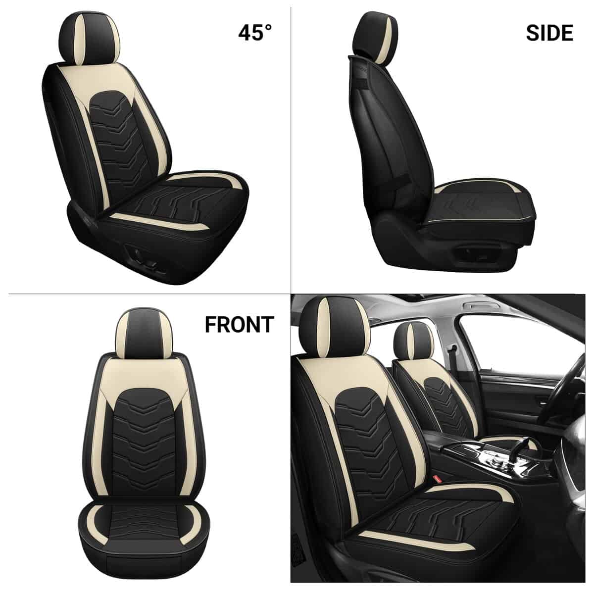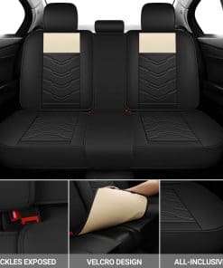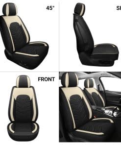 1. AJUSTE UNIVERSAL Los cubre asientos delanteros se adaptan a la mayoría de los asientos con reposacabezas removibles y son compatibles con reposabrazos. La cubierta del asiento trasero está conectada con velcro, y el ancho de la cubierta del asiento del banco se puede ajustar en el rango de 50-56 pulgadas. El diseño universal se adapta a la mayoría de los sedanes, SUVs y camionetas. Para algunos cupés de 2 puertas y camionetas, las cubiertas de los asientos delanteros se pueden comprar por separado.