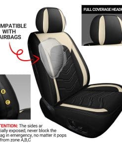 4. COMPATIBLE CON AIRBAG Las cubiertas de los asientos delanteros tienen correas elásticas en los lados, dejando mucho espacio para los airbags. Las cubiertas de los asientos son compatibles con las hebillas de cinturón de seguridad. La cubierta del asiento delantero tiene un bolsillo frontal para teléfono y billetera, y bolsillos traseros para tableta y libros. Después de instalar la cubierta del asiento, se mantiene la seguridad y capacidad de almacenamiento originales del asiento.