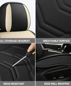 3. MATERIAL DE ALTA CALIDAD La cubierta del asiento está hecha de cuero sintético de alta calidad. La superficie es resistente a los arañazos y al desgaste para proteger bien el asiento. La superficie de cuero está perforada para aumentar la transpirabilidad y evitar el sobrecalentamiento, permitiendo que la cubierta del asiento se use en todas las estaciones.