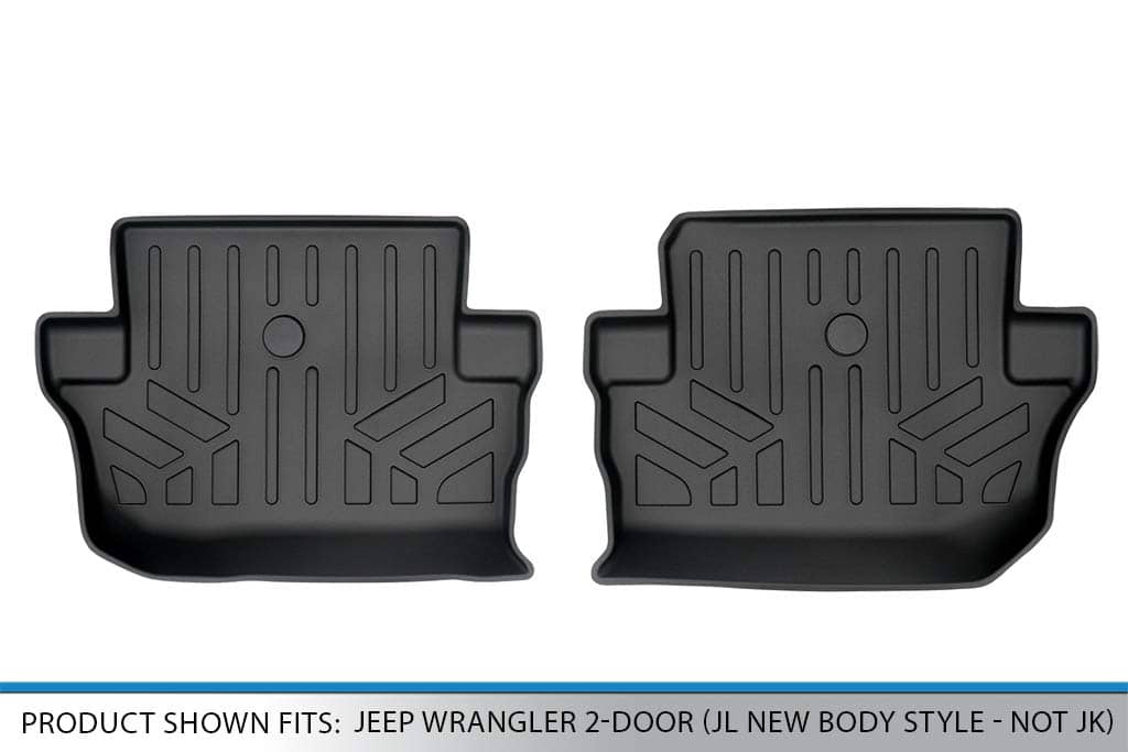 1. Solo se ajusta a modelos de 2 puertas (Estilo de Cuerpo Nuevo JL – No JK). Protección de la alfombra del vehículo con un material moldeado de baja densidad que proporciona cobertura del piso.