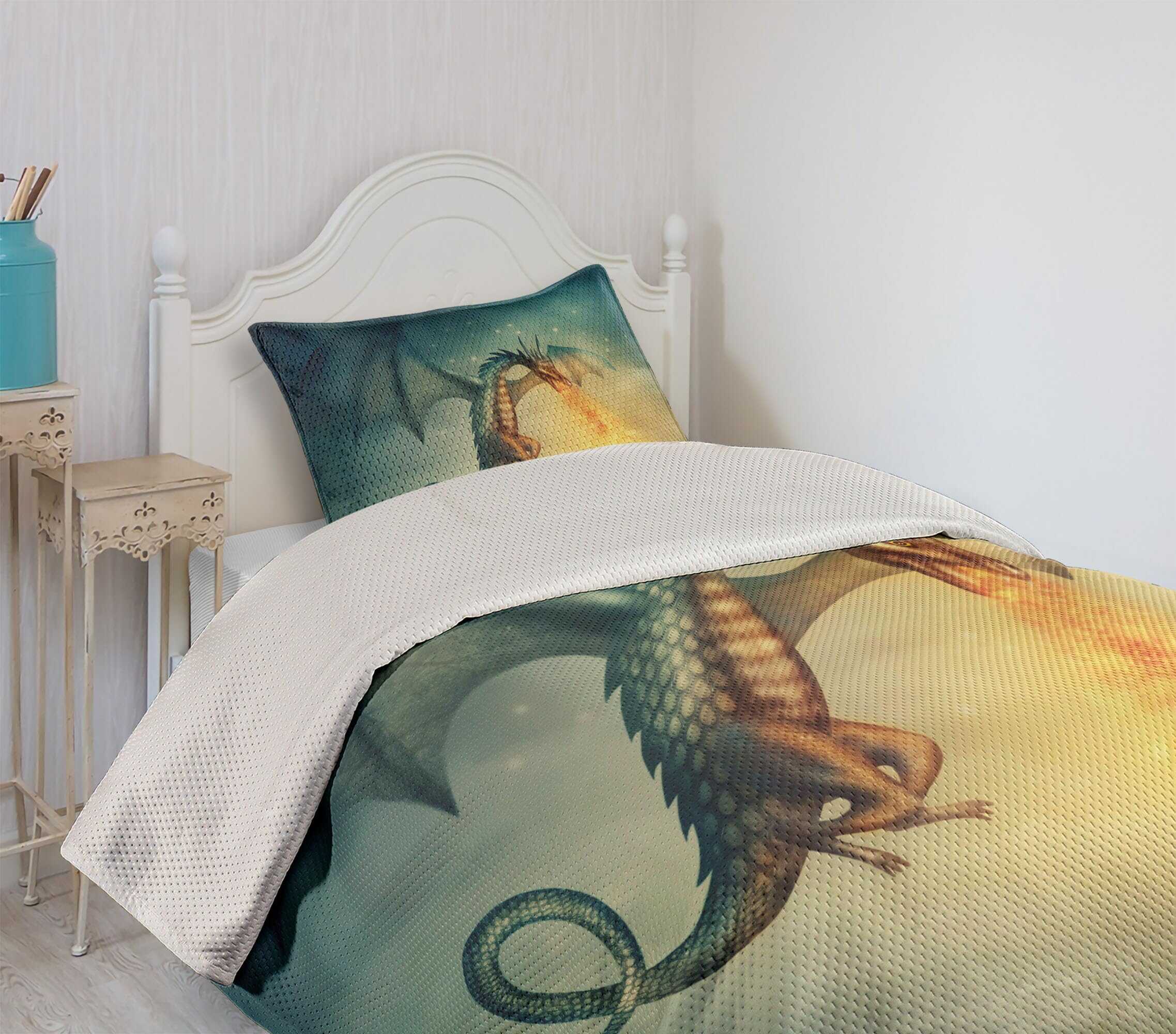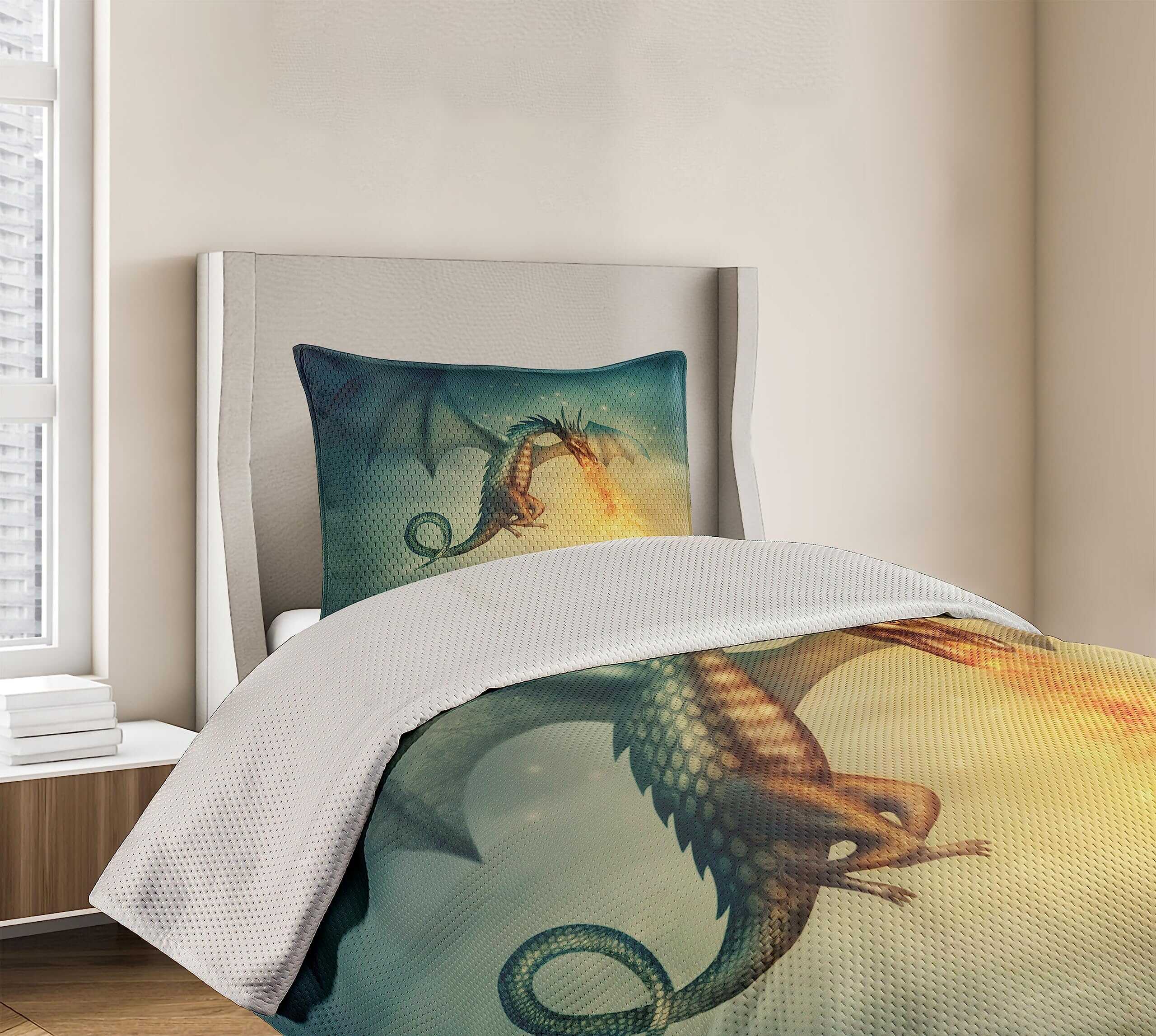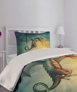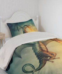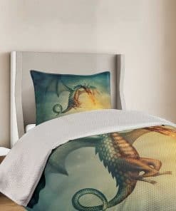 Cubrecama fantástico con diseño de dragón en el cielo, una increíble criatura imaginaria con un patrón cultural surrealista. El juego incluye 1 cubrecama y 1 funda de almohada. Hecho de poliéster suave de alta densidad de doble cepillado para una suavidad óptima y confort supremo. Resistente y pesado, no se caerá fácilmente de la cama. Puede ser usado como manta. Tecnología de tejido de alta calidad. Se puede lavar a máquina en ciclo frío, apto para secadora. Fácil planchado. No se desvanece. Excelente costura y mano de obra. Los estampados son de tecnología digital de última generación. El diseño se encuentra solo en el lado frontal de la colcha y las fundas de almohada.